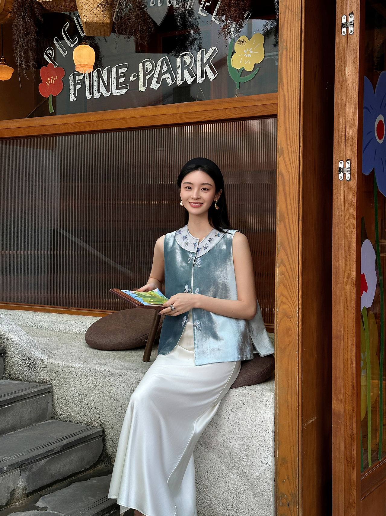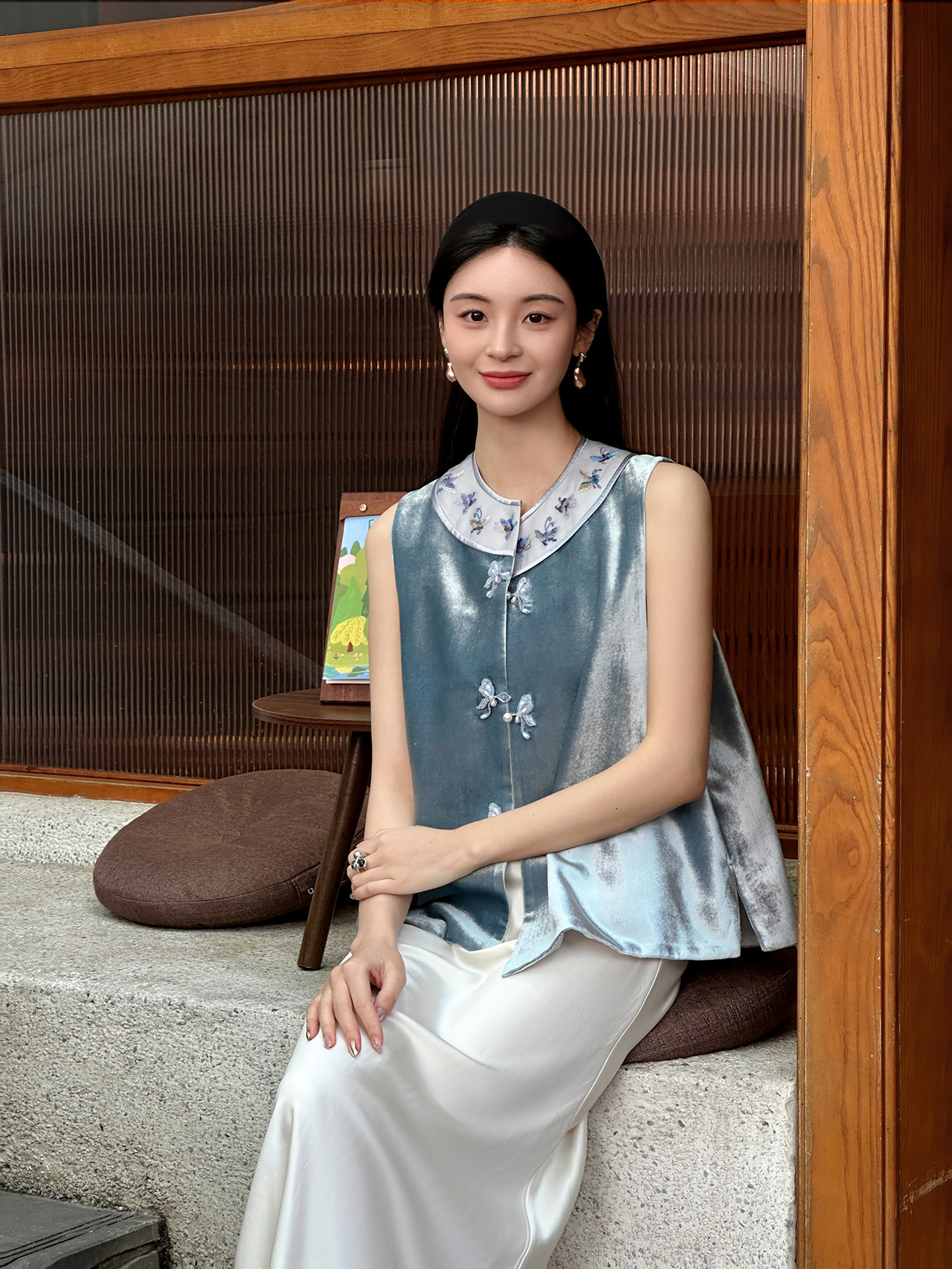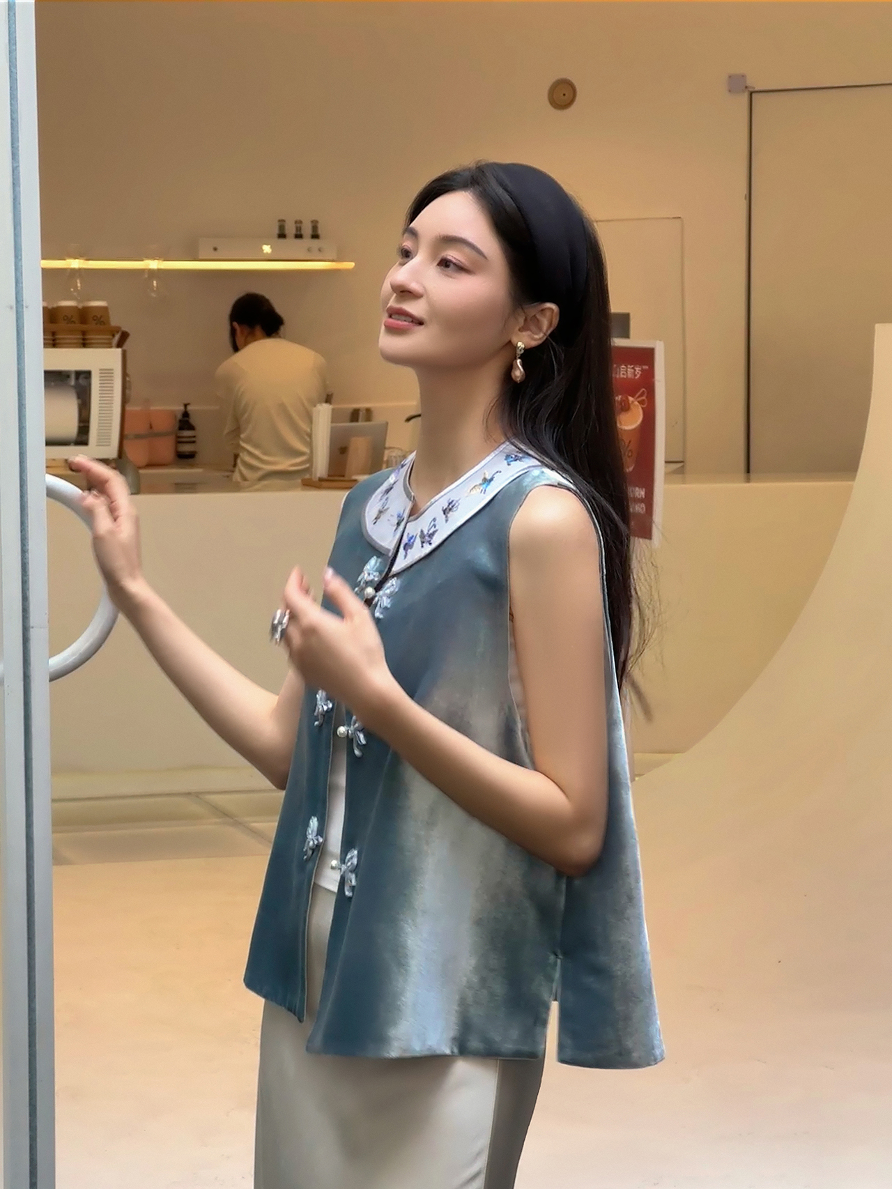 盛唐牡丹 |灰蓝色丝绒手绣对襟马甲