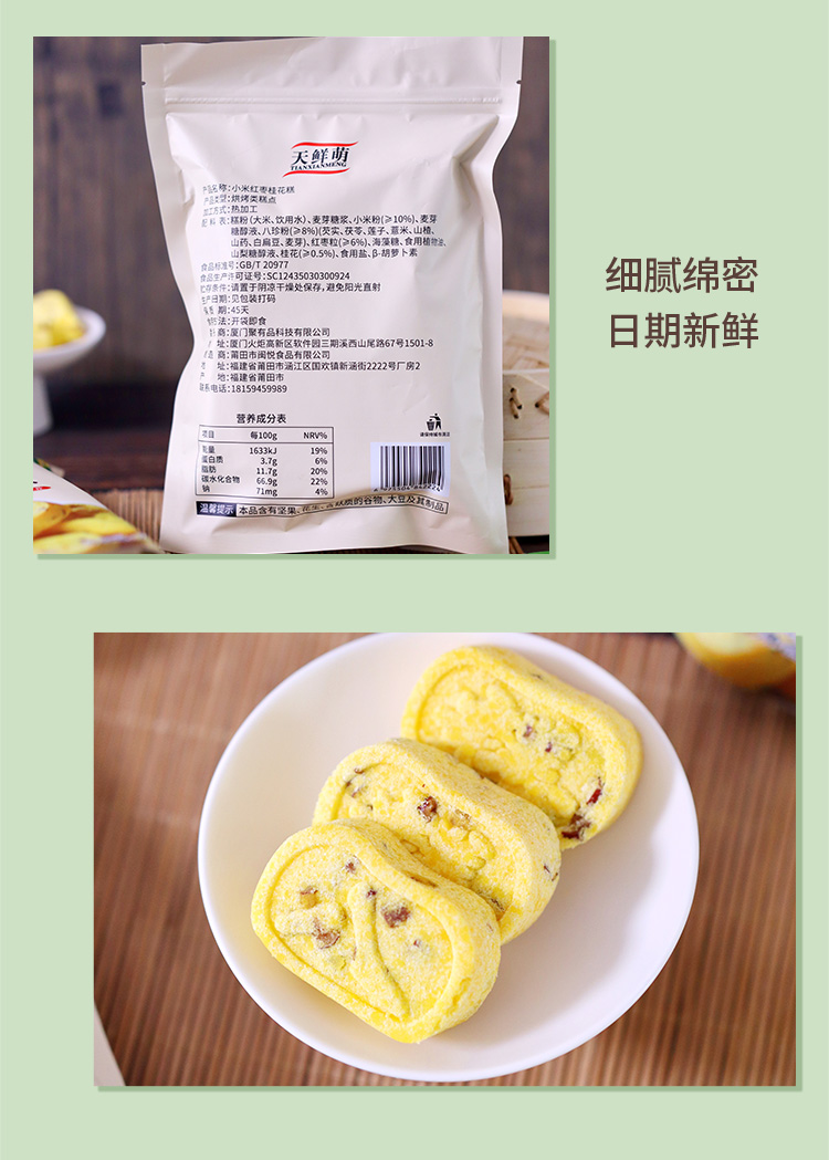 【品名】天鲜萌小米红枣桂花糕 【规格】250g*3袋 【保质期】45天 【储存方法】请置于阴凉干燥处,避免阳光直射 【产地】福建 【发货地】福建 【发货快递】圆通 【不发货区域】新疆,西藏,青海,内蒙古,宁夏,海南,港澳台地区不发 【补邮费地区】新疆、西藏+15元/件;青海、内蒙、甘肃、宁夏+3.5元/件;北京+1元/件 【发货时效】48小时,节假日顺延 |