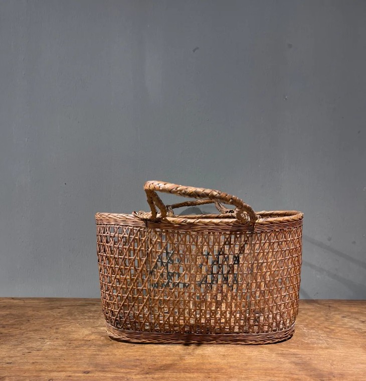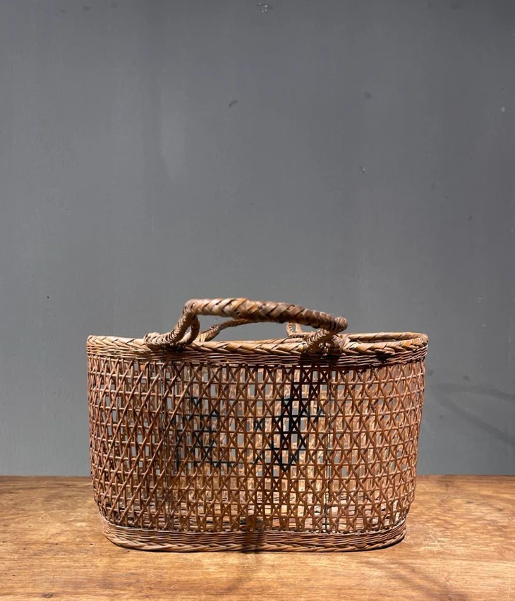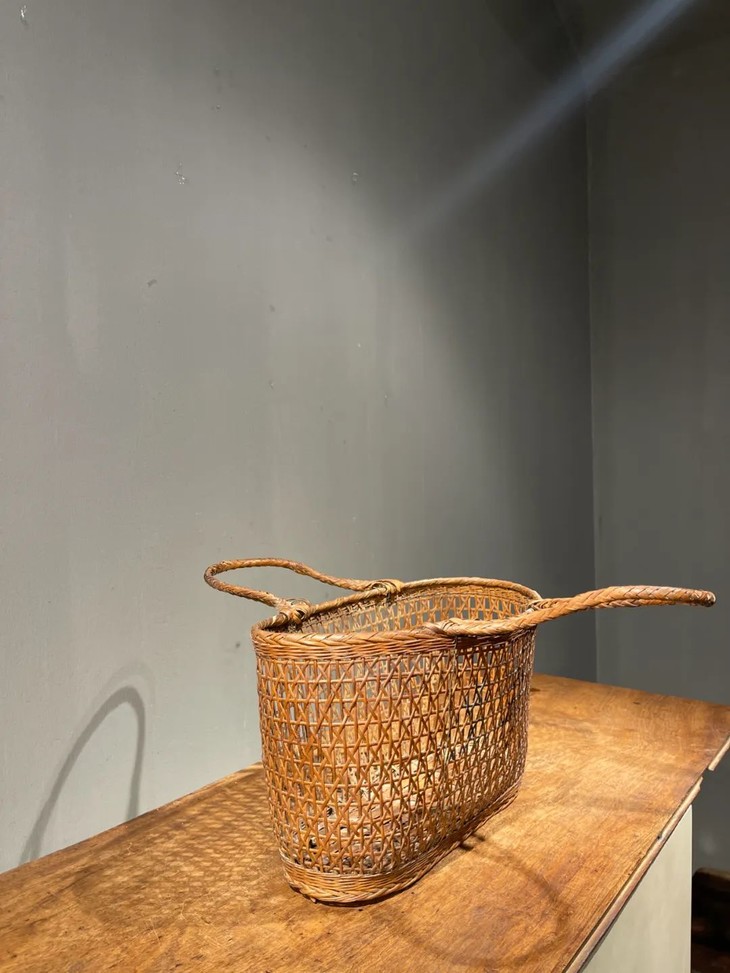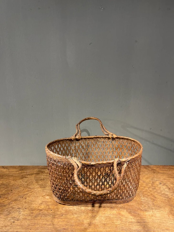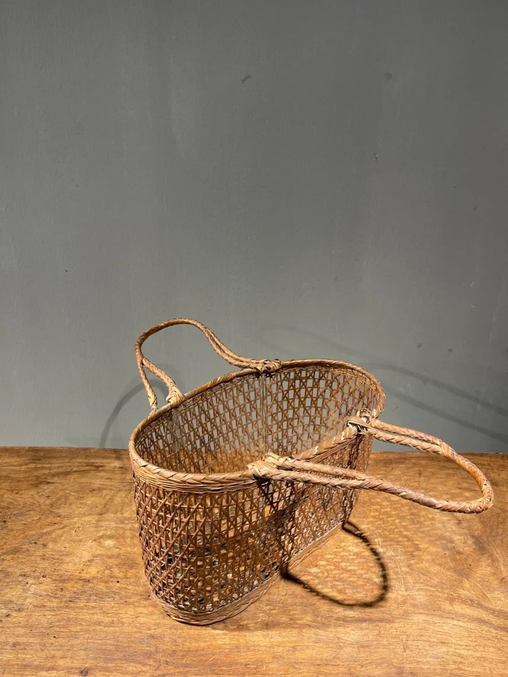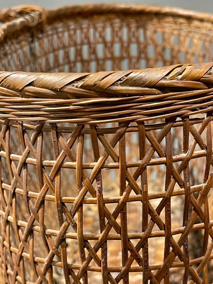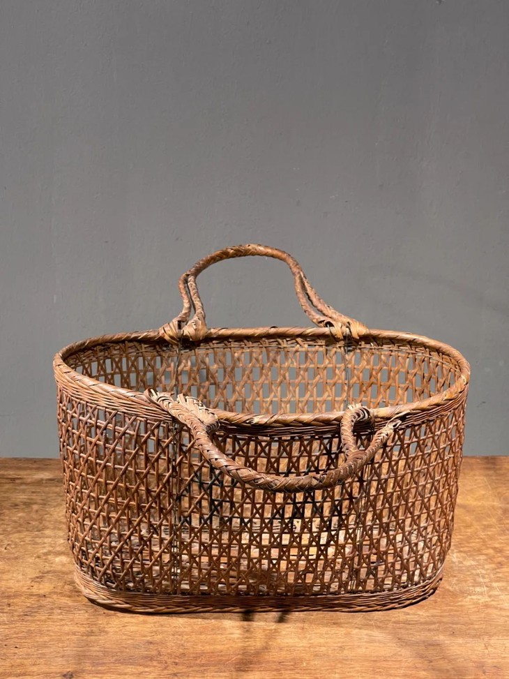 这是一件传统菜篮形式的竹编双提环菜篮,制作精美、年代久远的竹编双提环菜篮,整体设计风格简约实用且牢固,整器完全以传统竹编工艺手作编成,应是清末民的实用提物篮或是菜篮,全器逾百年之包浆皮壳渾厚温润,设计简约别致,优雅大方,气质非凡,如今可摆放于当代空间内,因其独特风格与优良之细节,可以与各种空间搭配,而且可以实用当收纳篮,也可以充当独特的花器。
