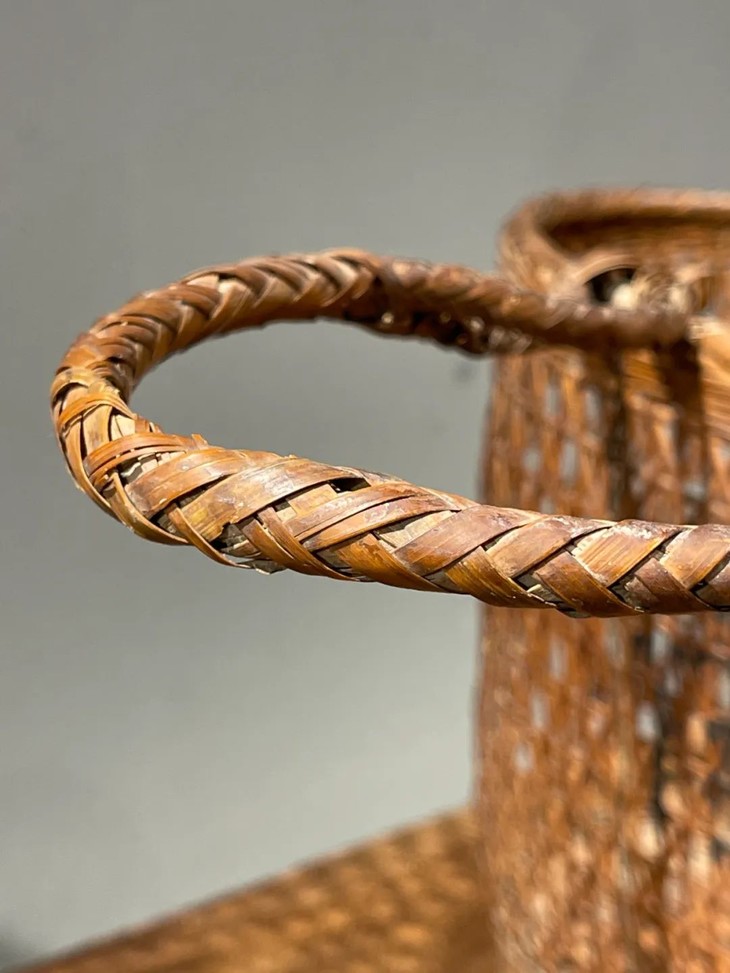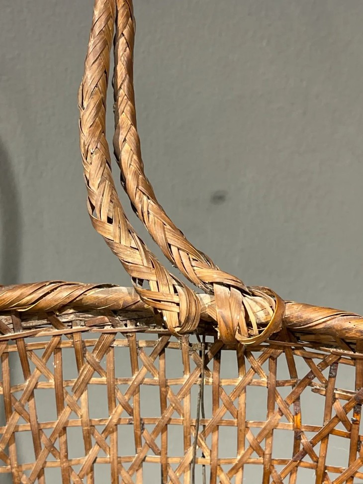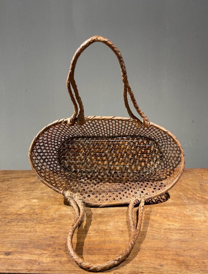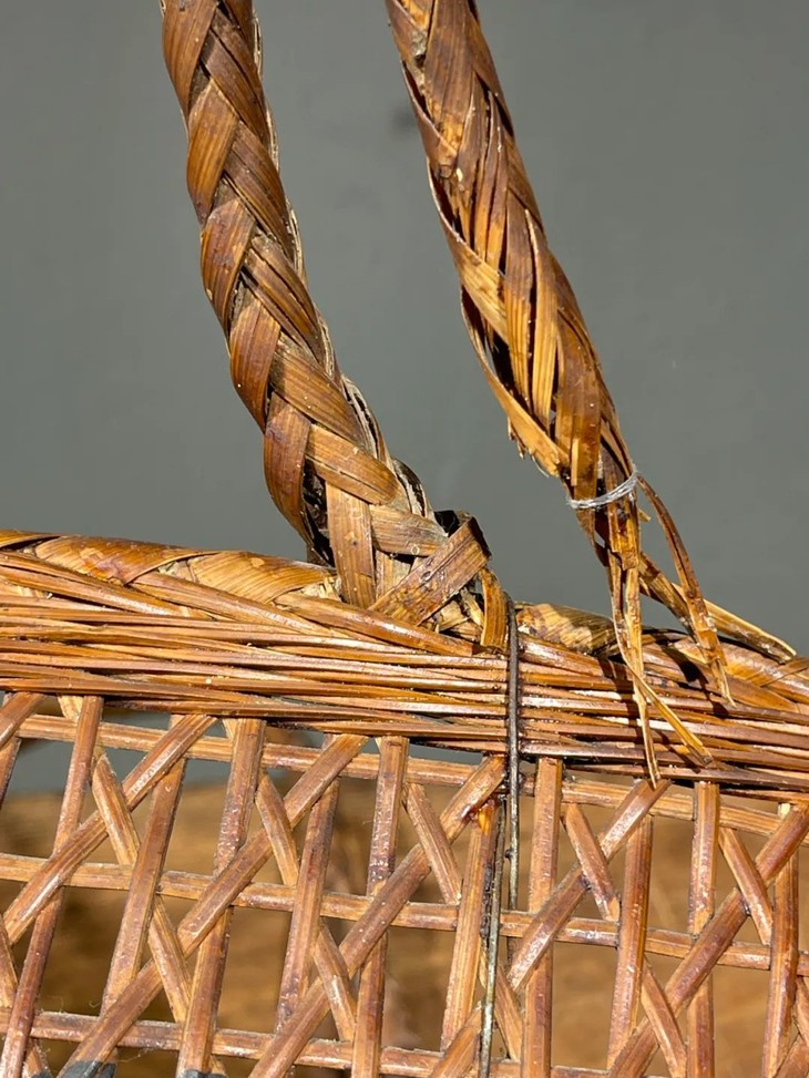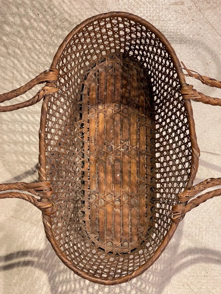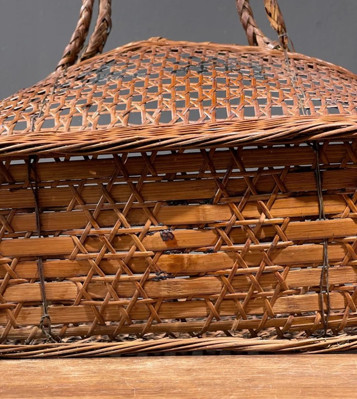 此竹编双提环菜篮,如图所示,手提部位年久失修已损坏,不能拎,容易断除,以及小部分竹条松落外,基本保存完好。