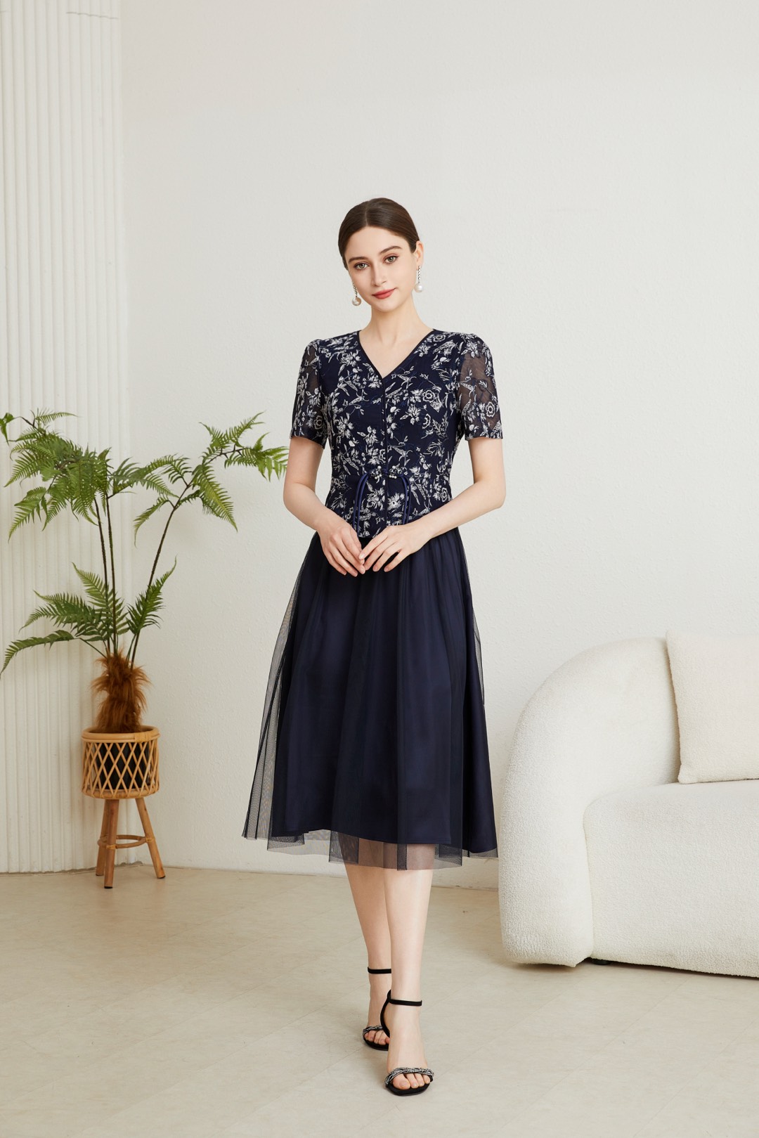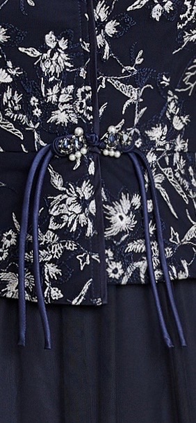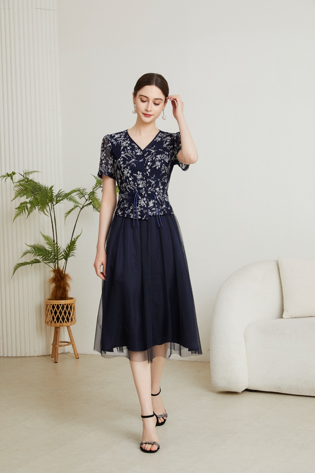 HJ1S82_绀色_连衣裙_四季_高级感V领蕾丝刺绣短袖抽绳收腰网纱大摆连衣裙_高级女装_BERNIEELEN 伯妮斯茵