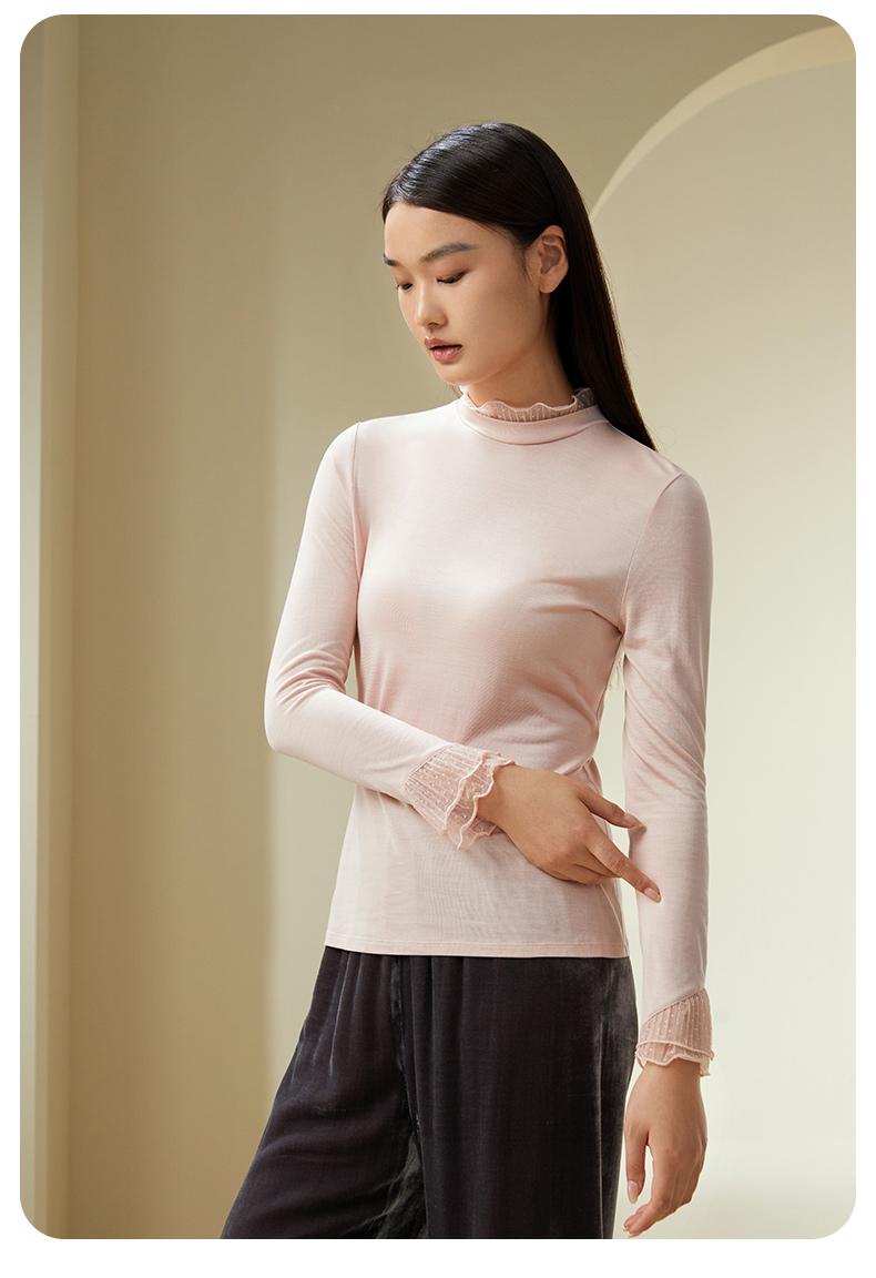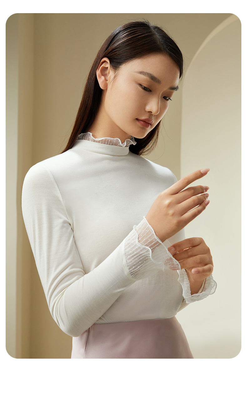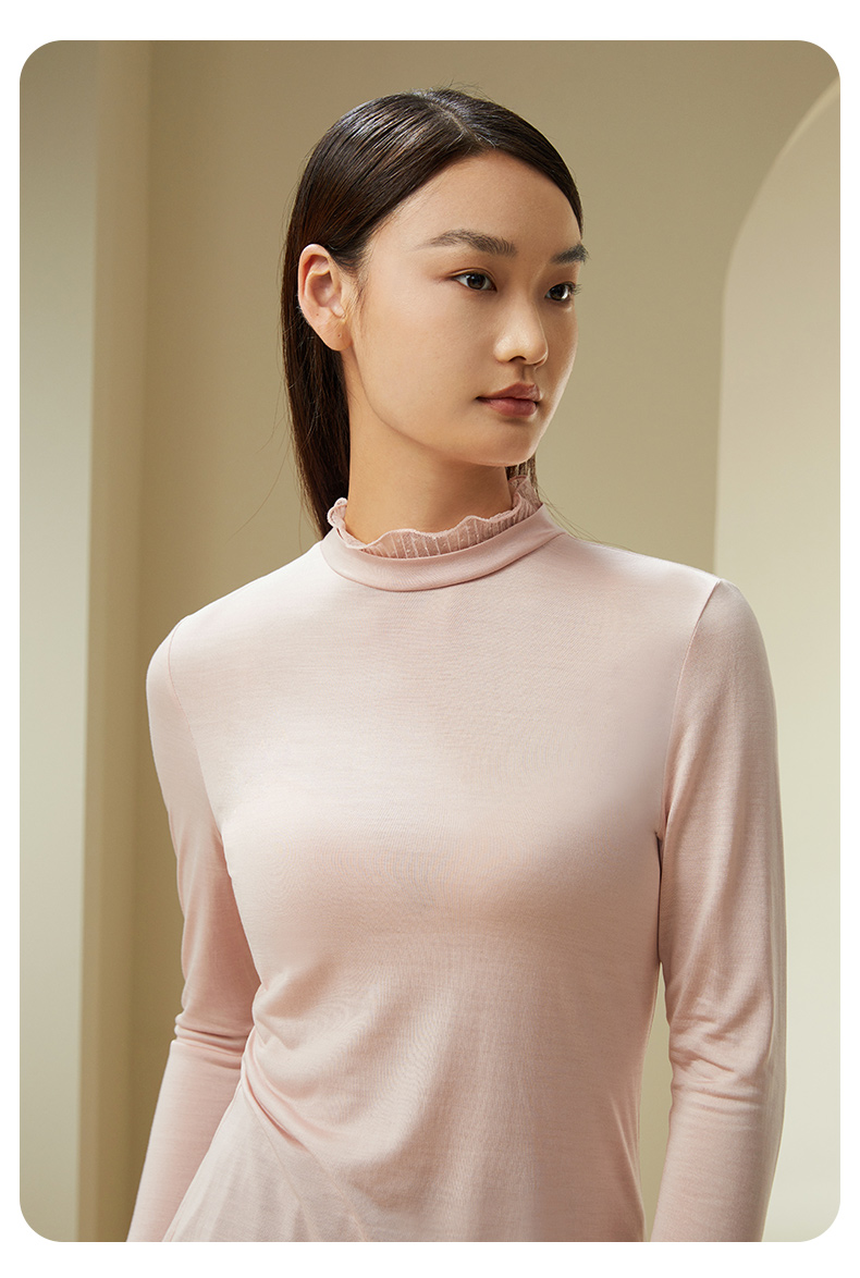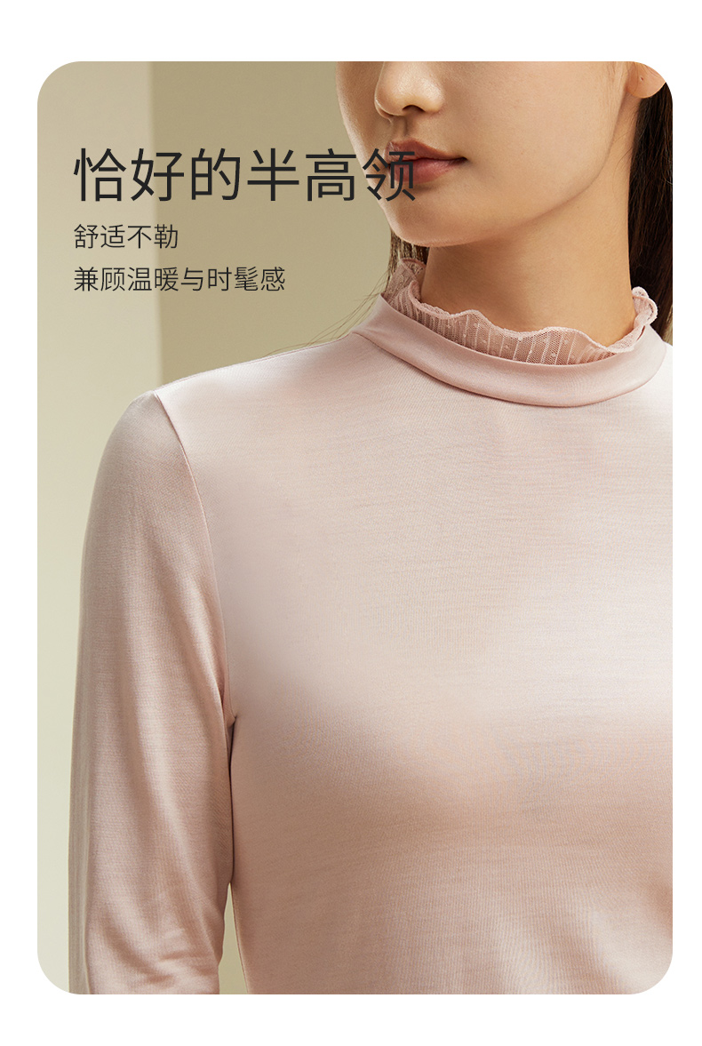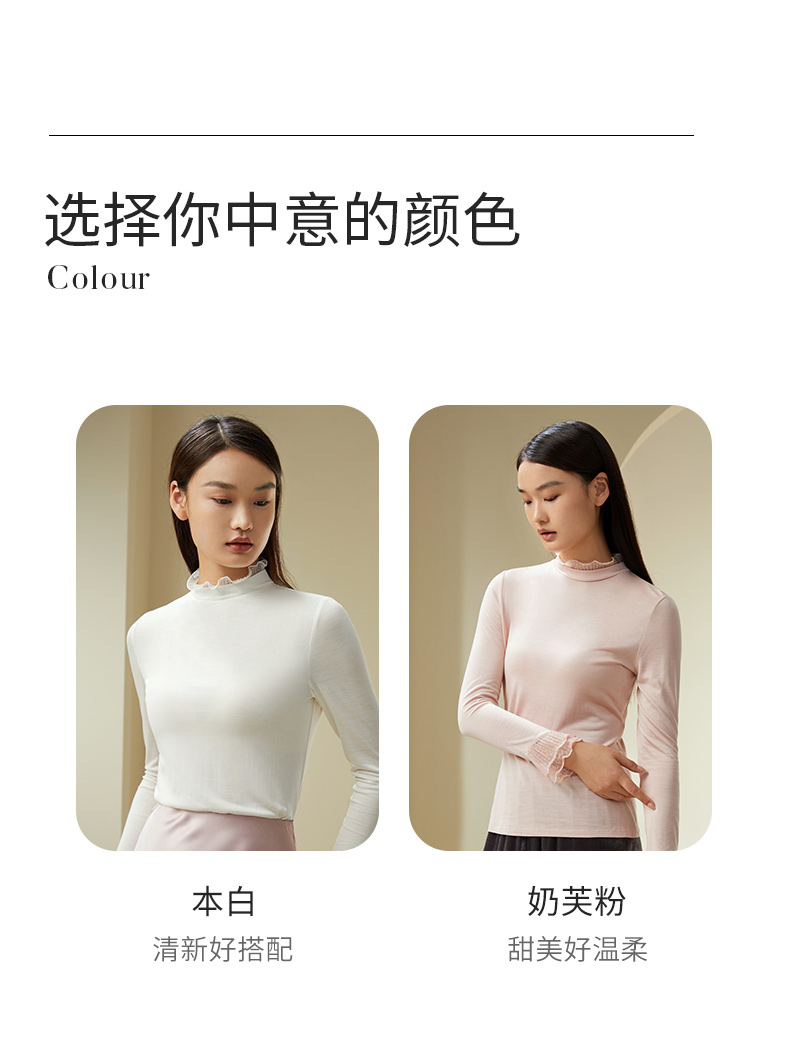 金三塔100%桑蚕丝舒适亲肤蕾丝边半高领打底衫女秋冬时尚搭配上衣 NZFDC724