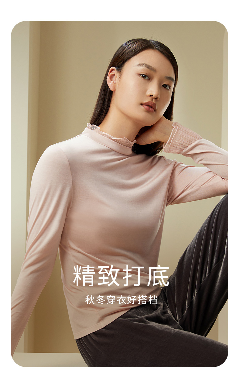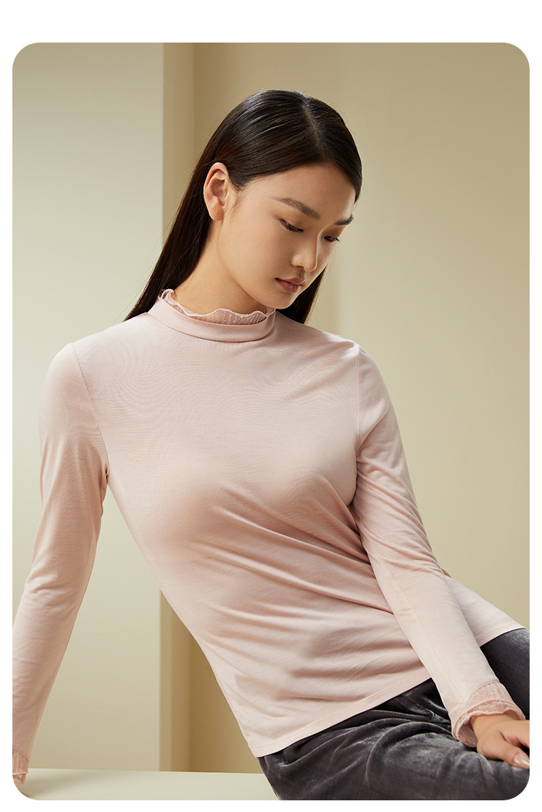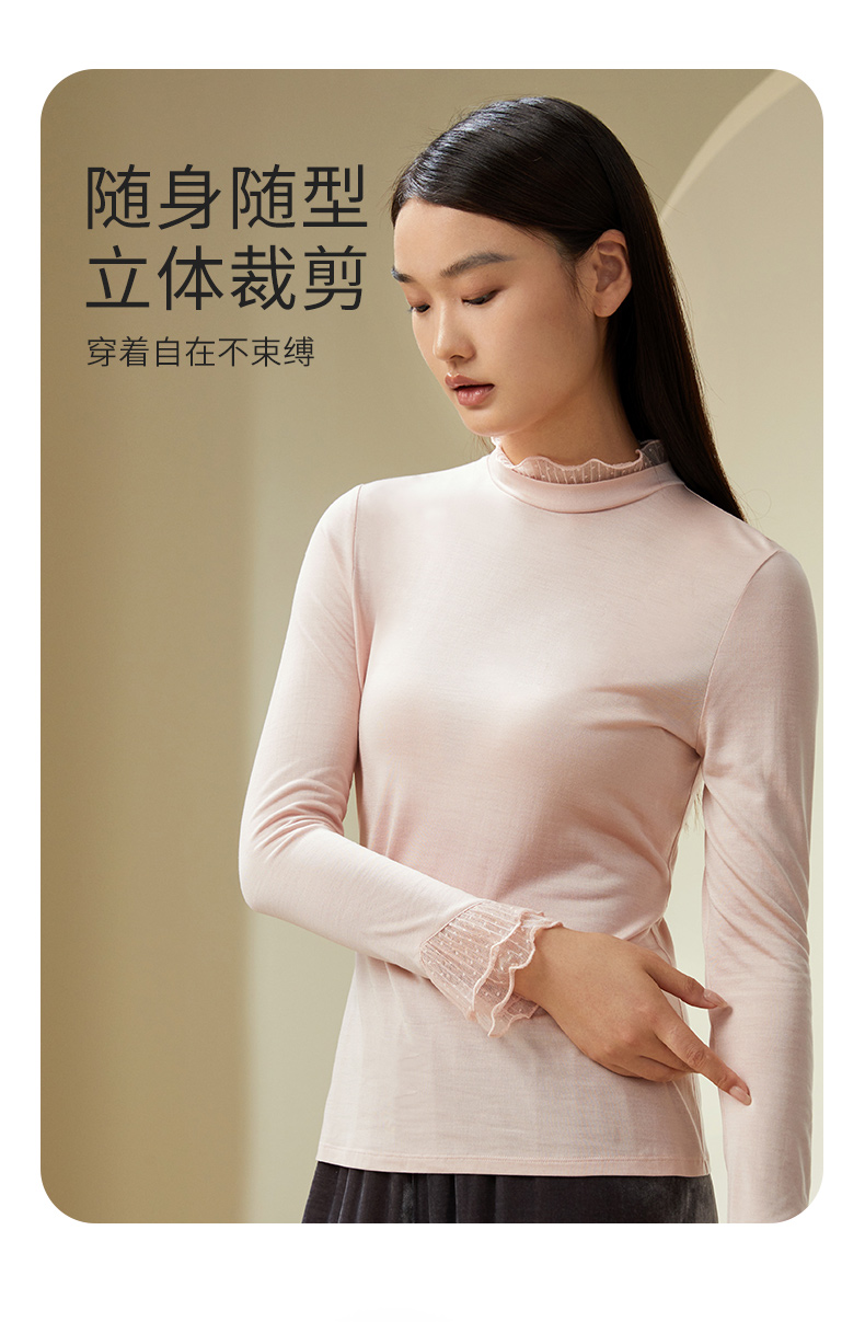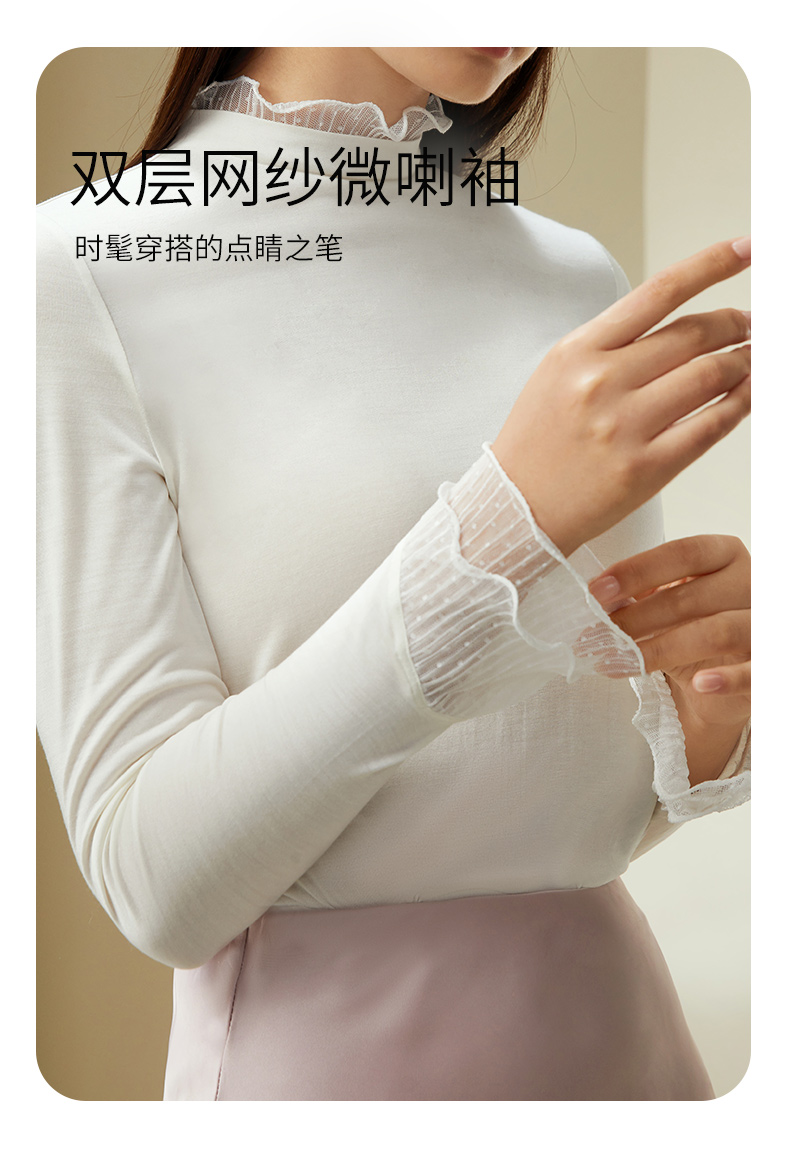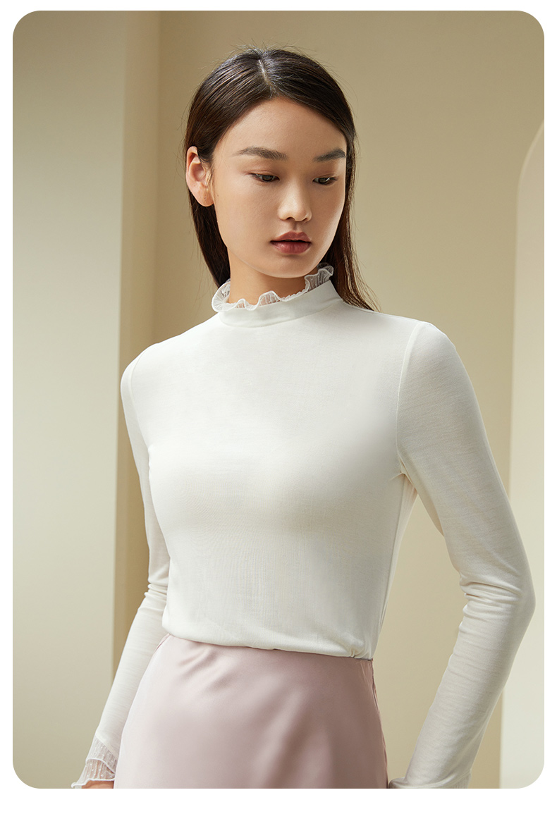 金三塔100%桑蚕丝舒适亲肤蕾丝边半高领打底衫女秋冬时尚搭配上衣 NZFDC724