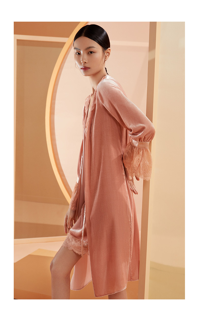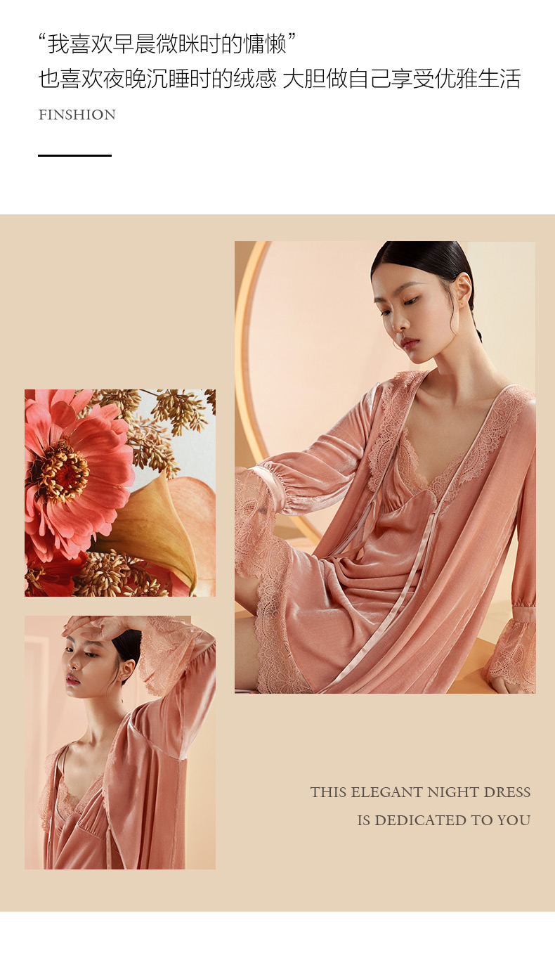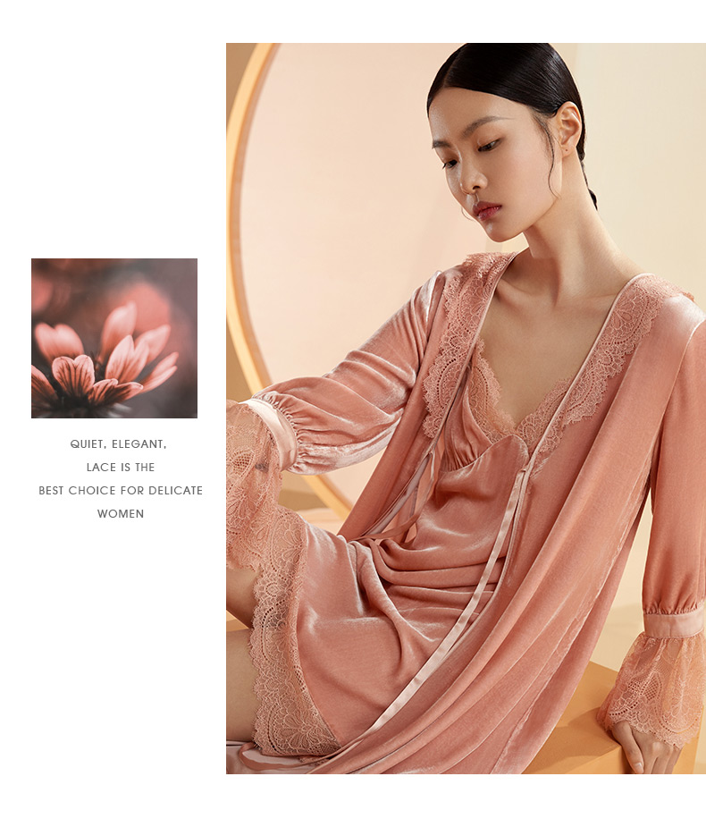 金三塔桑蚕丝丝绒晨袍秋冬女蕾丝贵族睡袍睡裙长款外穿晨袍 YSFBC108