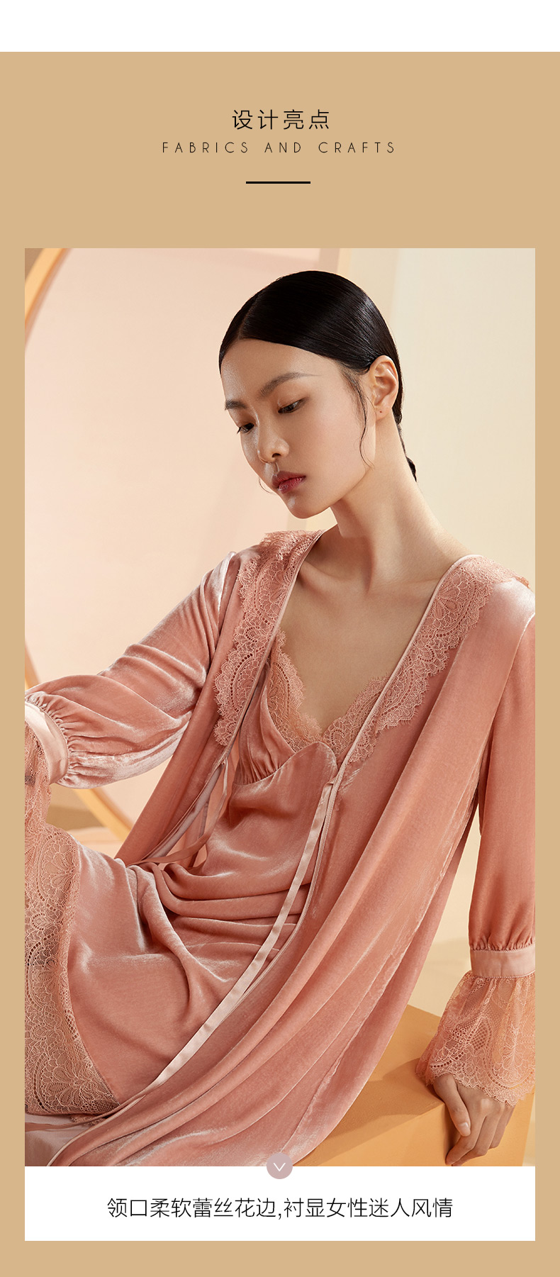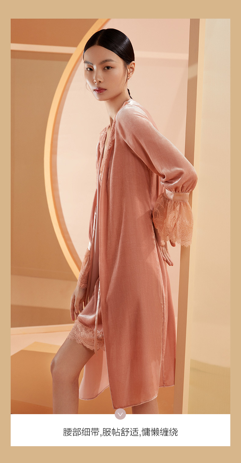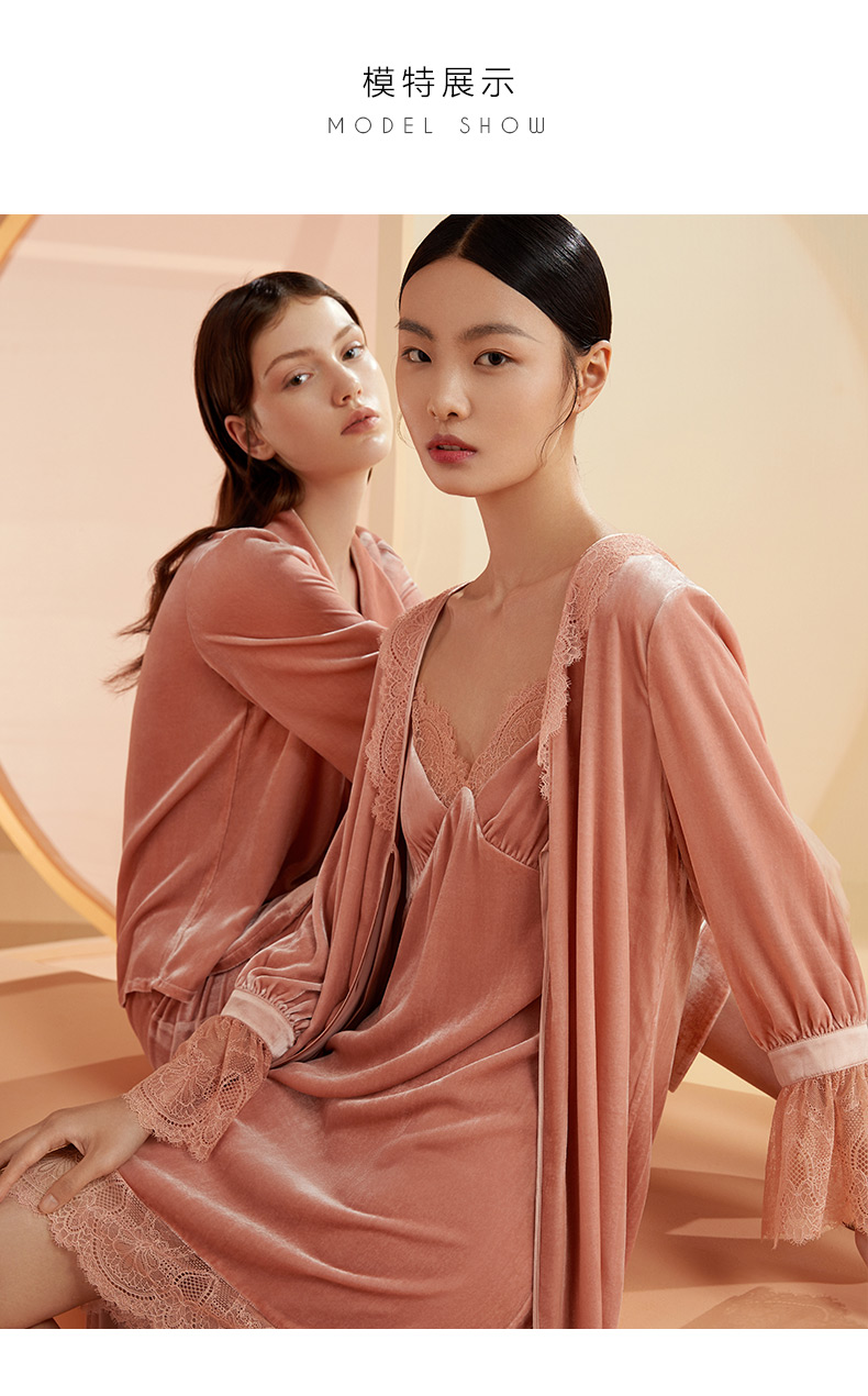 金三塔桑蚕丝丝绒晨袍秋冬女蕾丝贵族睡袍睡裙长款外穿晨袍 YSFBC108