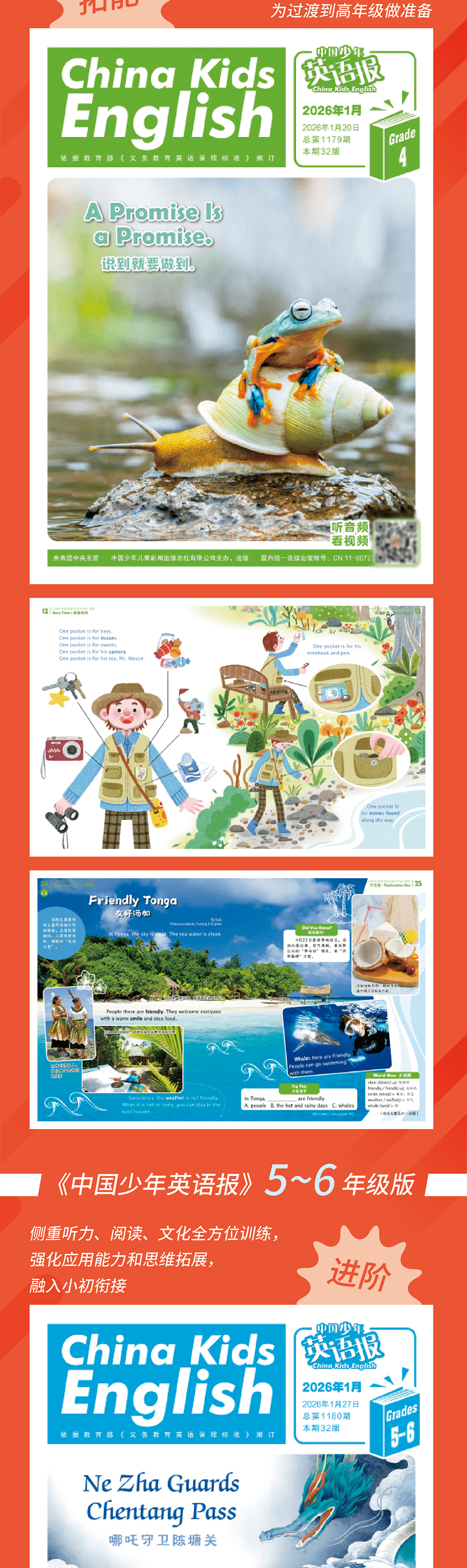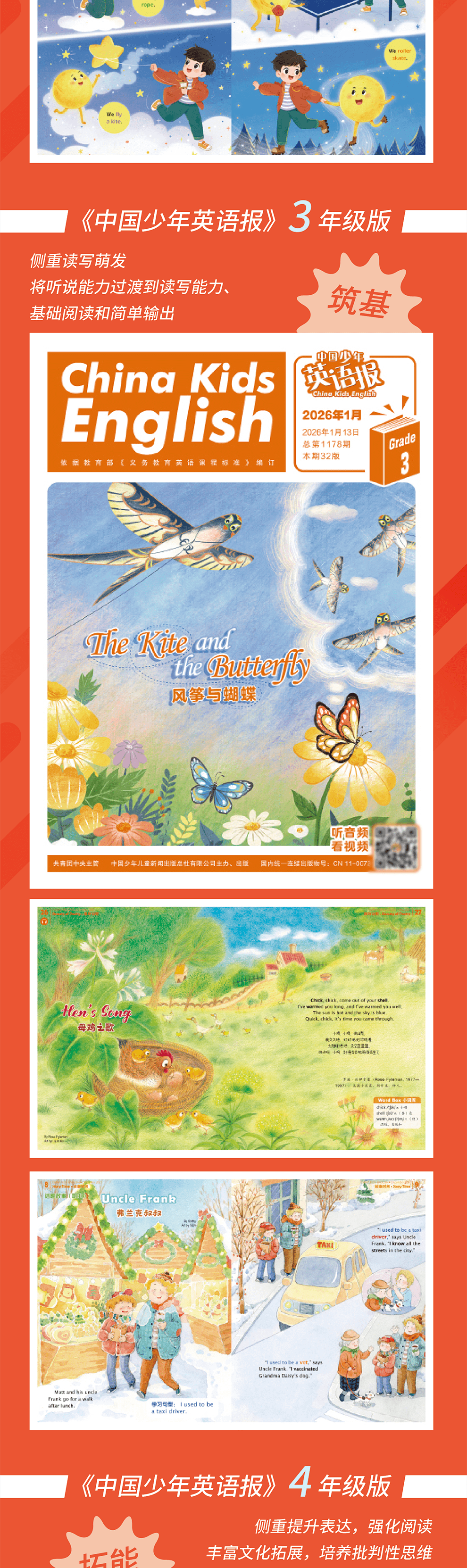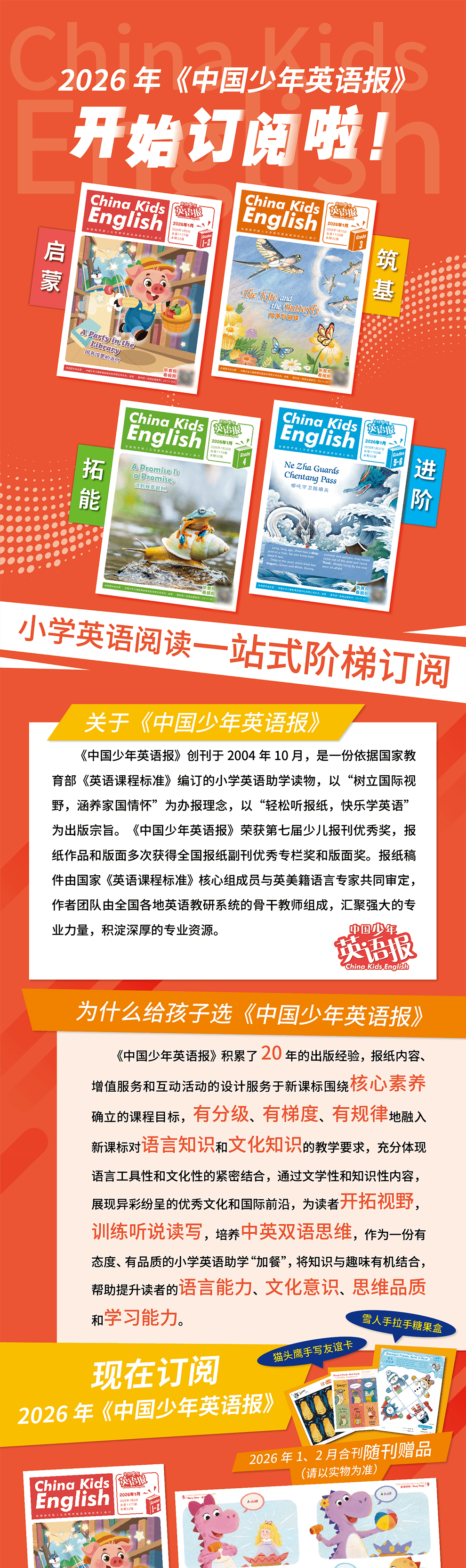 温馨提示:接刊社通知,中国少年英语报三四年级版本 2026年1月起将改版为 中国少年英语报三年级 和 中国少年英语报四年级 两个版本。