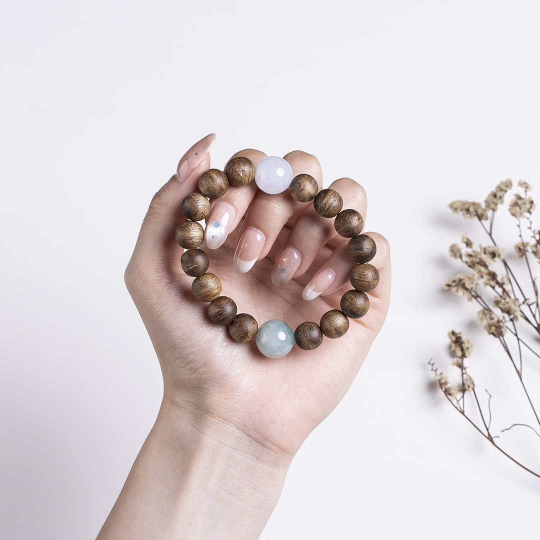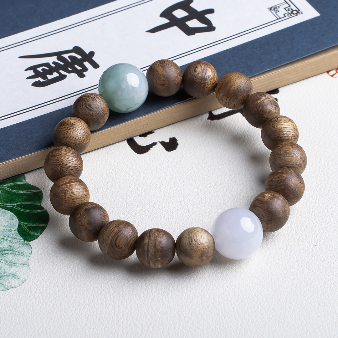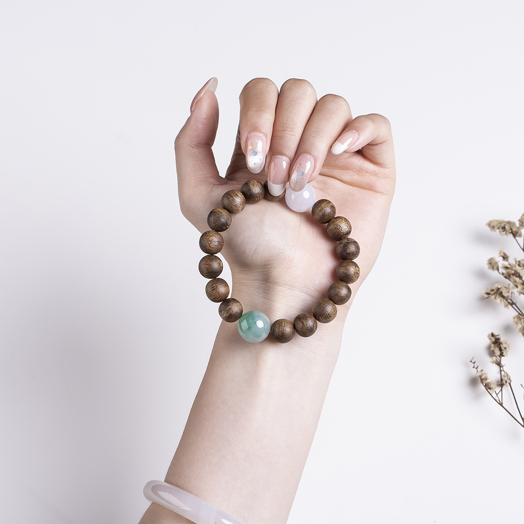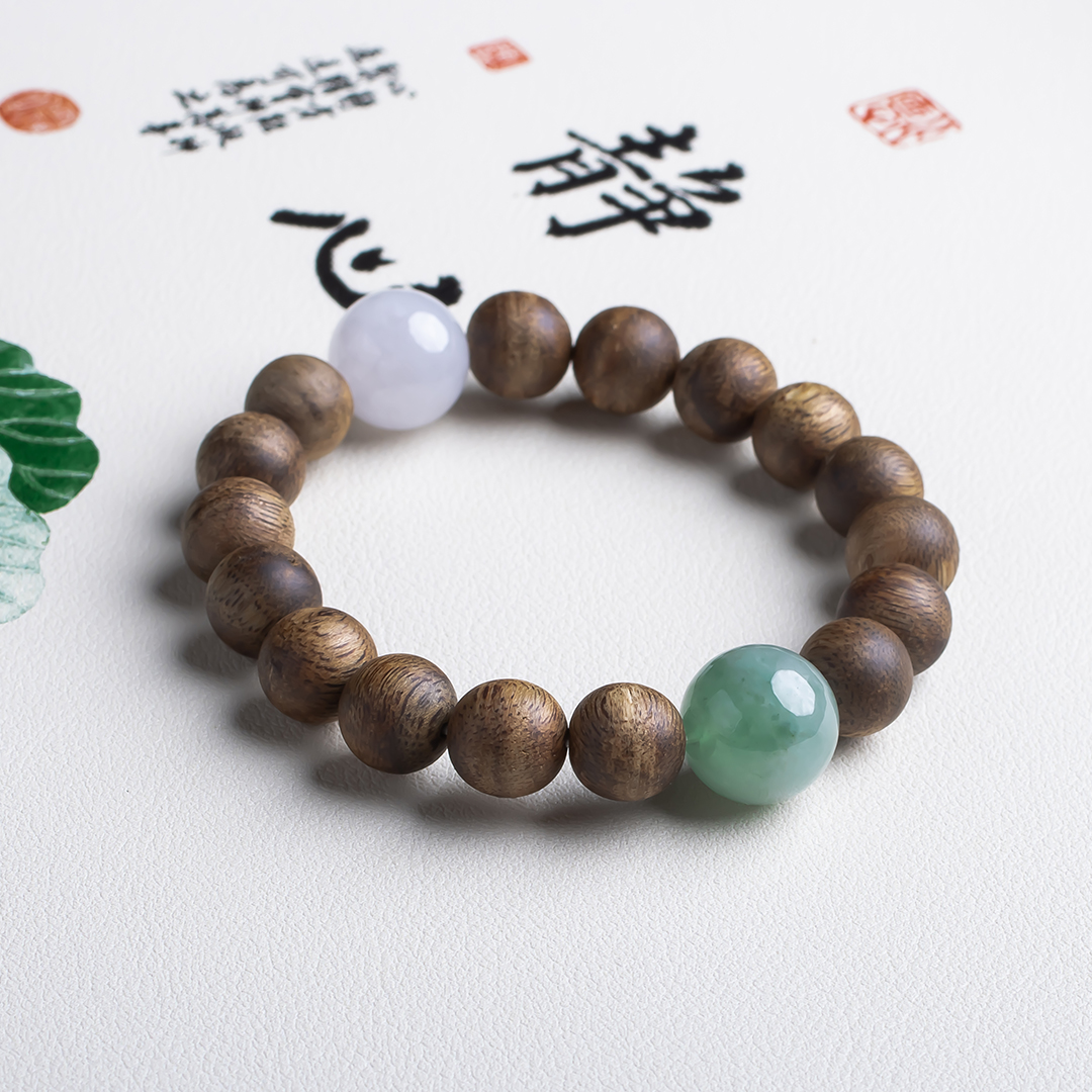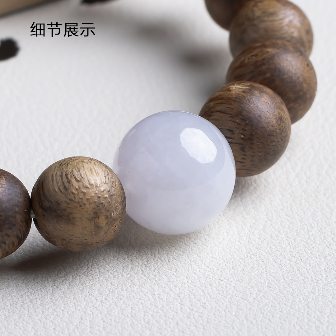 xy0483沉香+翡翠大手串,天然沉香约10.3mm,原色原味,香味自然清甜,两颗冰糯底的翡翠大圆珠,简约百搭,上手大气,香玉养身。