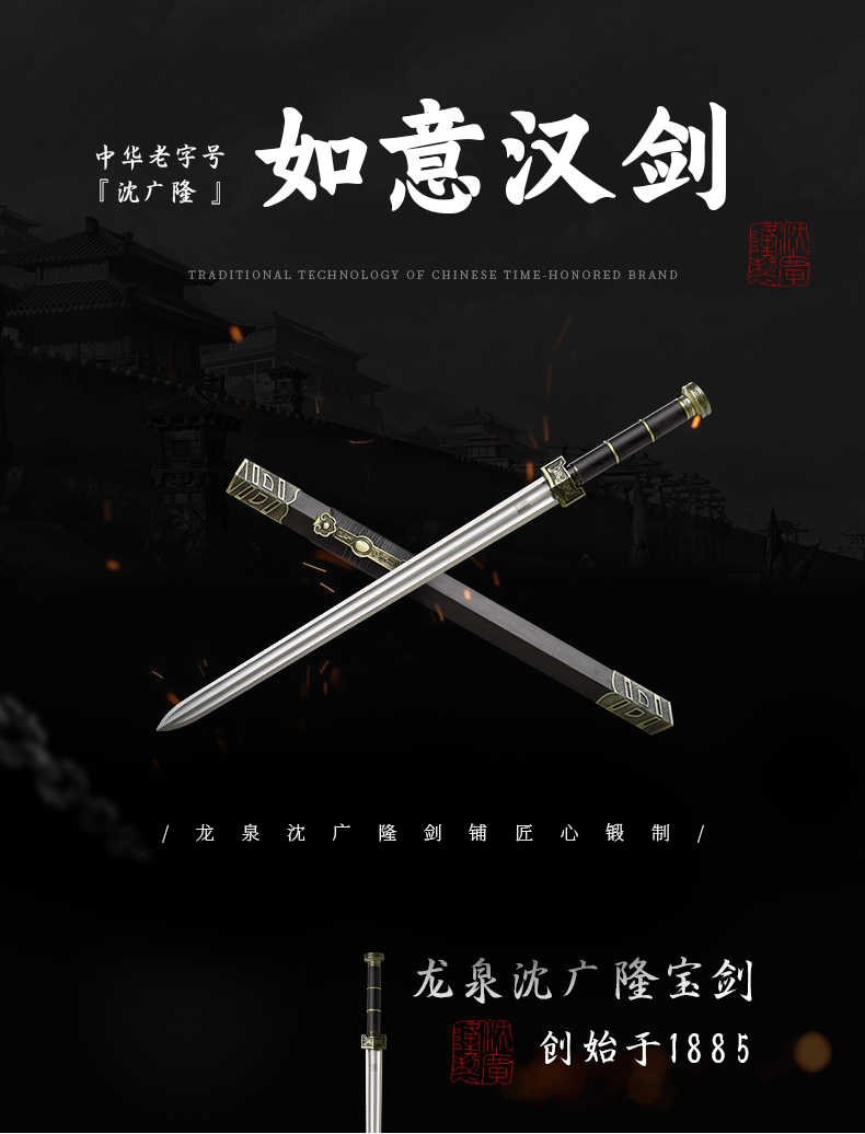 - 龙泉沈广隆剑舖创始于1885年(清光绪)位于浙江省龙泉市,是当地唯一一家“子承父业”一脉相承的中华老字号宝剑生产企业,是国家级非物质文化遗产龙泉宝剑项目保护单位,并以“天下第一剑”闻名于海内外....