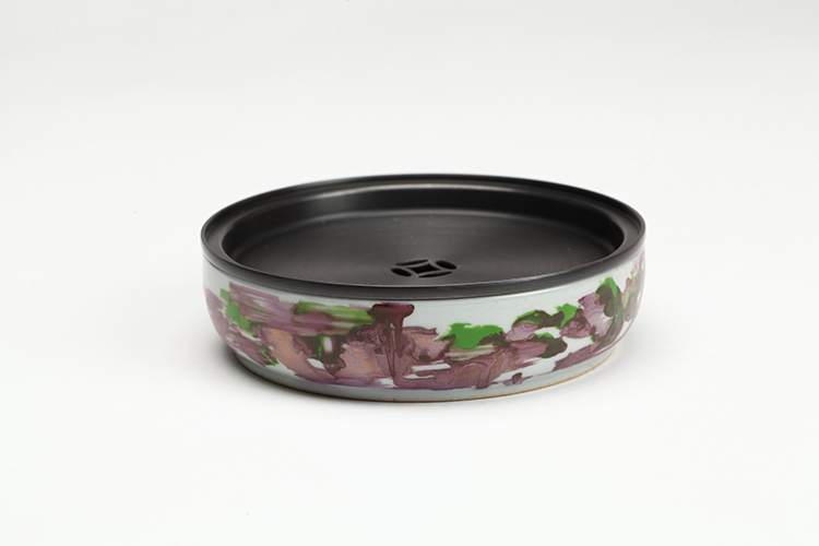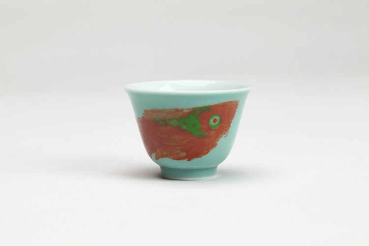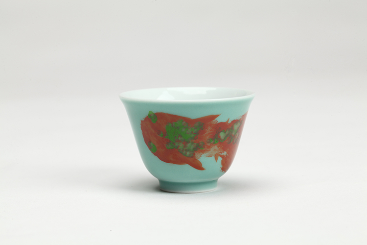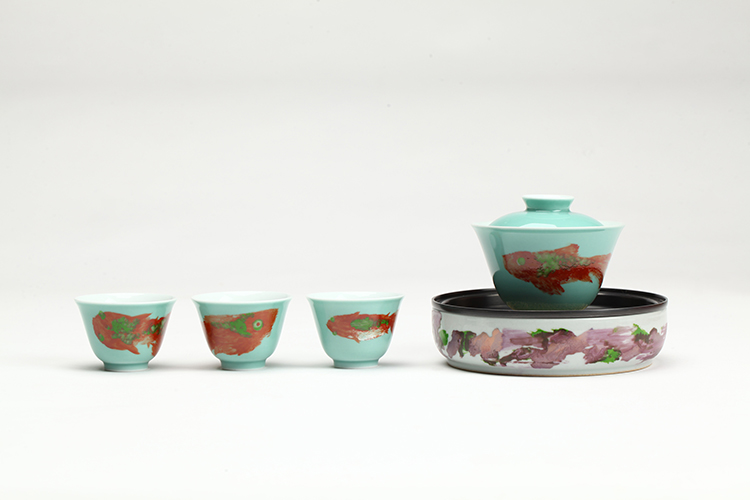 《三十六麟如抹朱》茶具,盖碗、品茗杯为松石釉,建水为仿古灰釉地,纯锡滤。三十六麟为鲤鱼,矾红与松石的对比,虽是红绿对比,却不艳俗,车前子以写意的画面风格与传统茶具瓷器的诠释,擦出全新的艺术火花。