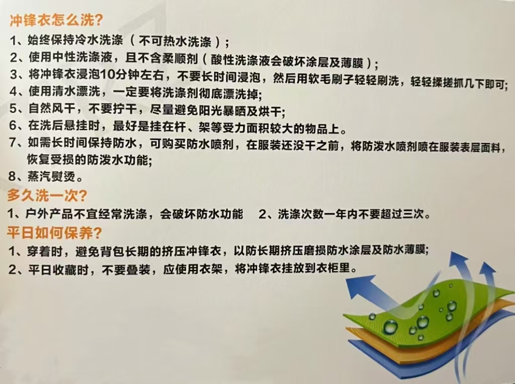 注意事项:冲锋衣不能机洗,不能高温清洗熨烫衣物内里有石墨烯材质,不易附着,与汗水接触会掉色,且摩擦时间长都会出现掉色情况,属正常现象(介意勿拍)