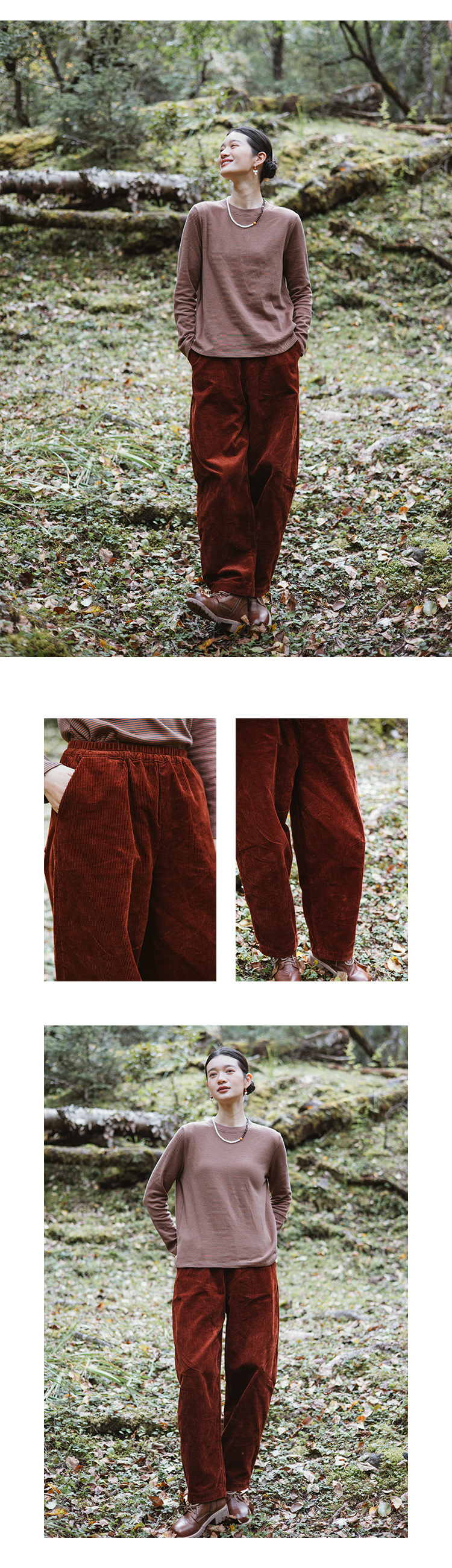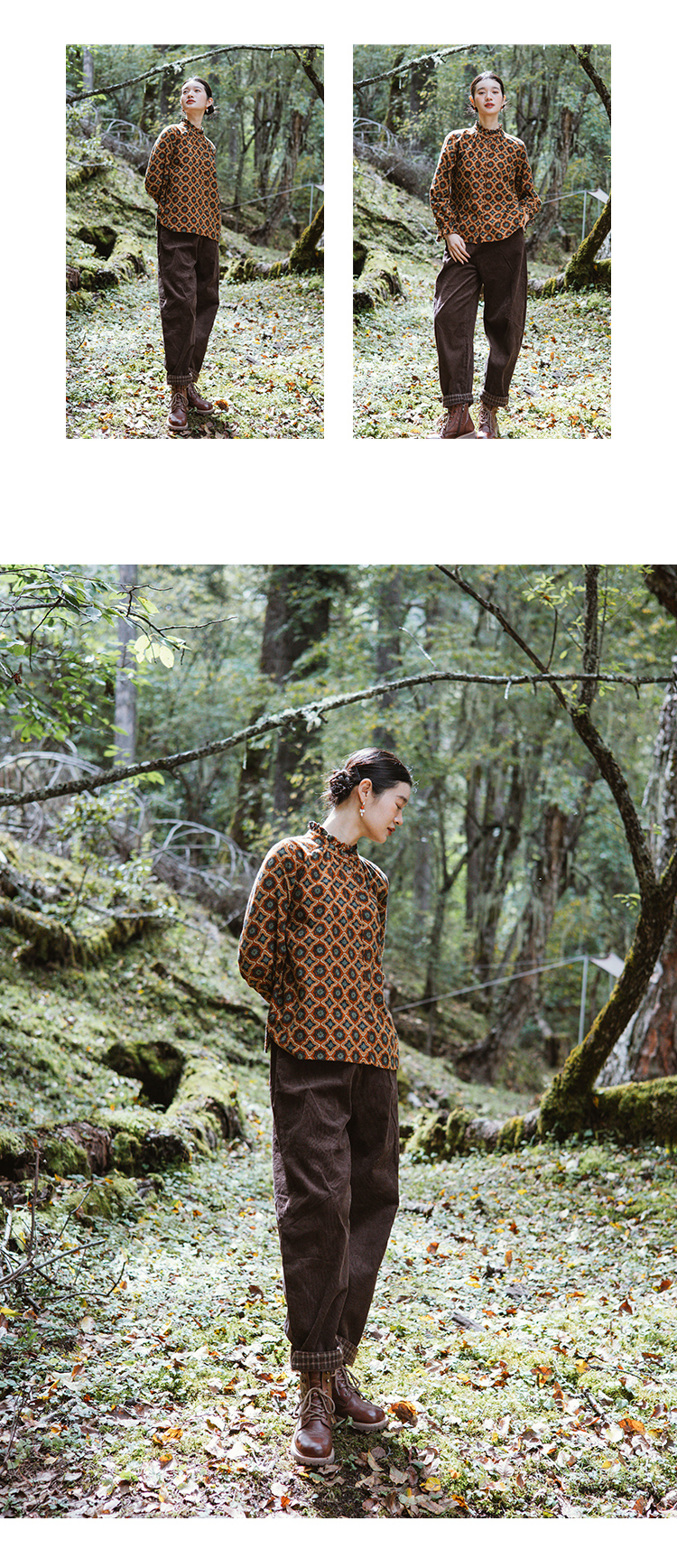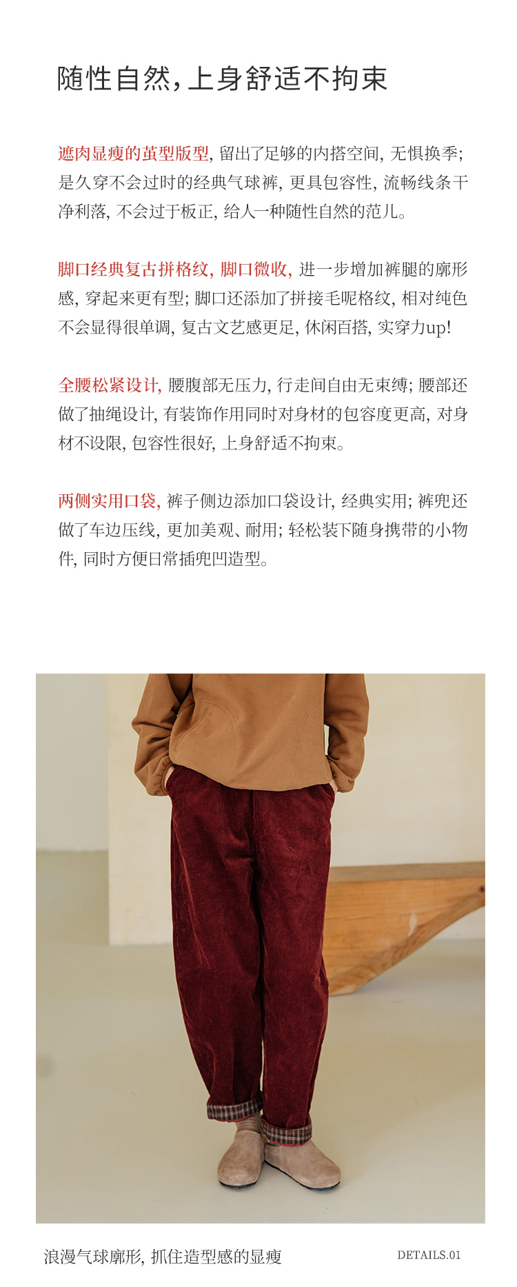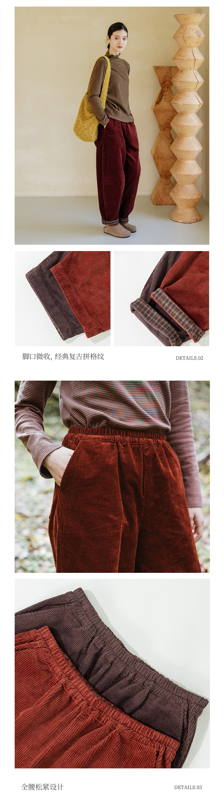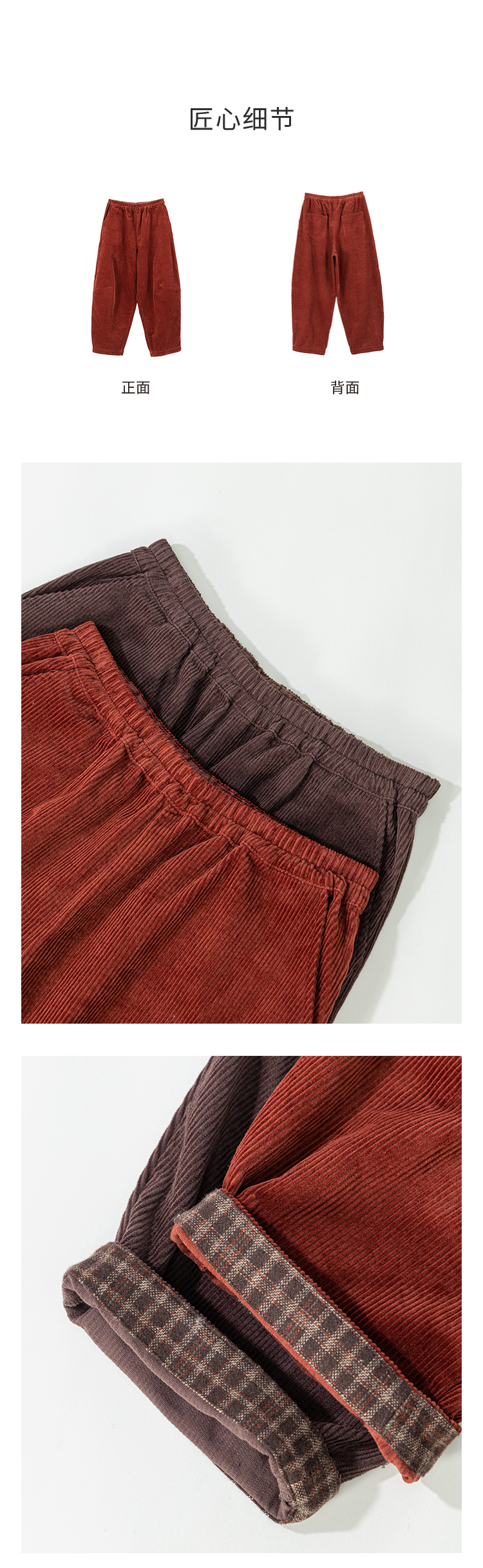 绽放旅行女装254朵/灯芯绒气球裤*全腰松紧脚口拼格纹休闲裤