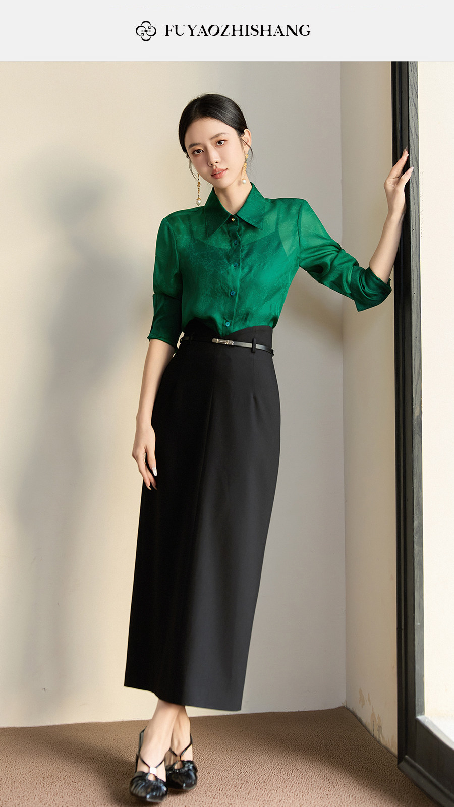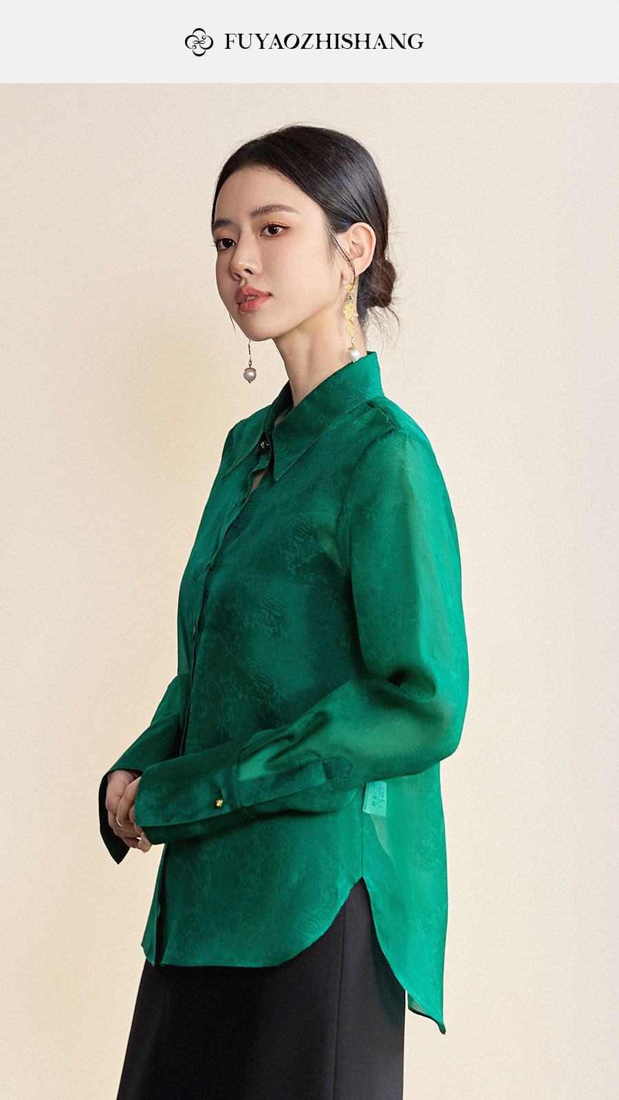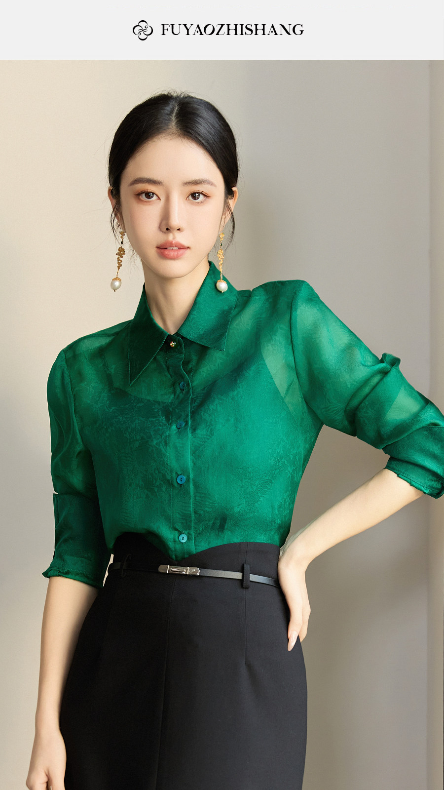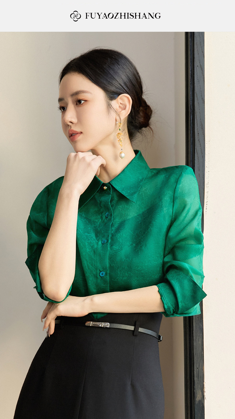 FUYAO扶摇直上 桑蚕丝100%衬衫女古典风七分袖墨绿色翻领气质上衣