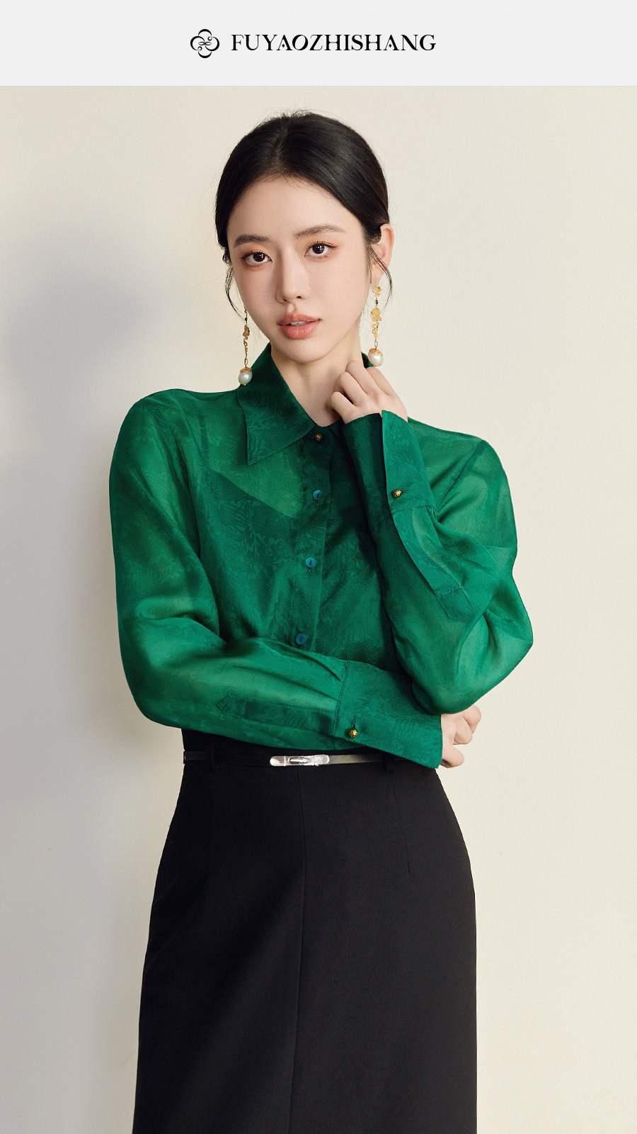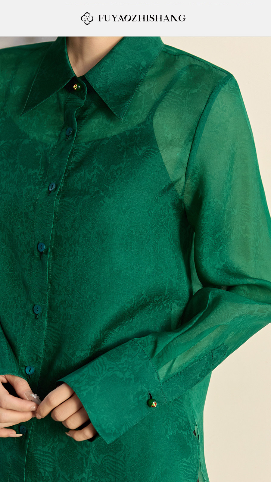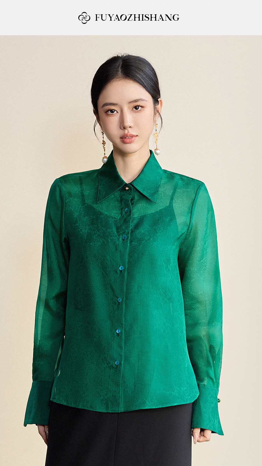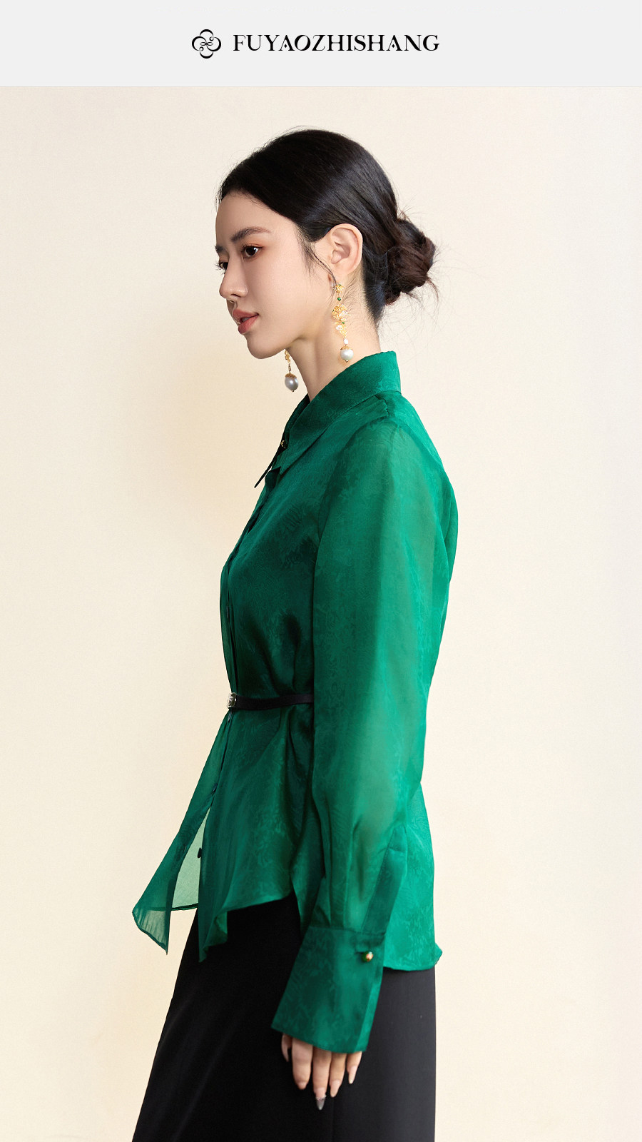 FUYAO扶摇直上 桑蚕丝100%衬衫女古典风七分袖墨绿色翻领气质上衣