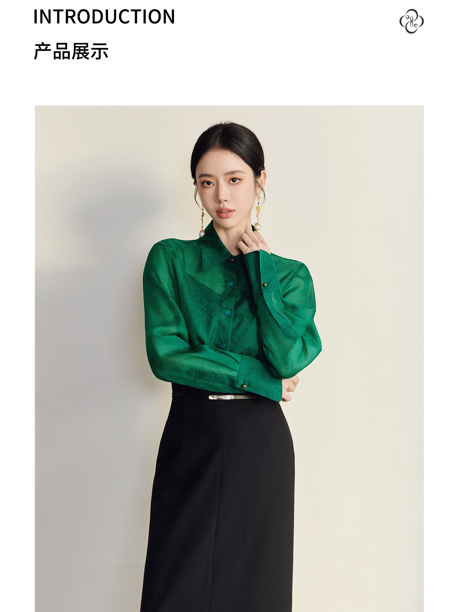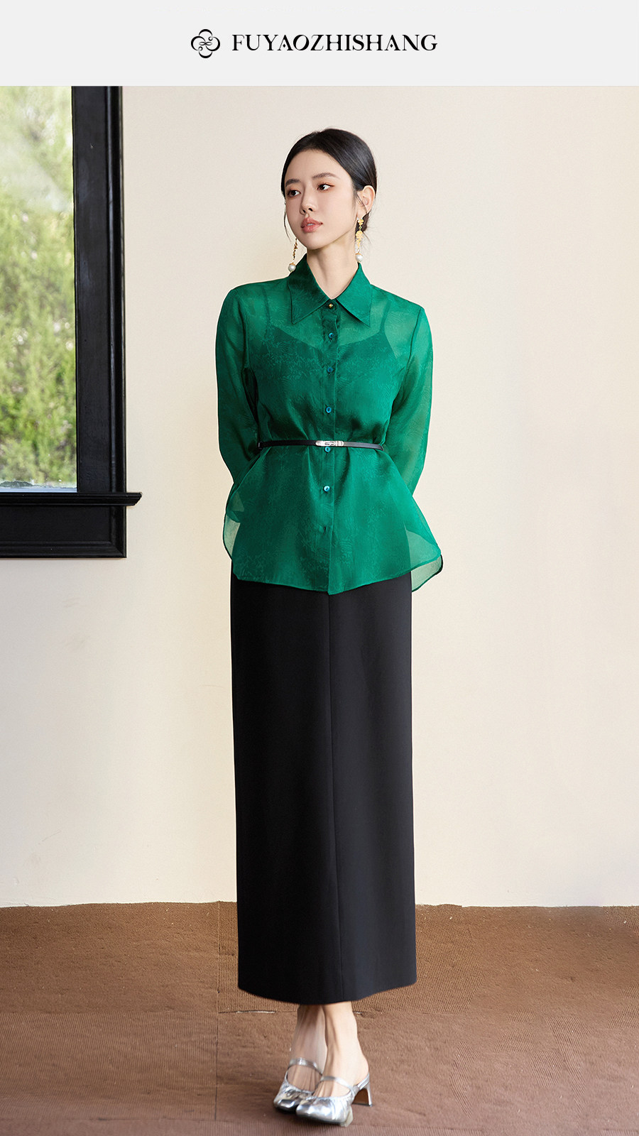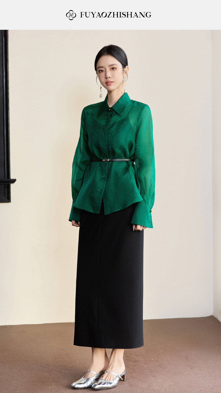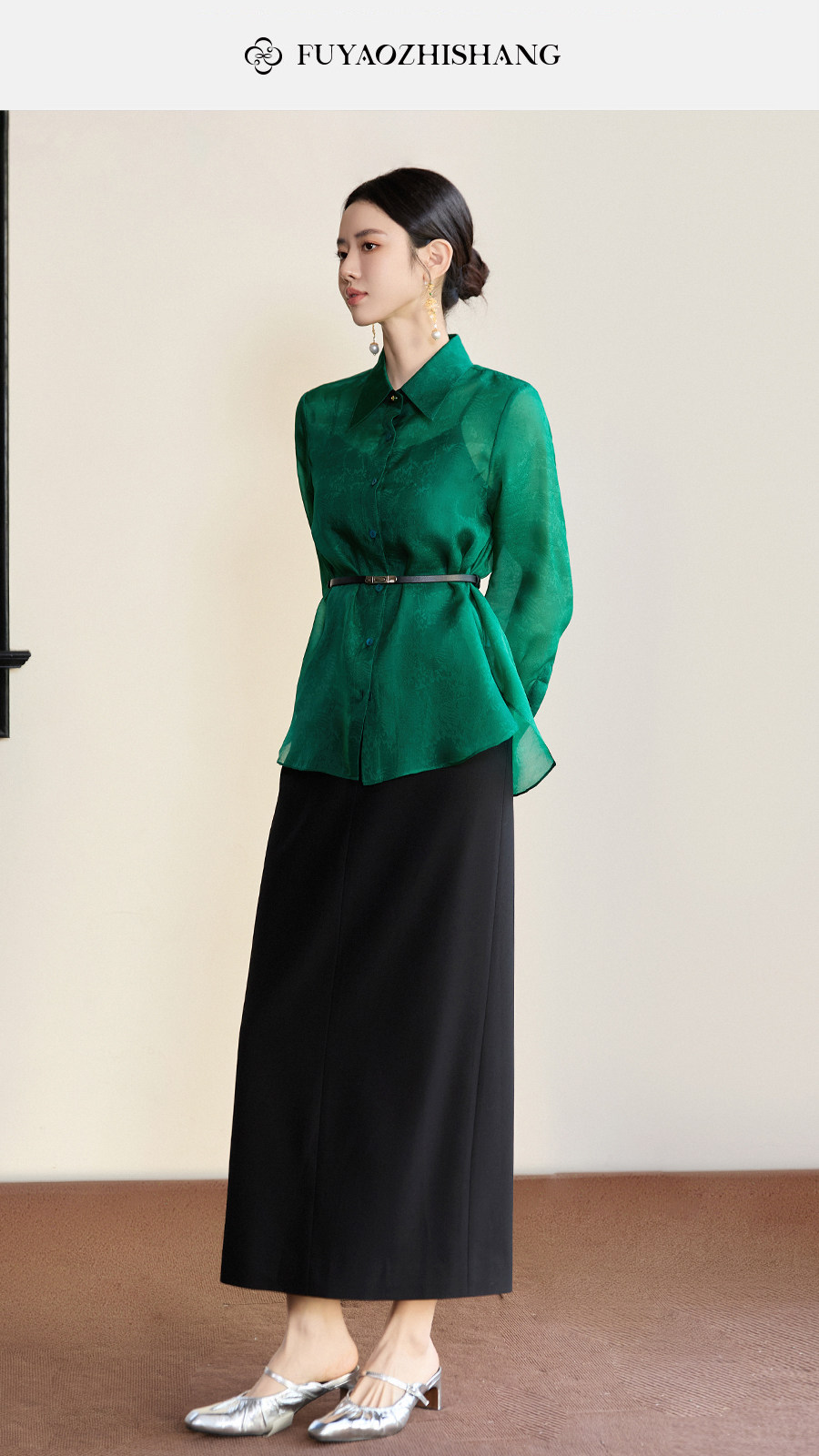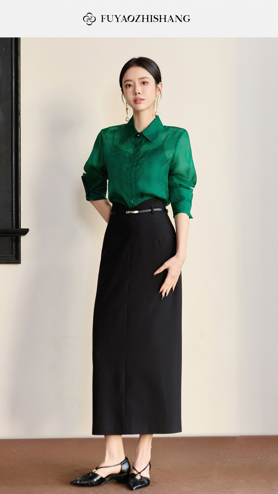 FUYAO扶摇直上 桑蚕丝100%衬衫女古典风七分袖墨绿色翻领气质上衣