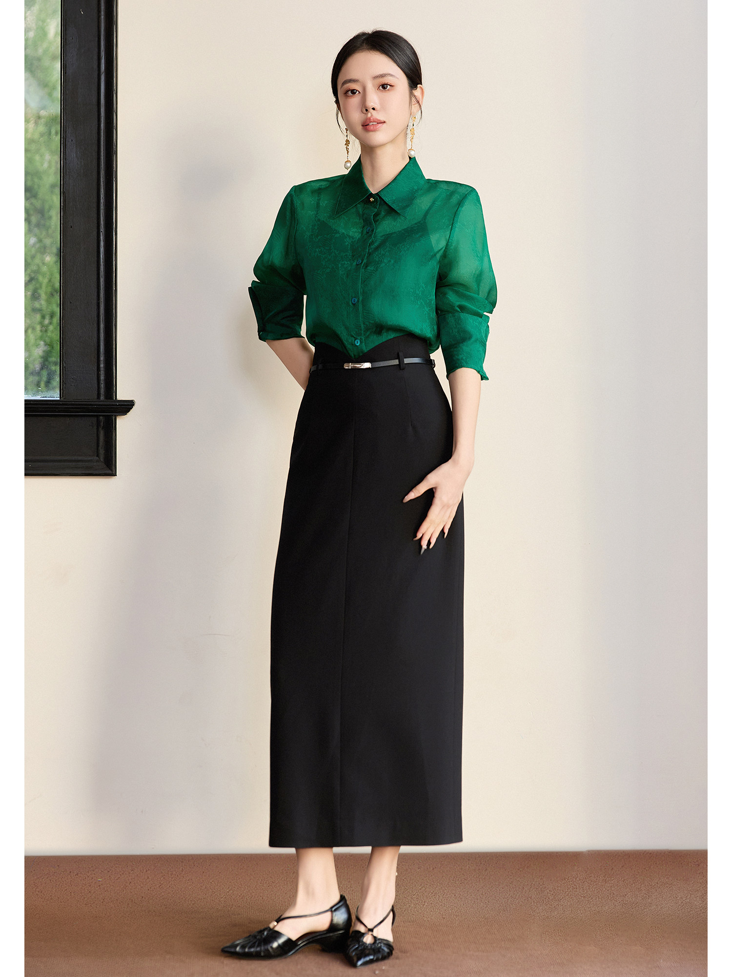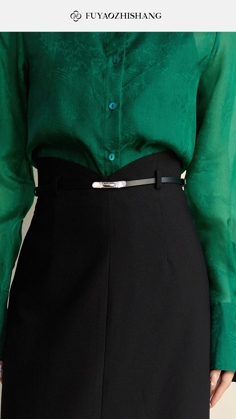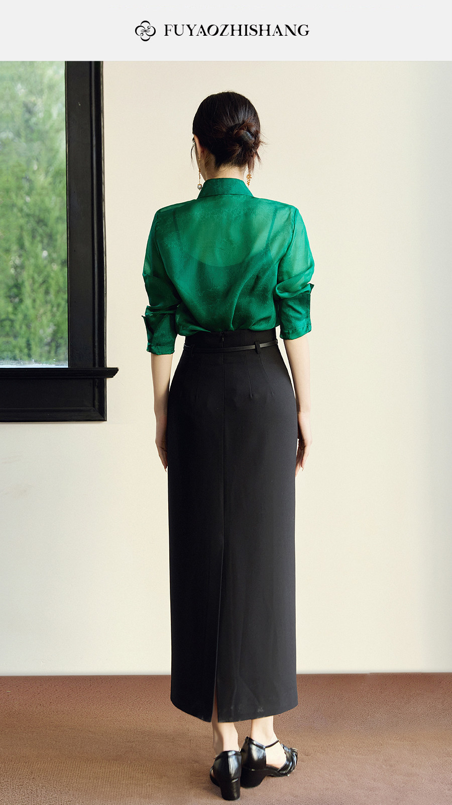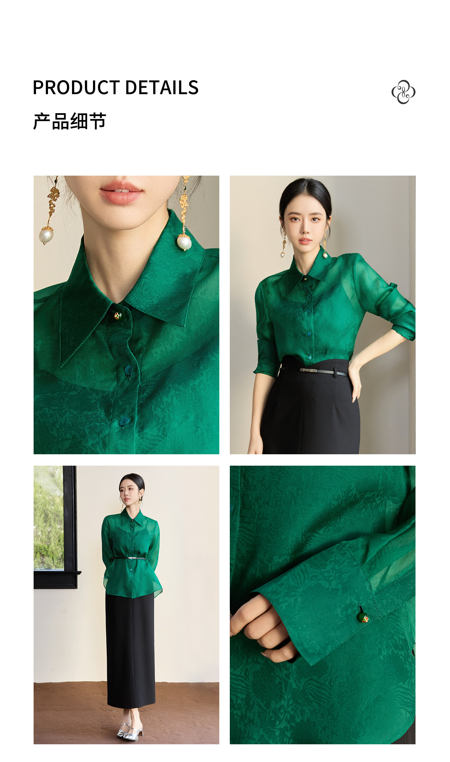 FUYAO扶摇直上 桑蚕丝100%衬衫女古典风七分袖墨绿色翻领气质上衣