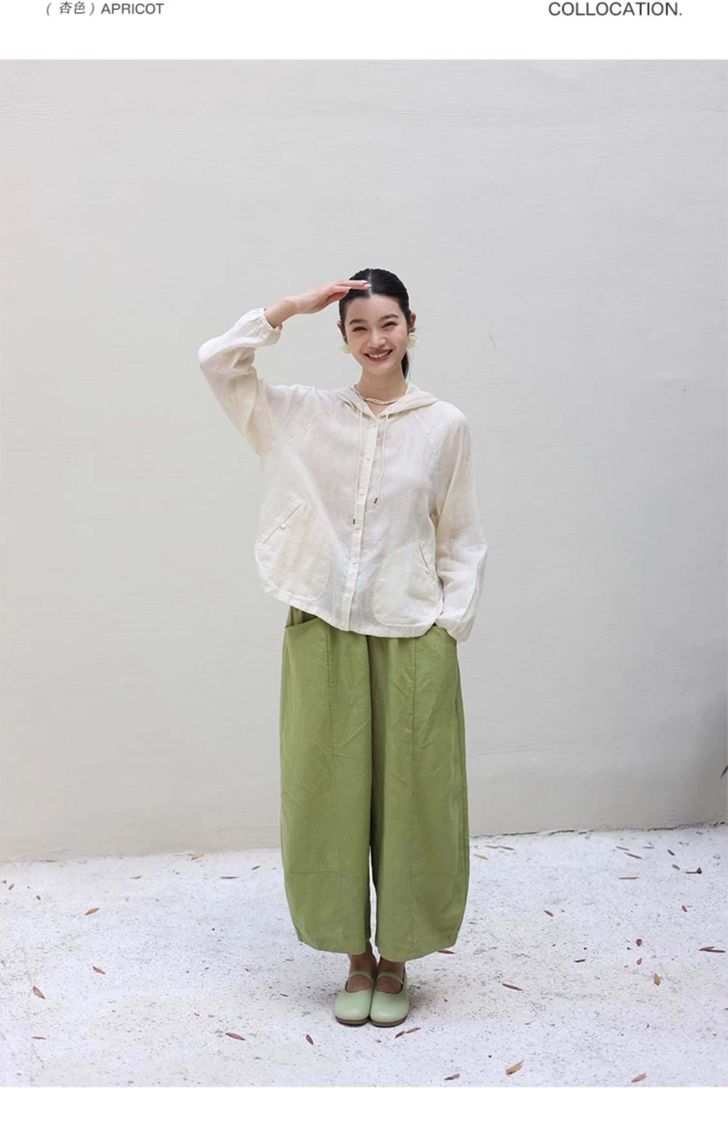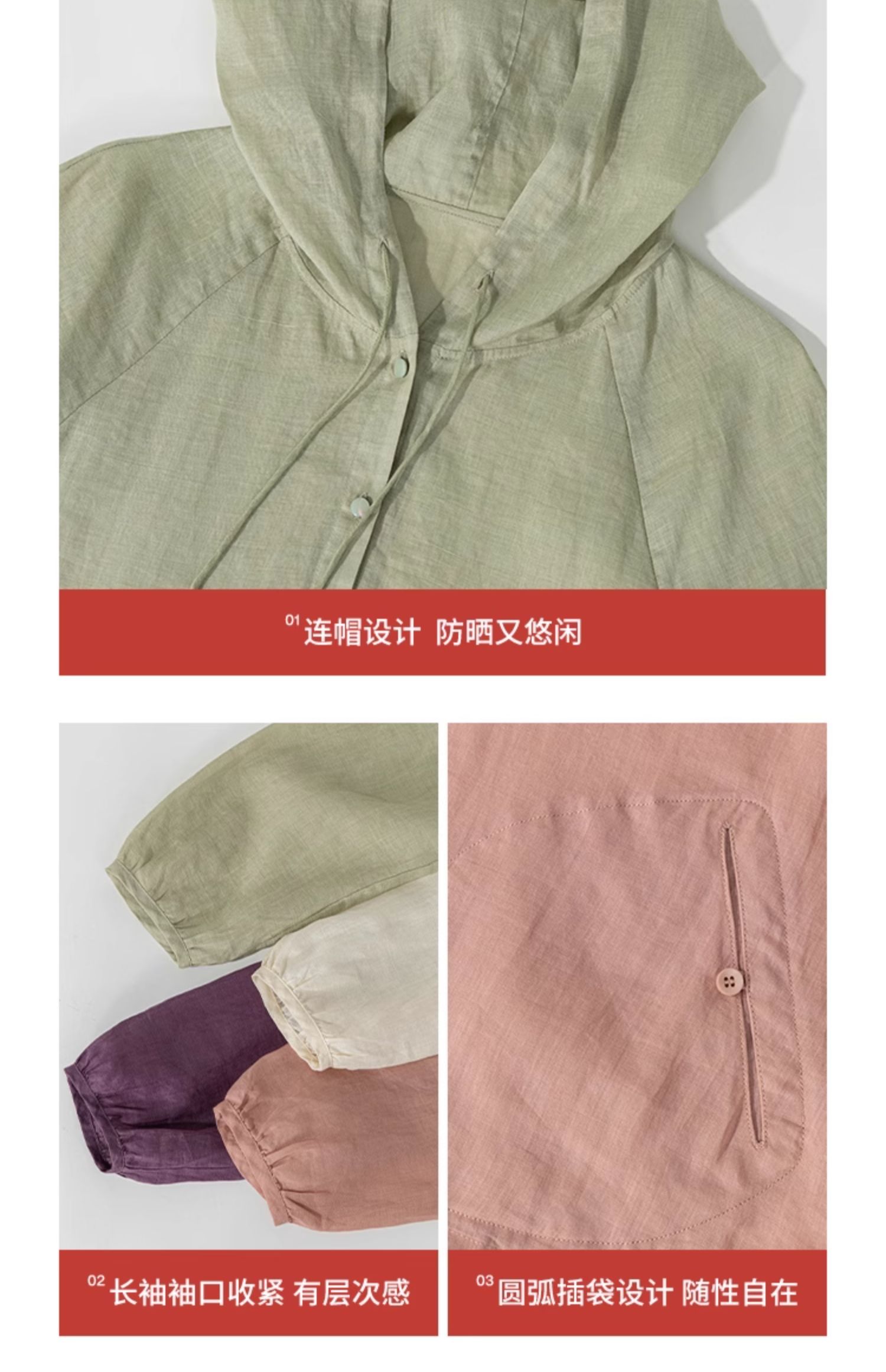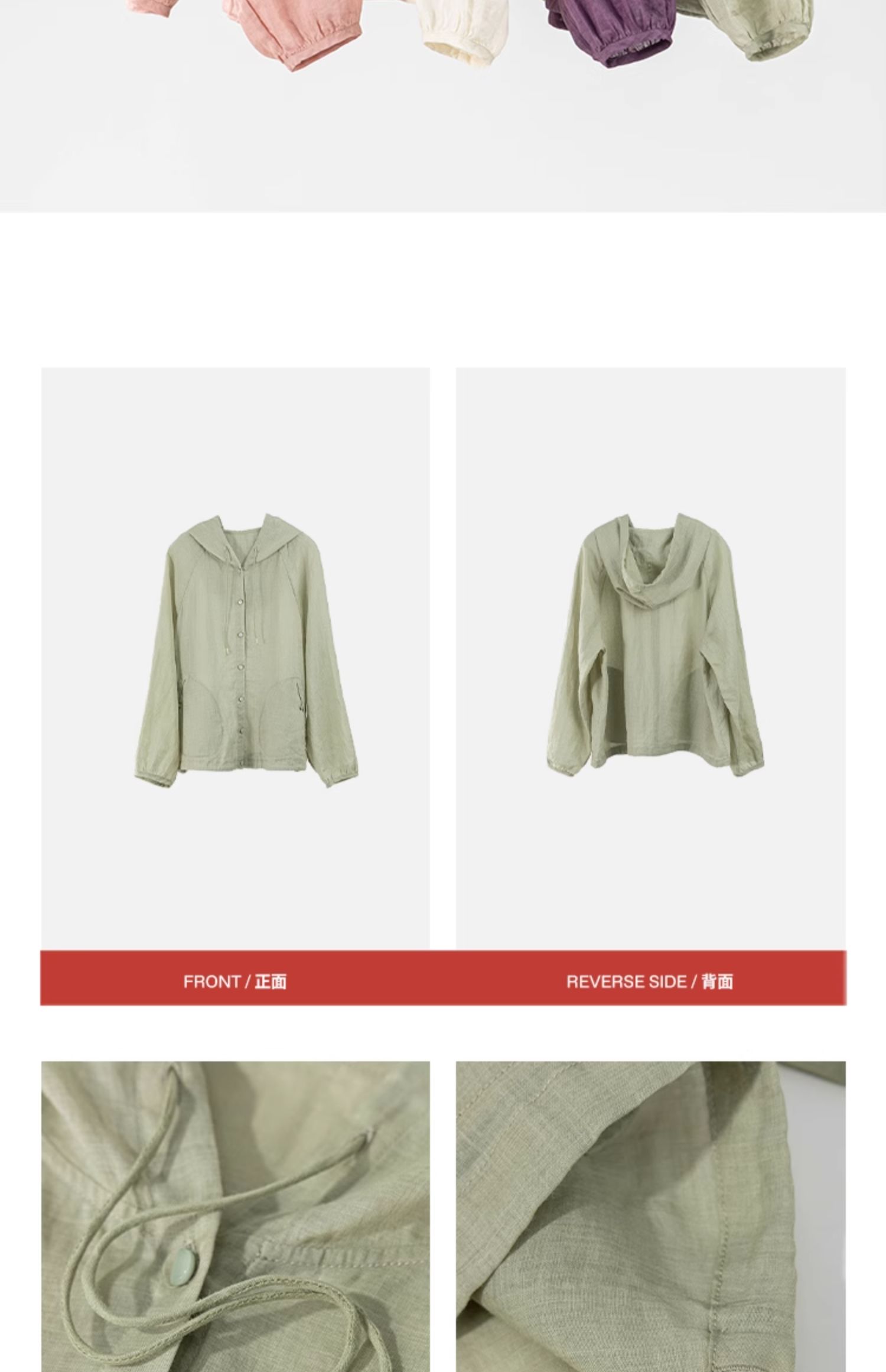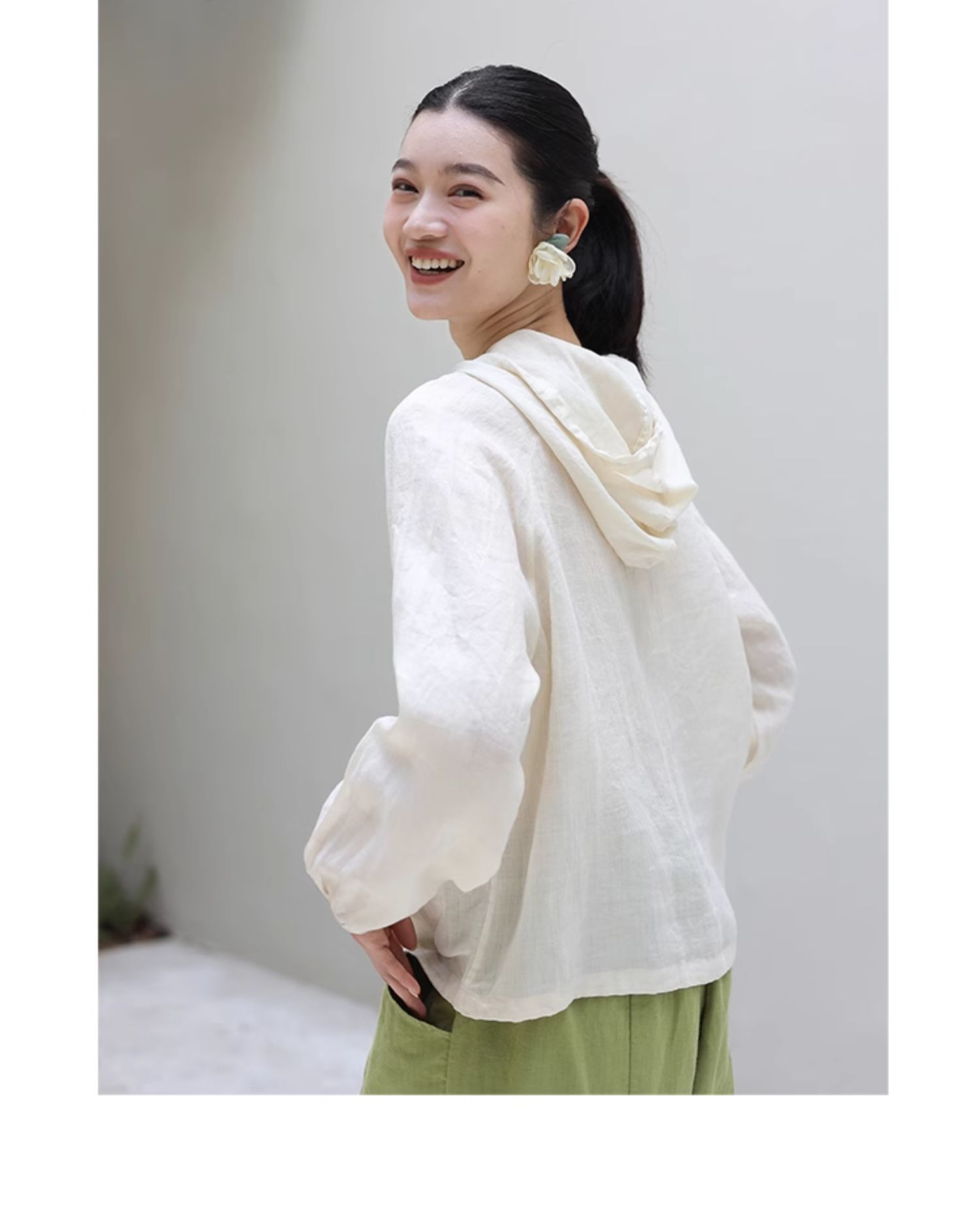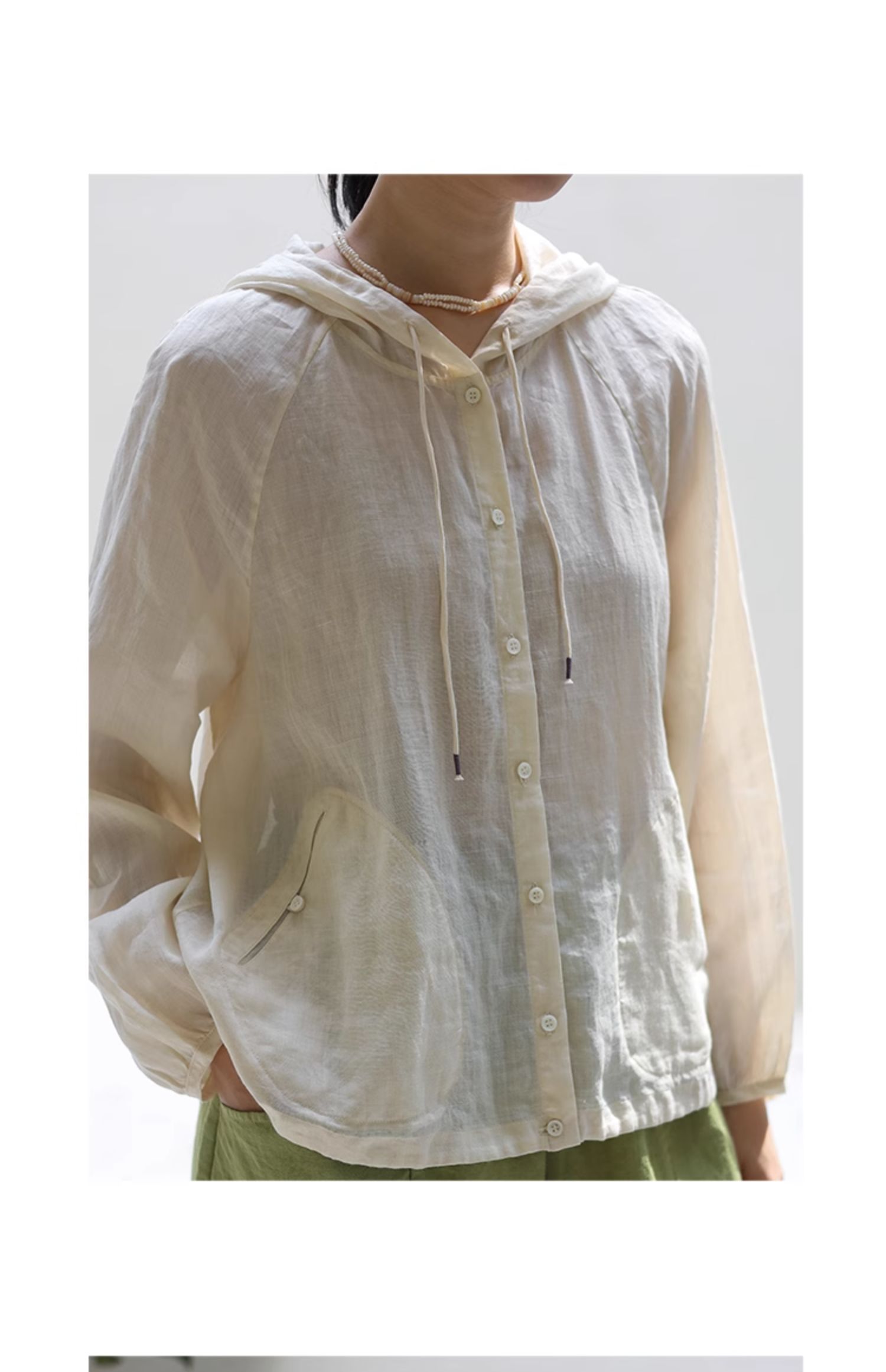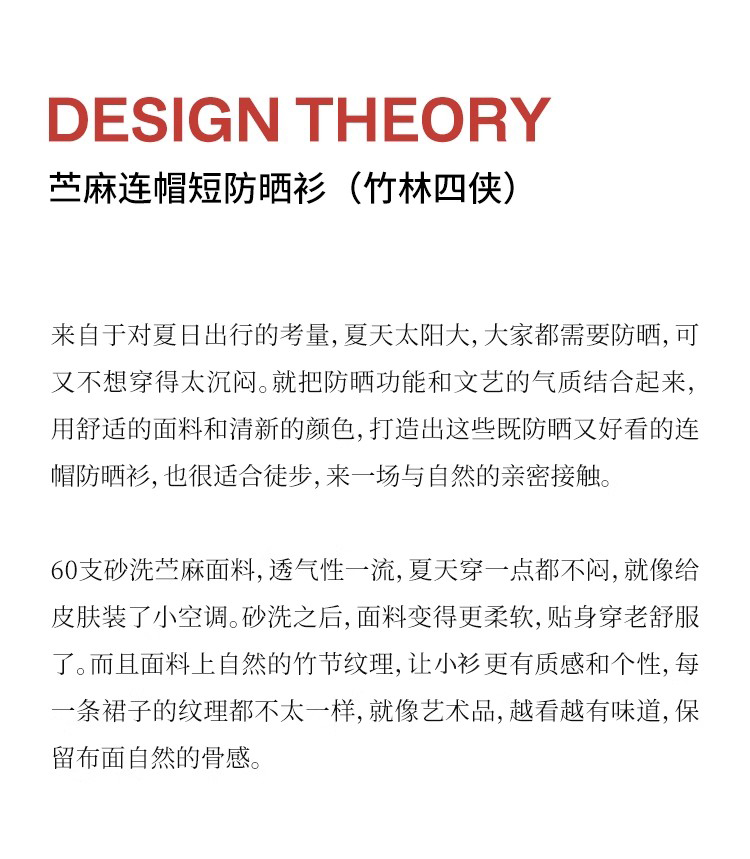 绽放164朵/竹林四侠防晒衫砂洗苎麻连帽开门襟下摆抽绳休闲上衣