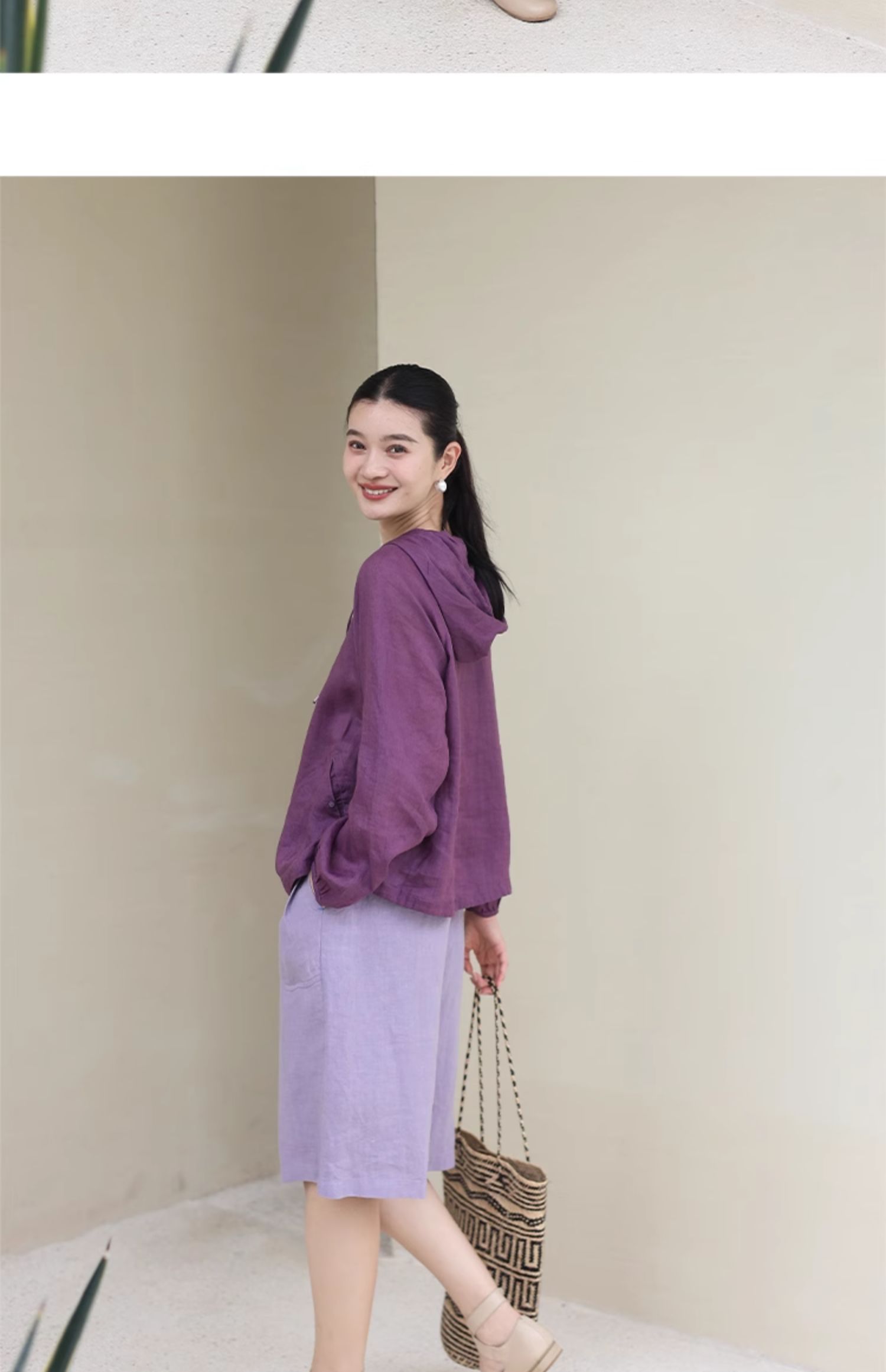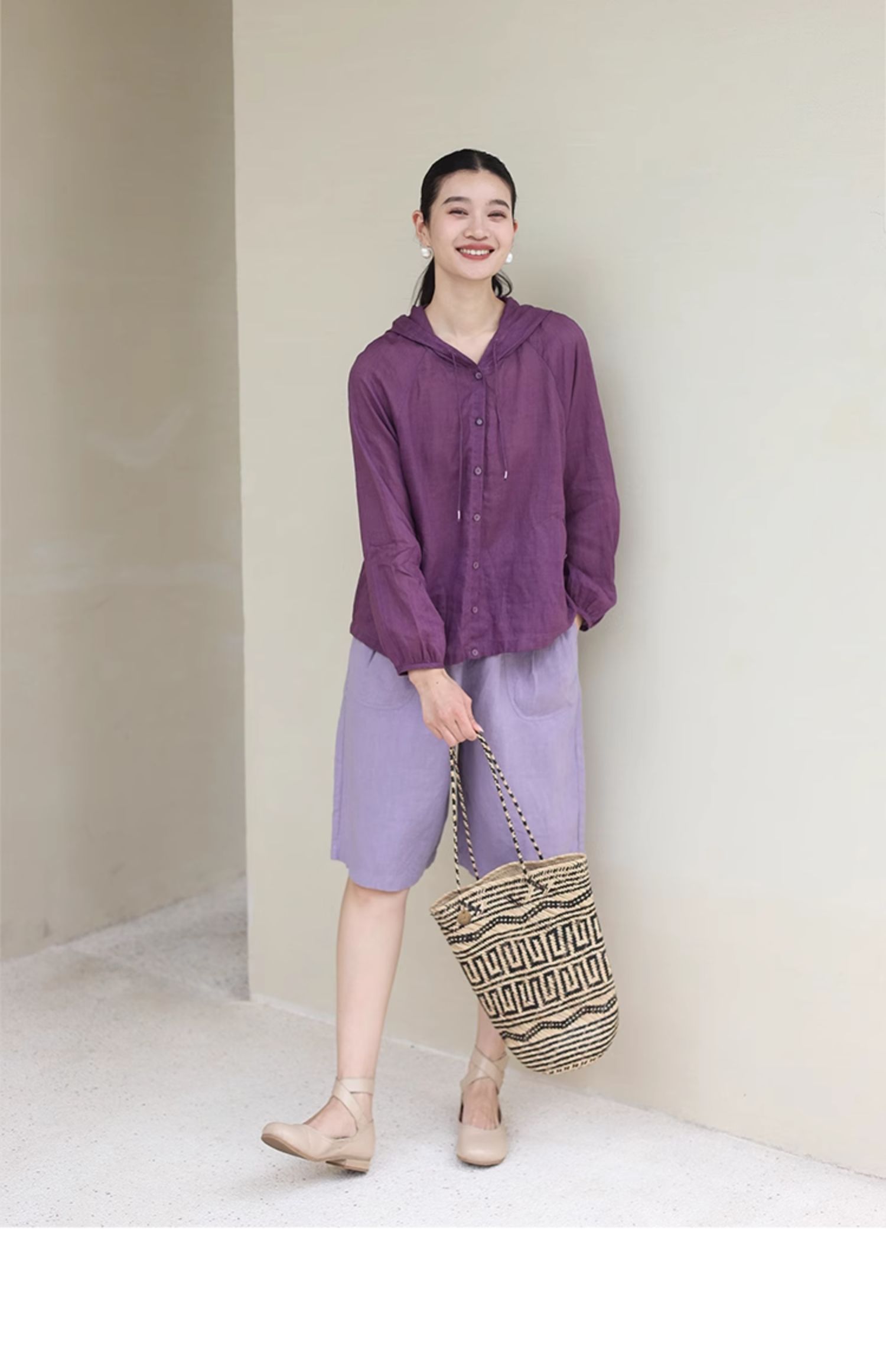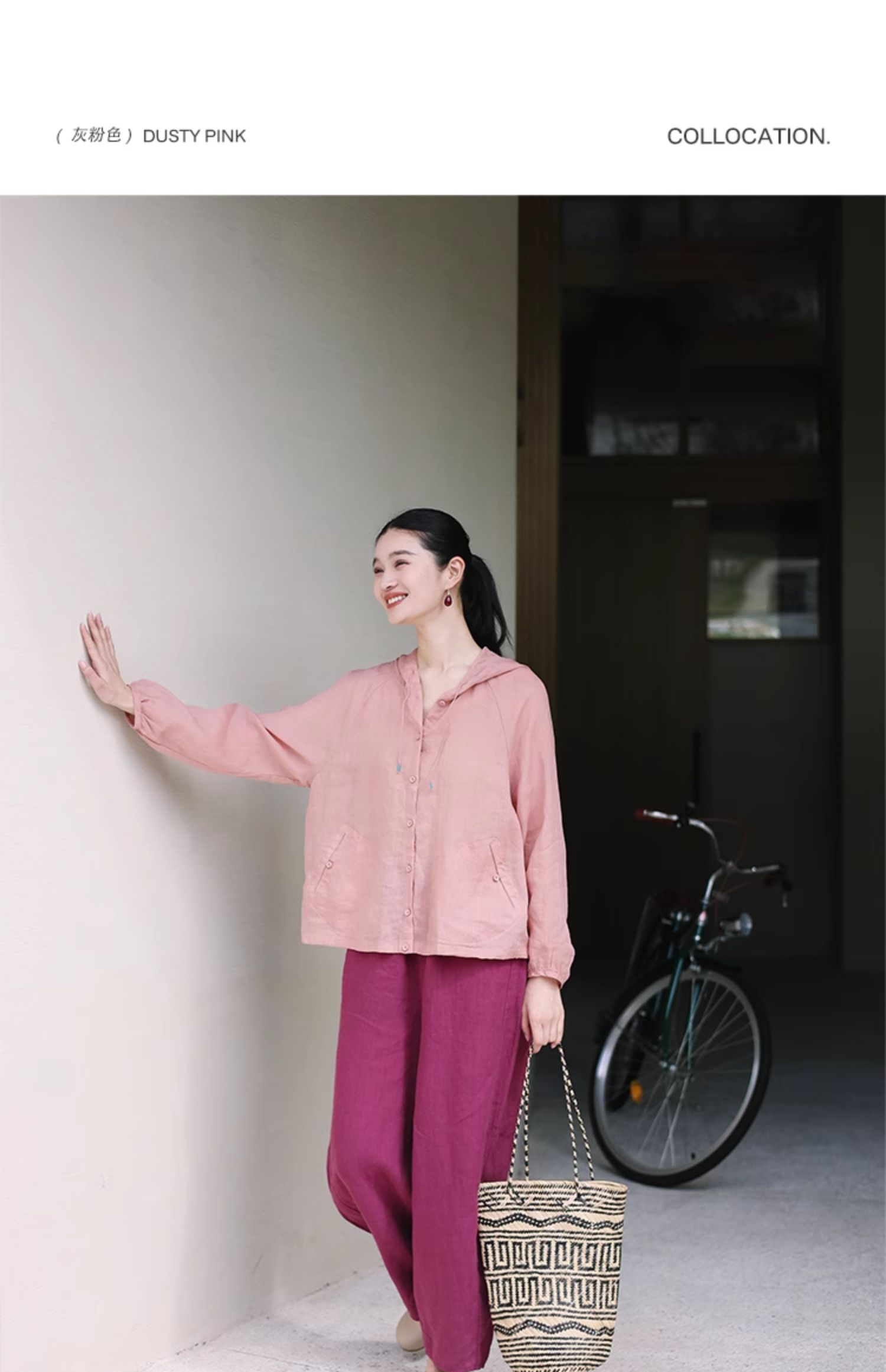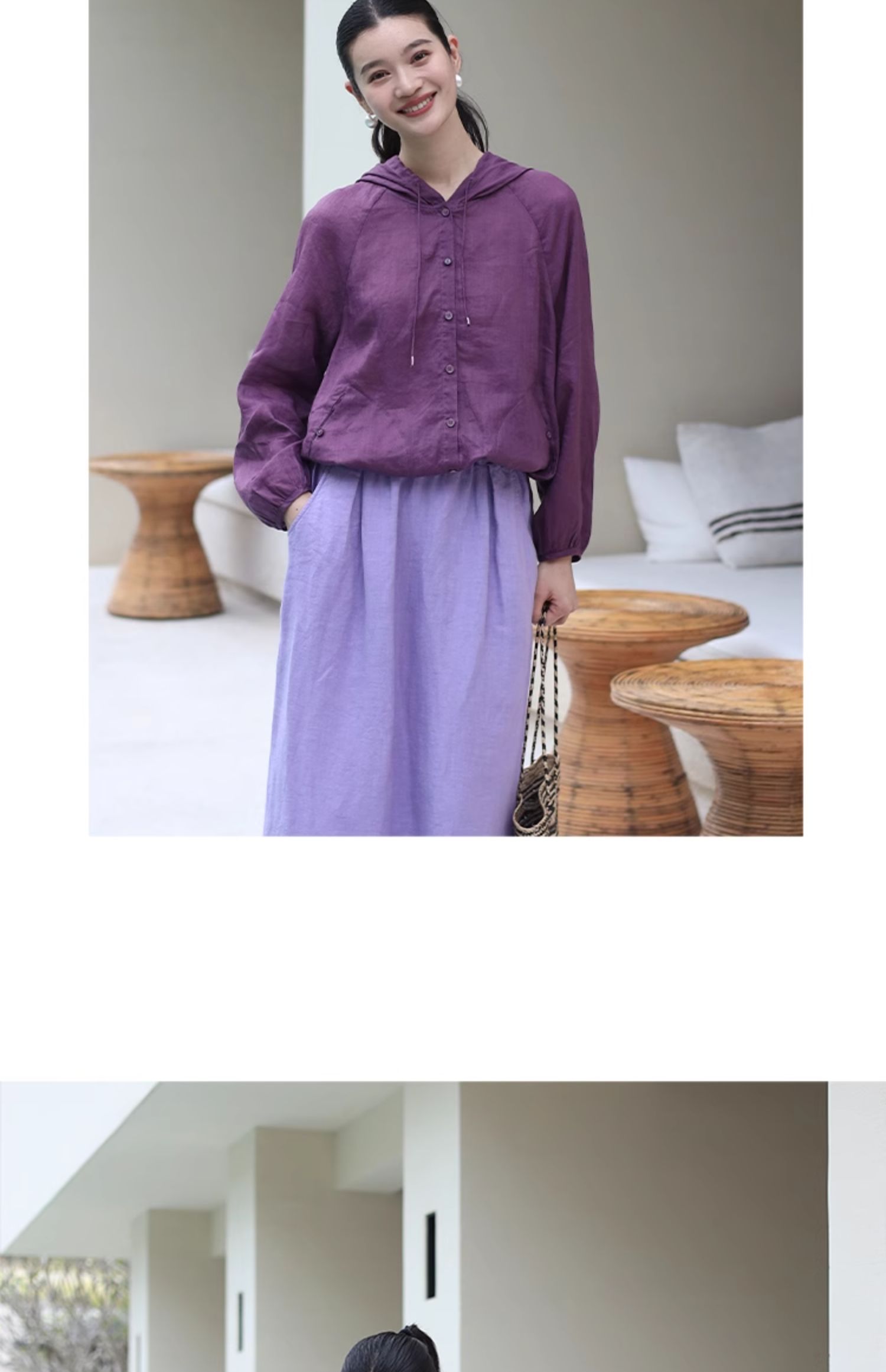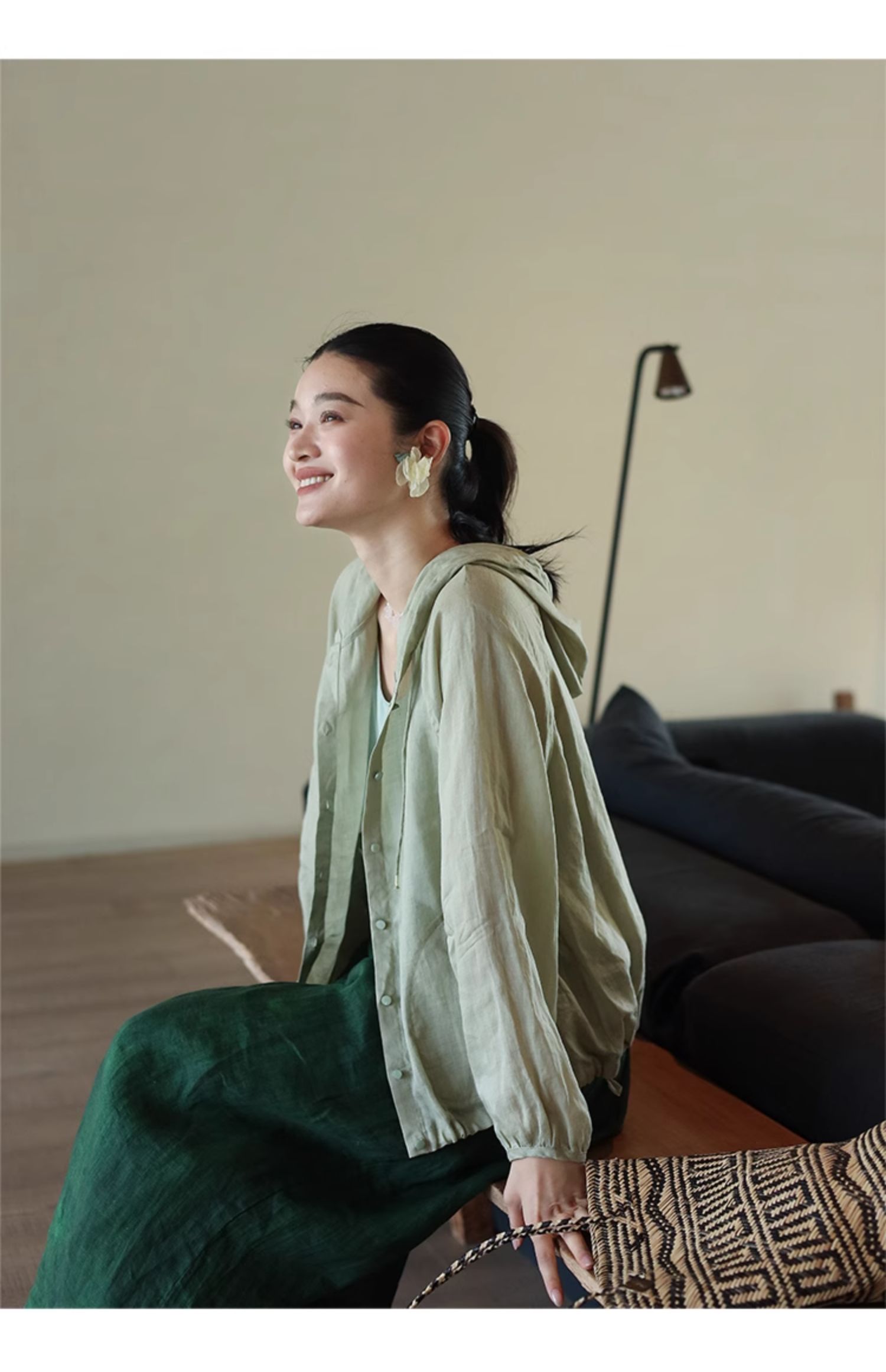 绽放164朵/竹林四侠防晒衫砂洗苎麻连帽开门襟下摆抽绳休闲上衣