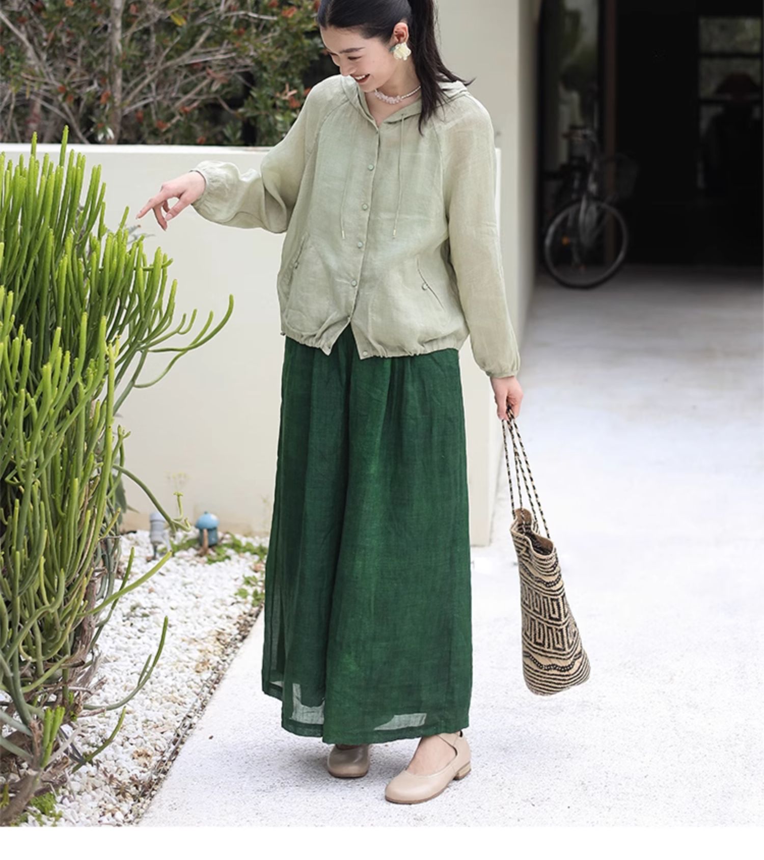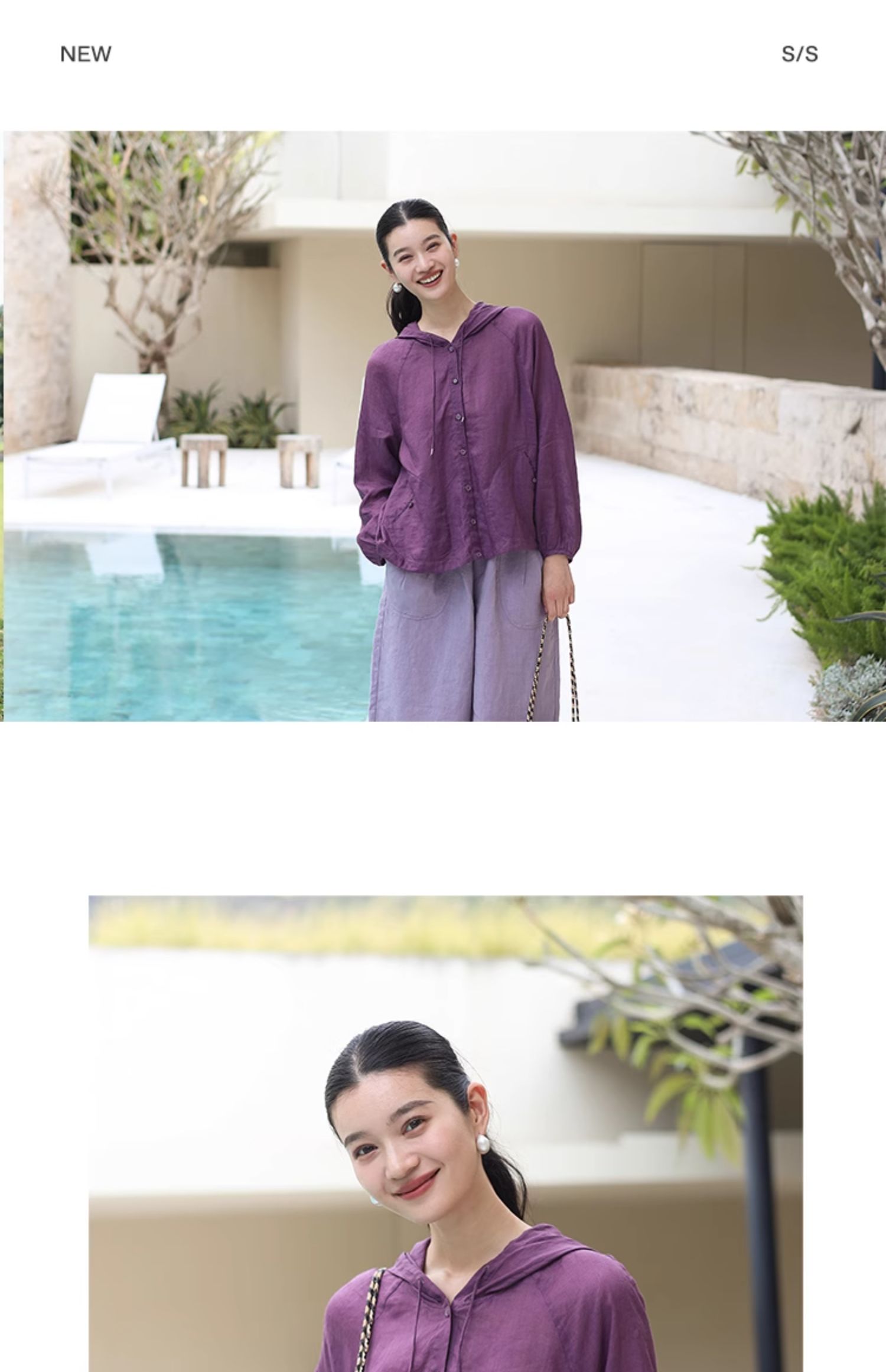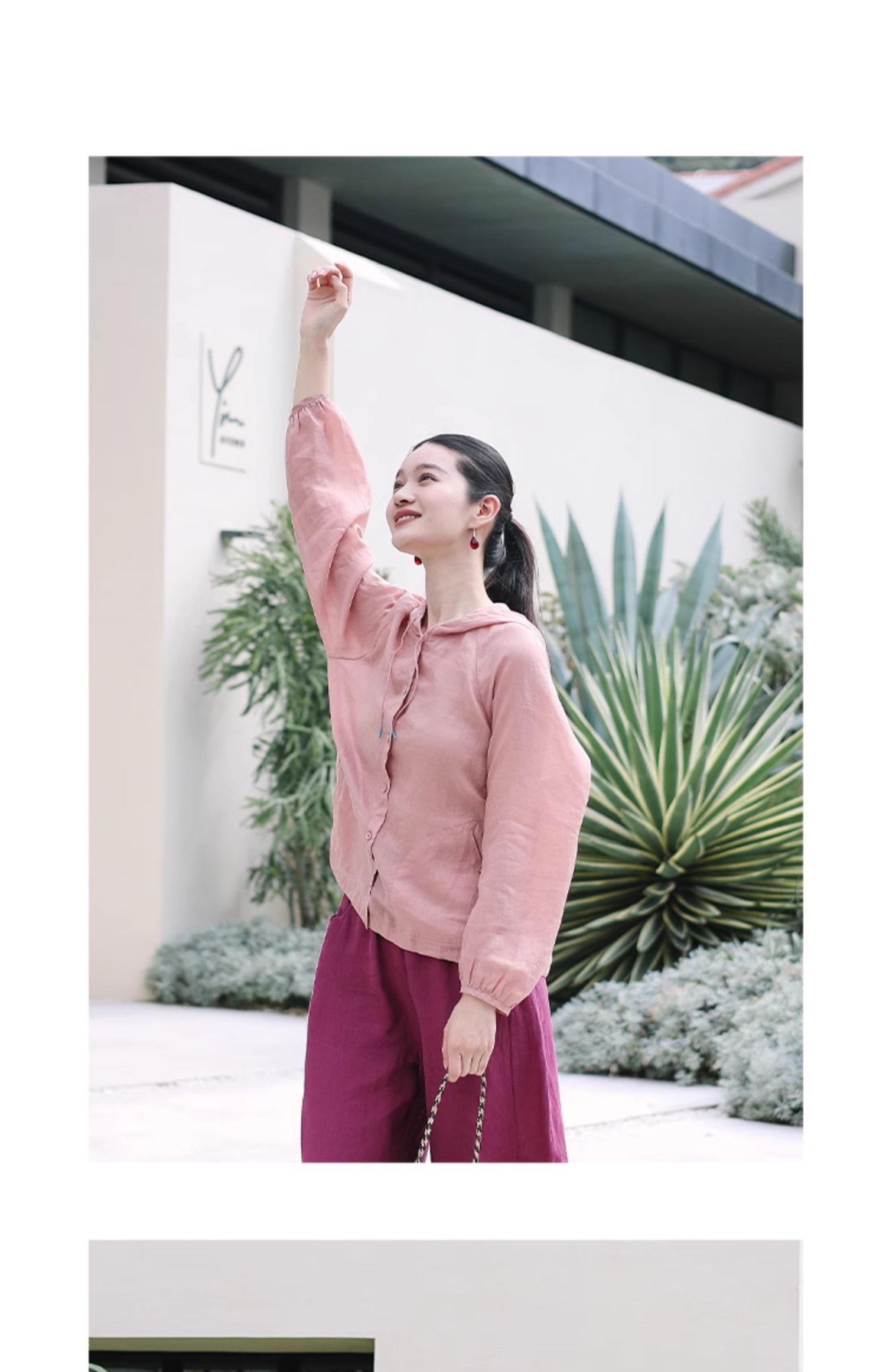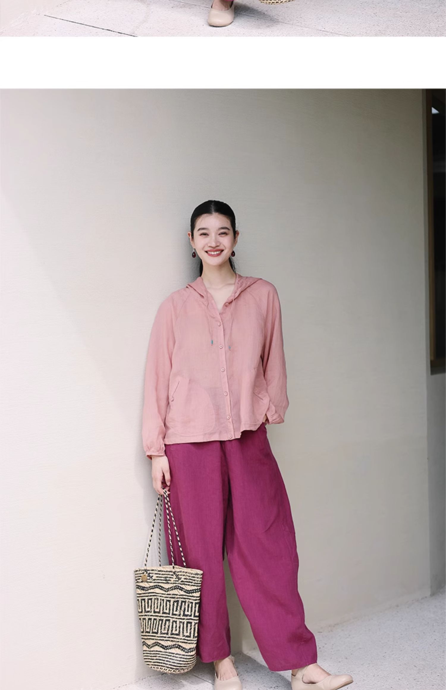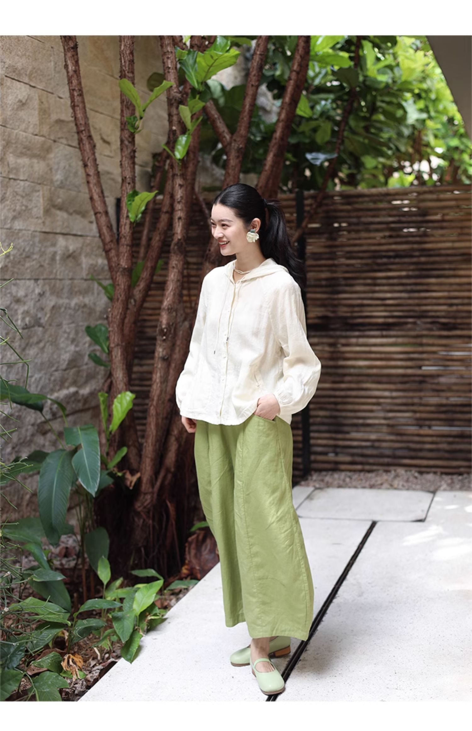 绽放164朵/竹林四侠防晒衫砂洗苎麻连帽开门襟下摆抽绳休闲上衣