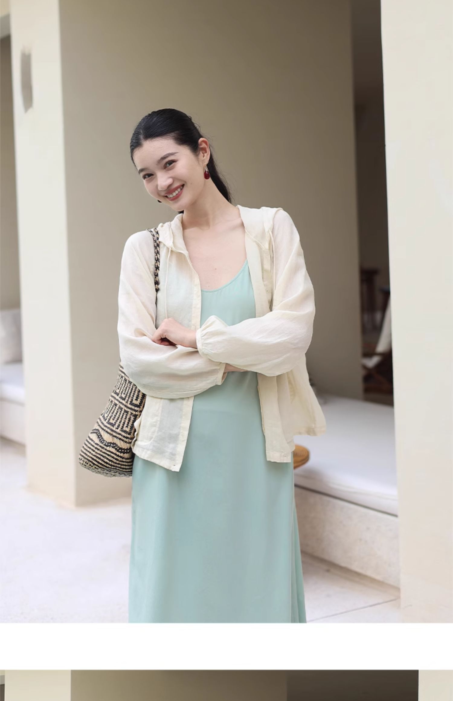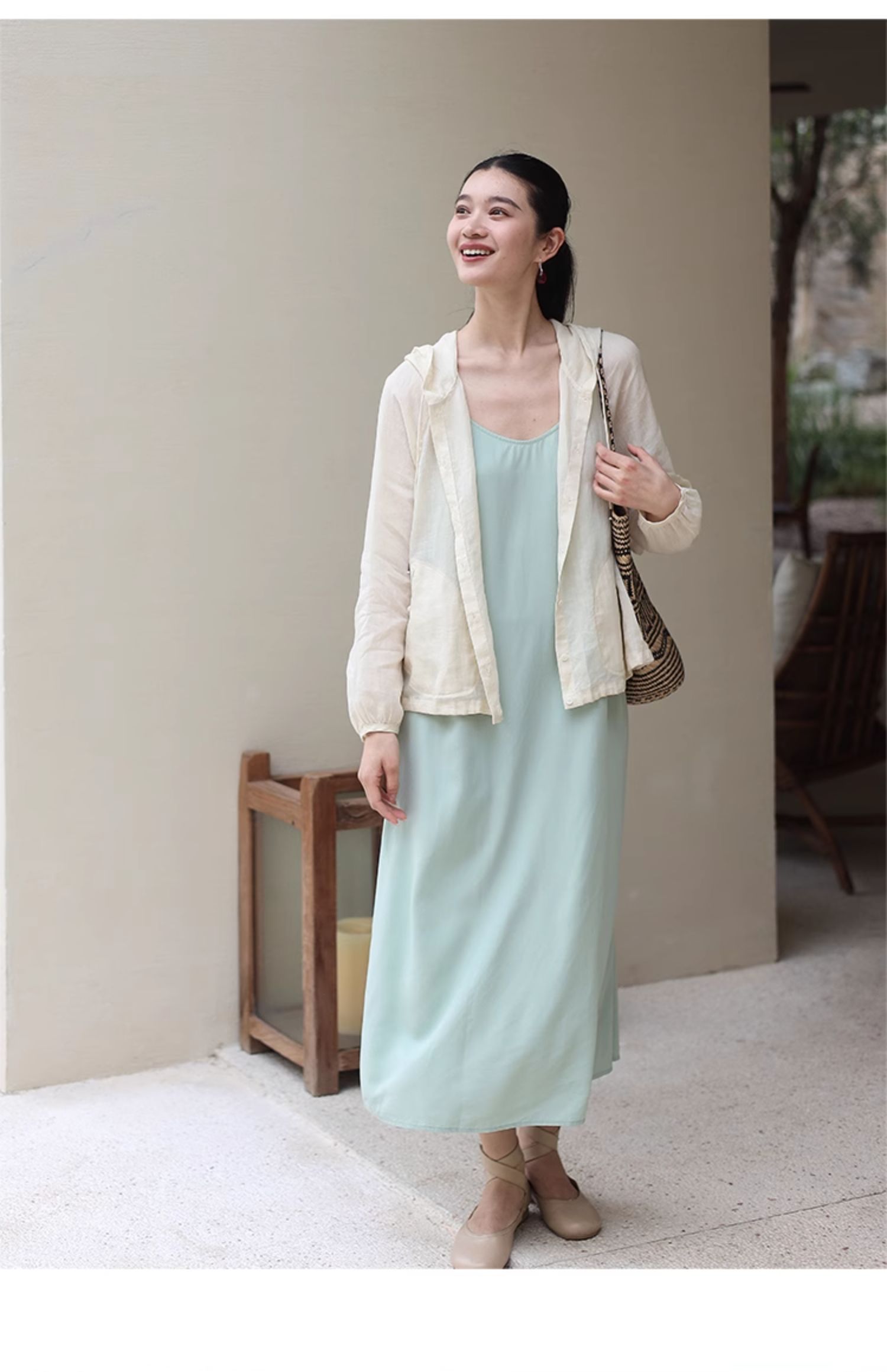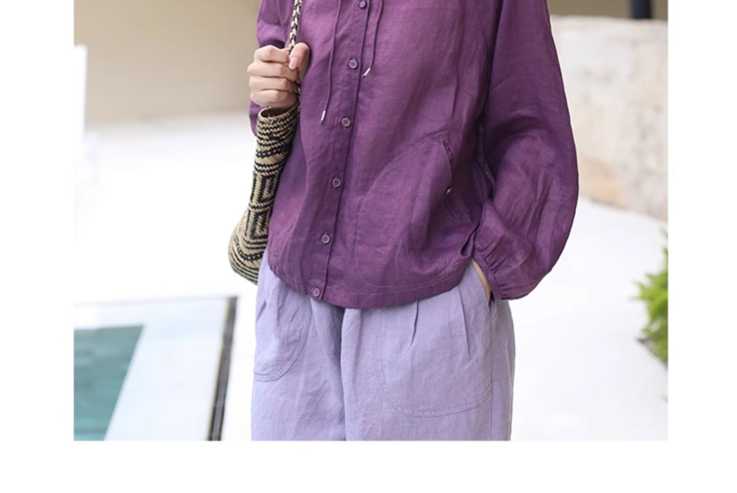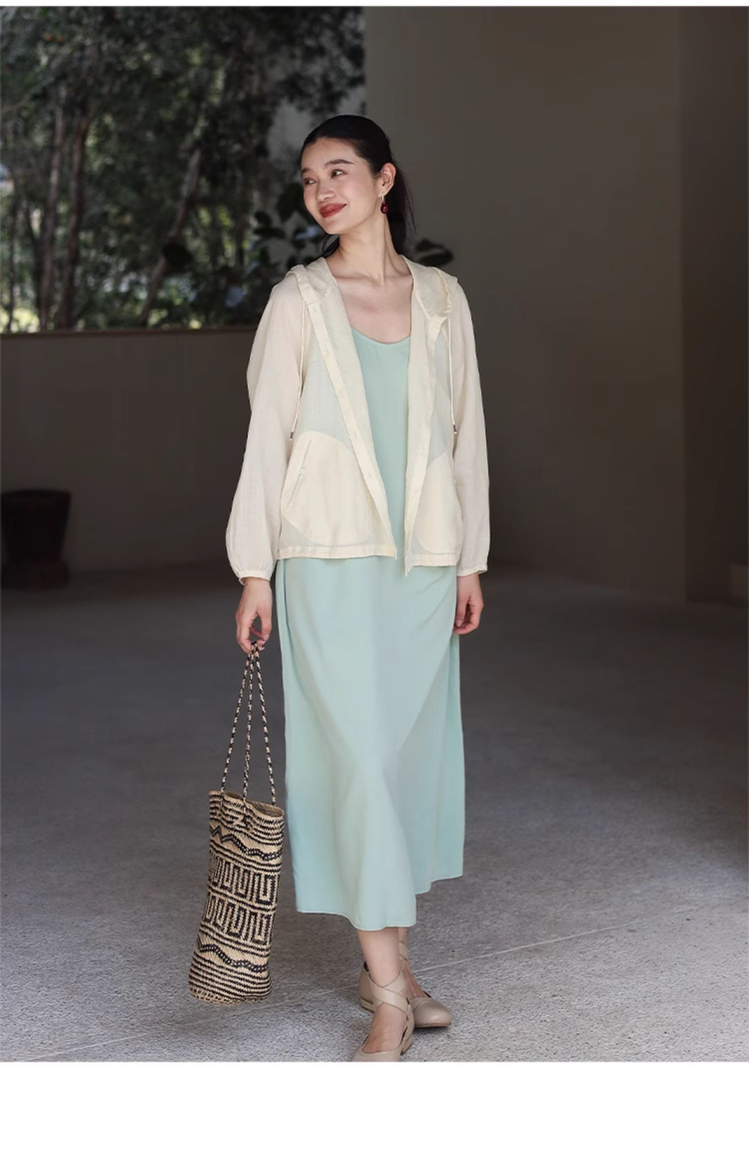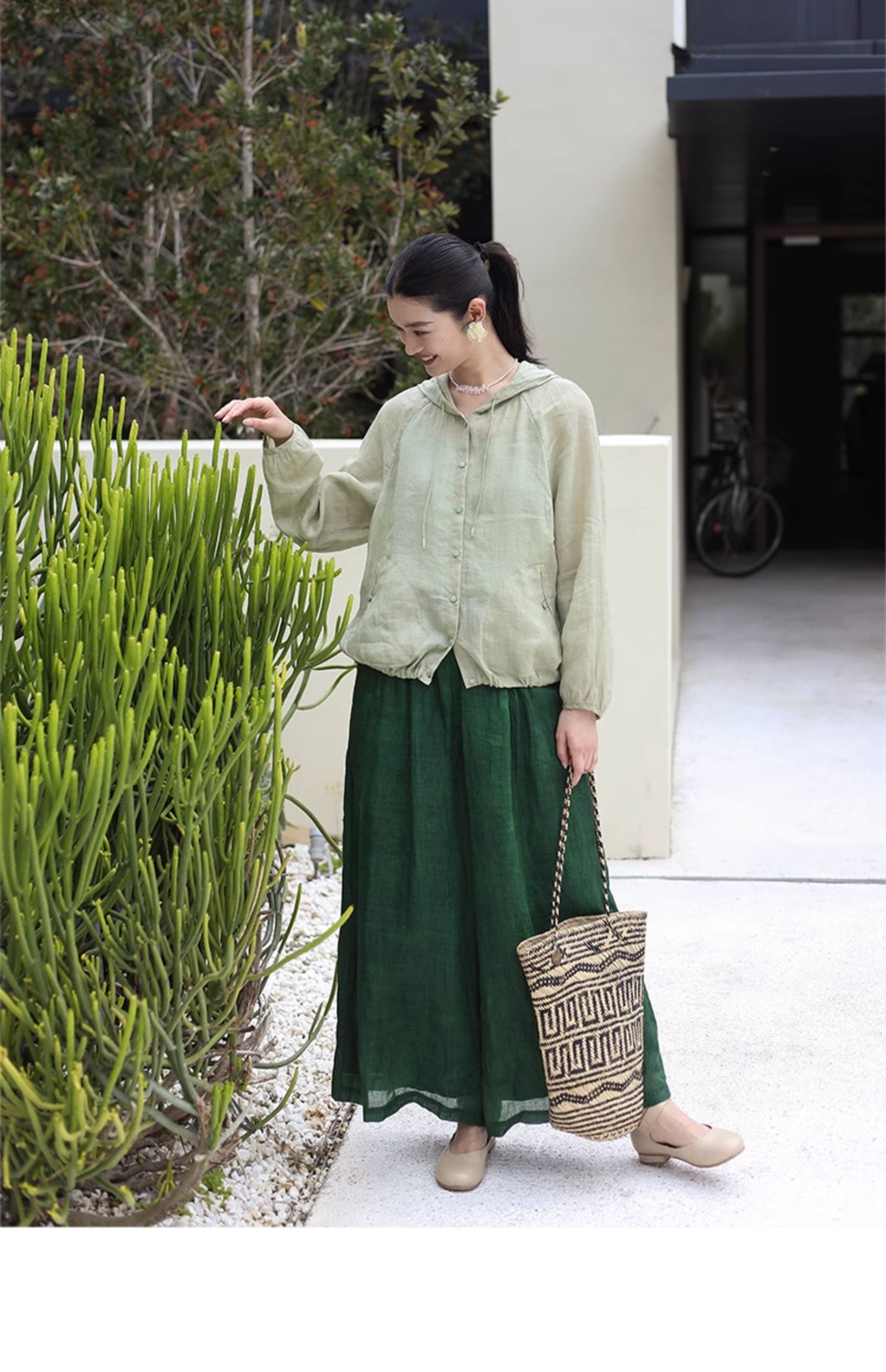 绽放164朵/竹林四侠防晒衫砂洗苎麻连帽开门襟下摆抽绳休闲上衣