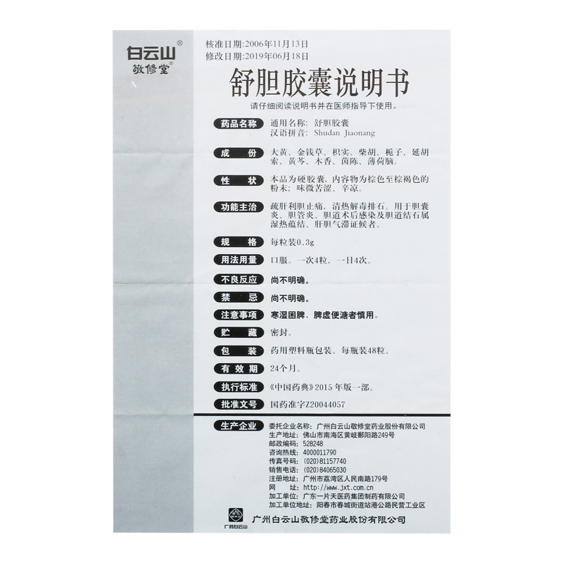 白云山舒胆胶囊48粒*1瓶结石性胆囊炎清热解毒舒肝利胆肝胆气滞慢性胆囊炎胆道术后感染湿热蕴结胆管炎止痛胆石症