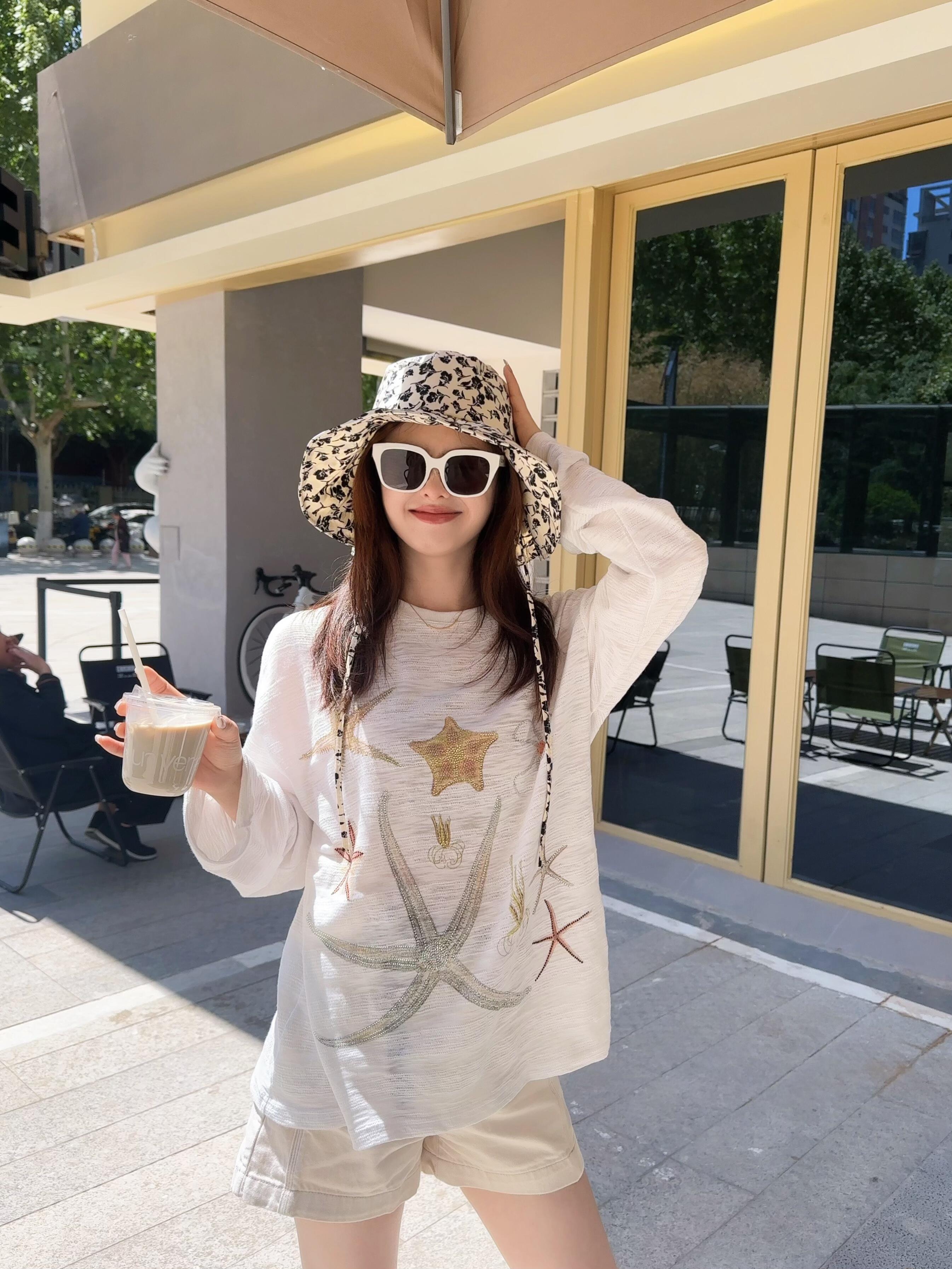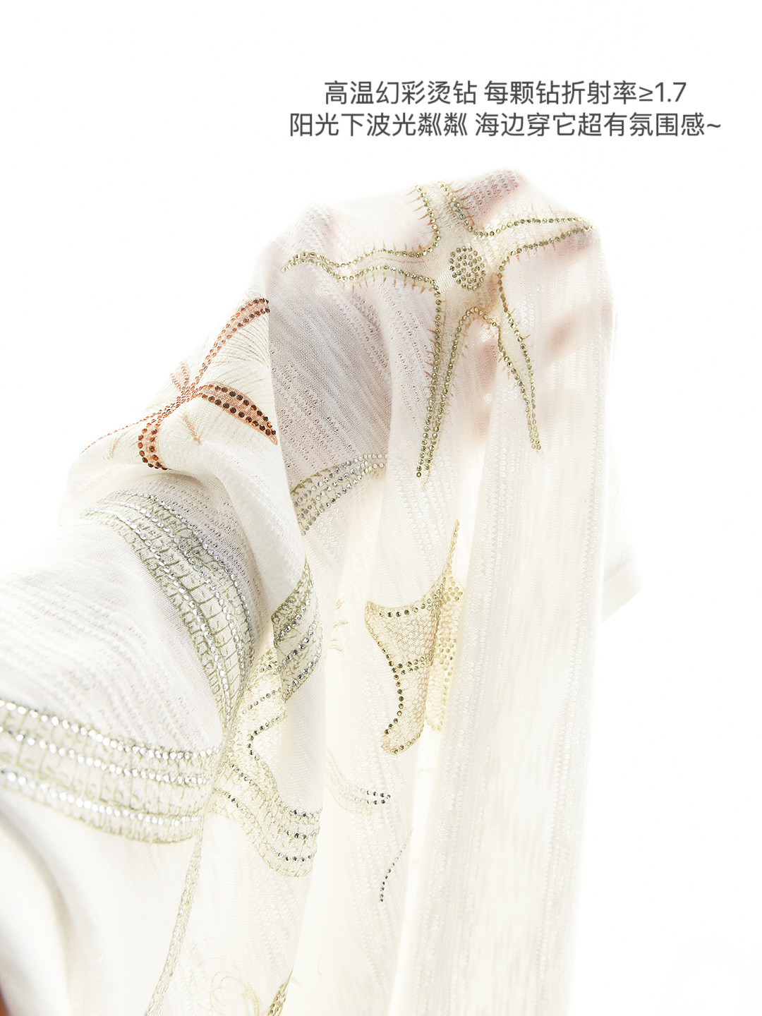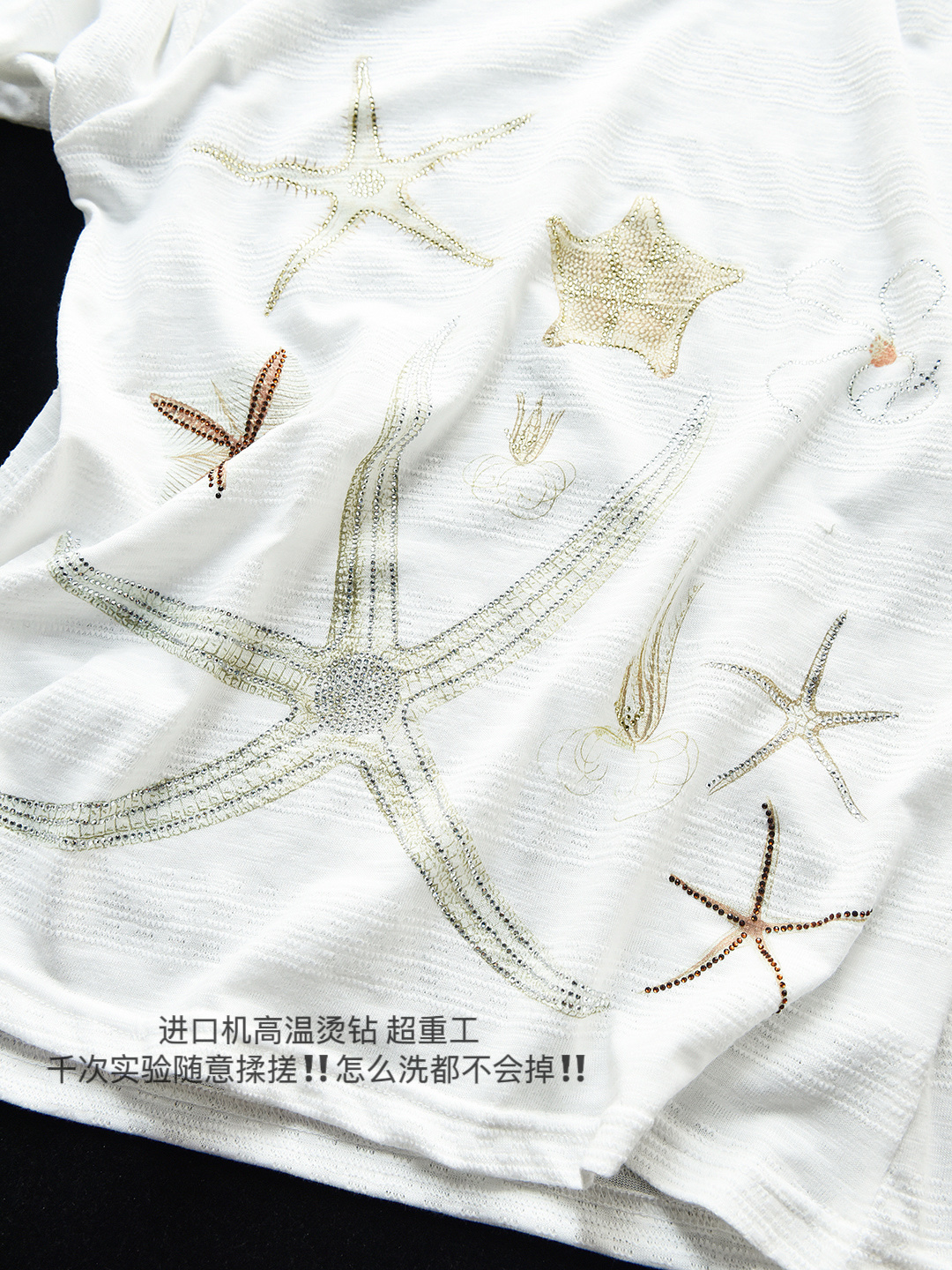两道工序先印刷后烫钻,高温幻彩烫钻每颗钻折射率,阳光下波光粼粼,海边穿它超有氛围感~自带波塞冬滤镜~