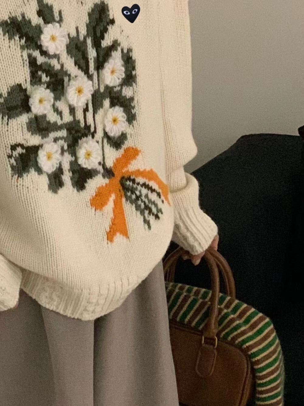 手工花粗线针织毛衣,整体是宽松的oversize版型,看起来温暖又有松弛感。衣身用立体的针织工艺做出了一簇浅紫色小花和深绿色枝叶的图案,花朵有明显的凸起感,让整体更有层次感 左侧还点缀了一个浅蓝色的针织蝴蝶结,给温柔的风格里加了点俏皮感。搭配上,它和黑色的灯芯绒半裙、棕色乐福鞋组合,再加上米色帆布包,整体是很舒服的“韩系松弛感穿搭”,既适合日常出门,又能在保暖的同时穿出清新文艺的气质。