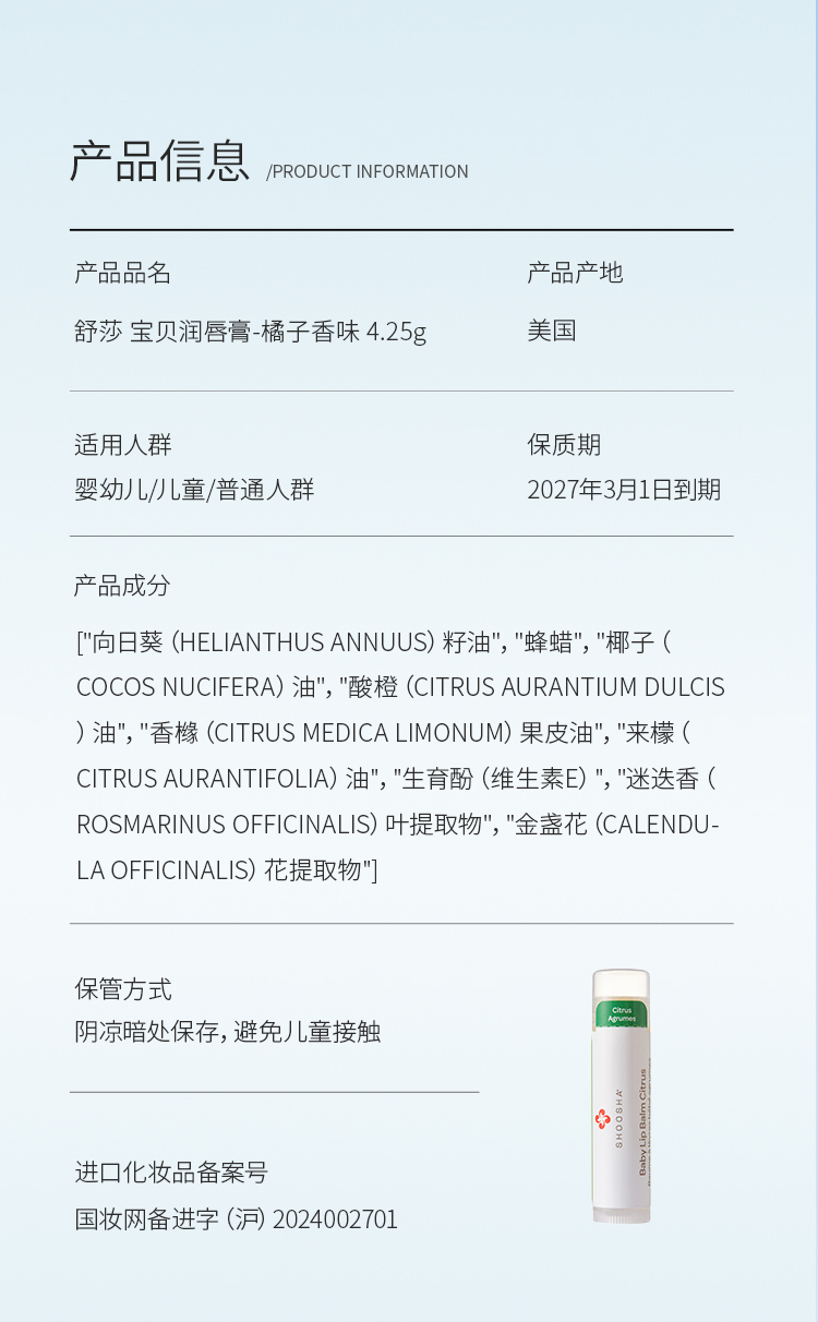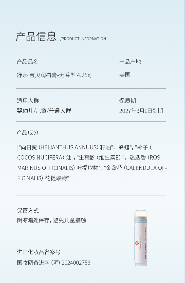 加拿大有机母婴品牌SHOOSHA舒莎 · 宝贝润唇膏 4.25g|品牌直发