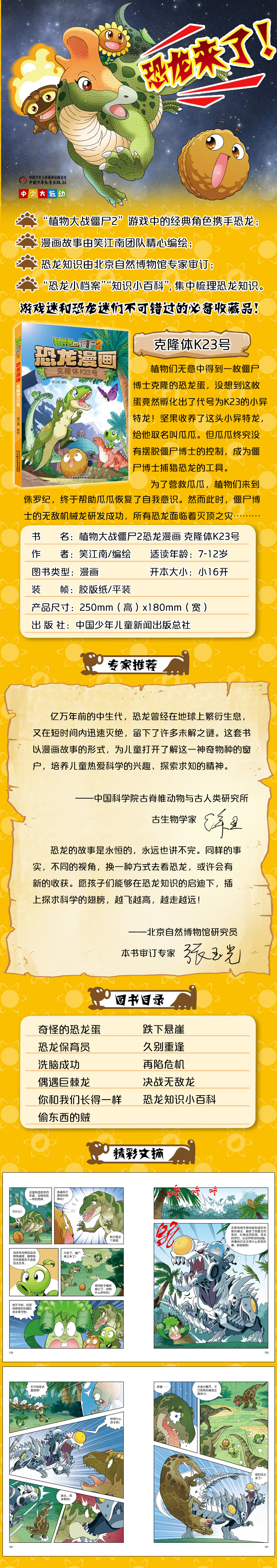 “植物大战僵尸2恐龙漫画”系列图书是中少大低幼为游戏迷和恐龙迷们打造的一套寓教于乐的科普漫画故事书。这套书将“植物大战僵尸2”游戏中的经典角色豌豆射手、菜问、坚果、红针花等带到遥远的中生代,与恐龙这一神奇生物相遇,共度一场场充满冒险与欢乐的旅程,同时也为小读者打开解恐龙的一扇窗。《克隆体K23号》是其中一册。