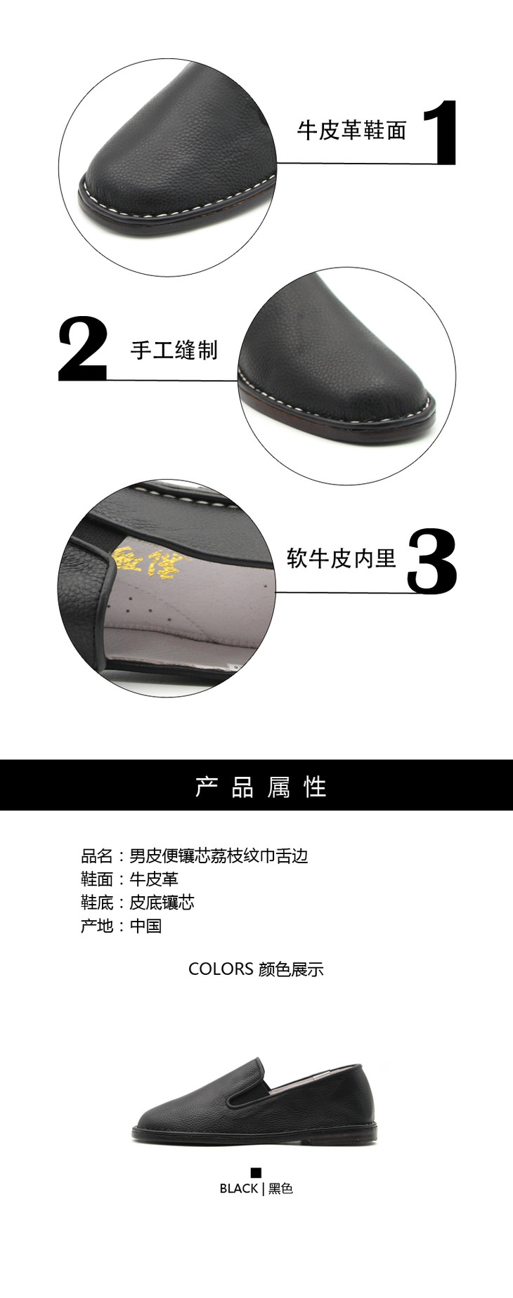 内联升男鞋手工单鞋千牛皮镶芯底柔软透气荔枝纹巾舌边布鞋7139A