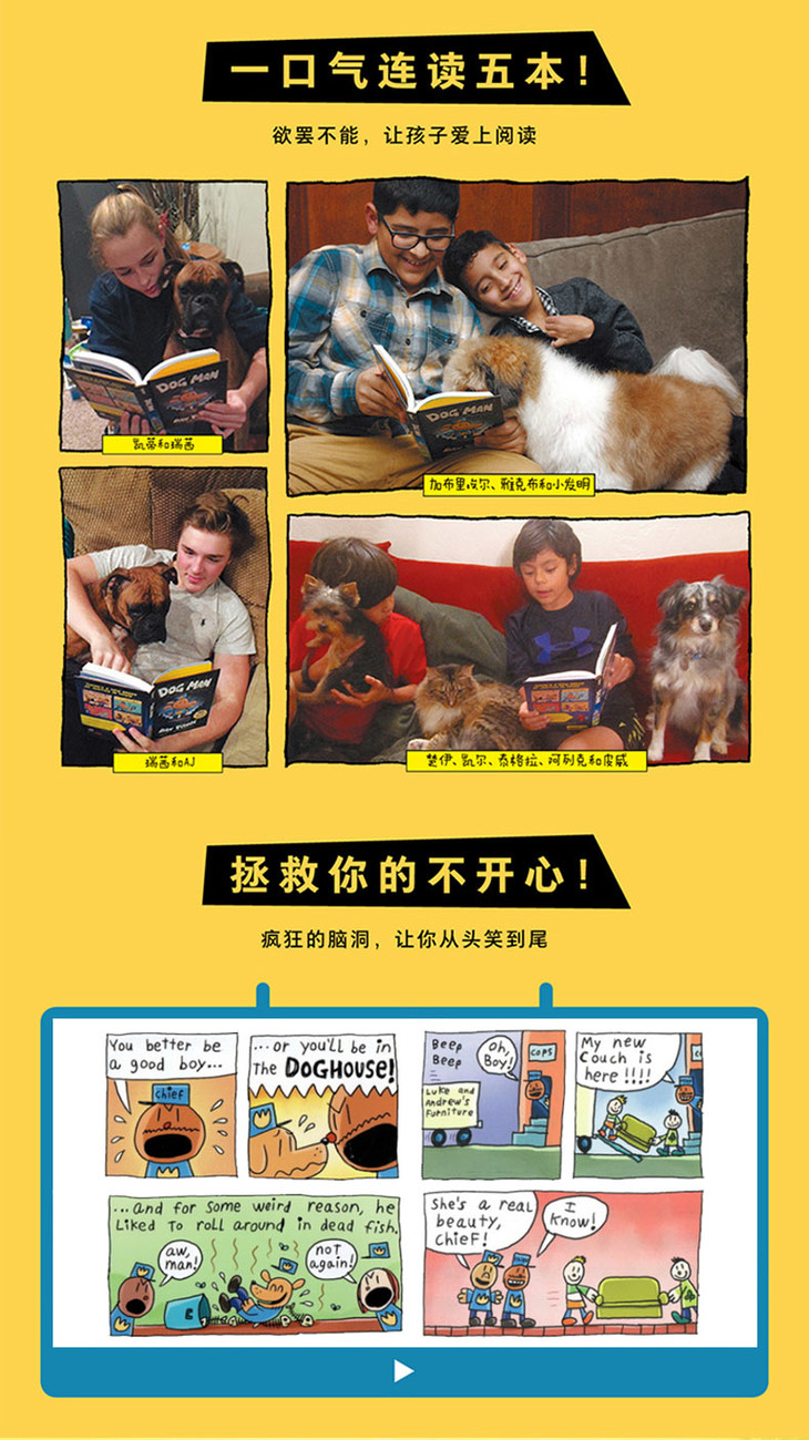 Dog man是一套诙谐幽默的全彩系列漫画,非常适合作为6-12岁小朋友从图画书过渡到文字书的“桥梁”读物。