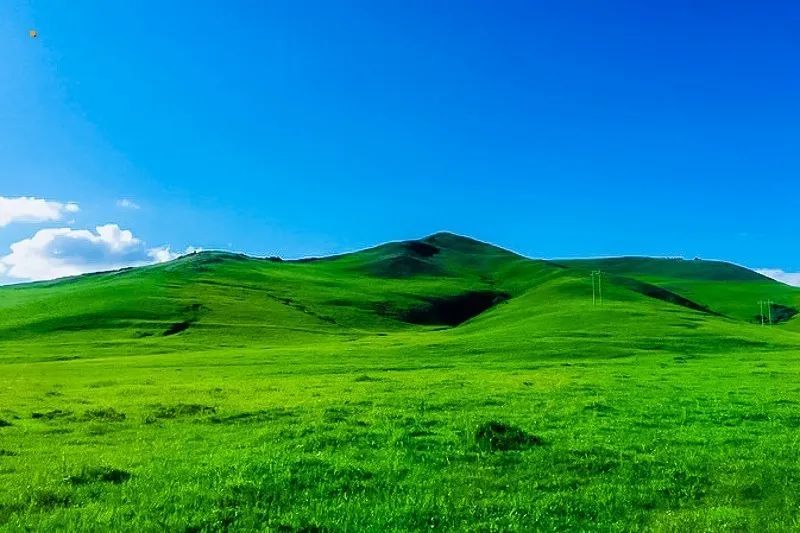 点点野花点缀在绿茵如毯的草原上