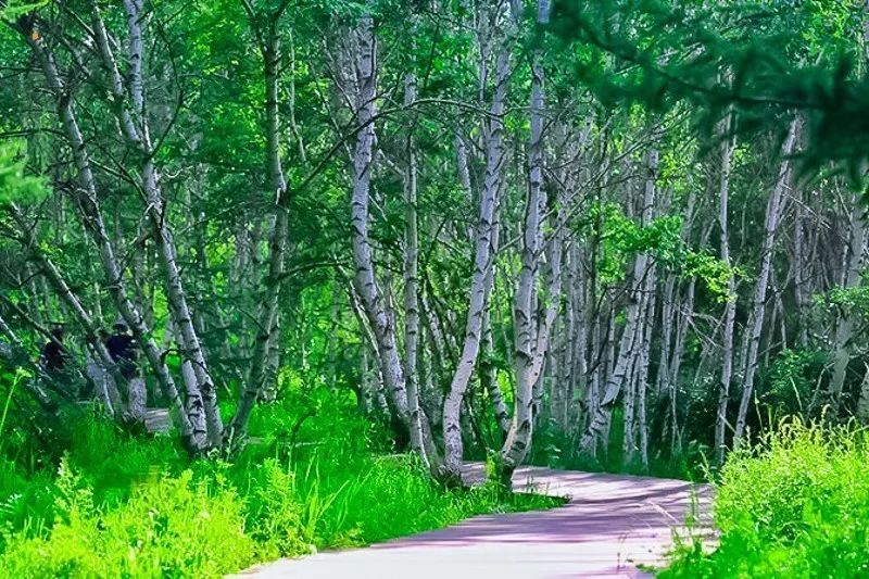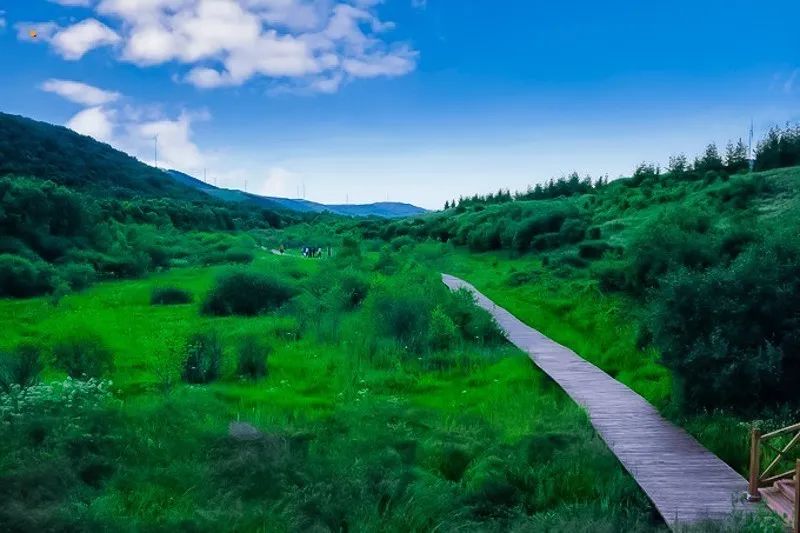 七彩森林占地23000多亩,具有草原、森林、湿地、丘陵、湖泊等丰富的自然资源,森林覆盖面积在80%以上。木栈道全程大约3公里,边走边看,一路走下来走了近两个小时,抵达天境湖时,太阳已经快要落山了,夕阳映照着朵朵云霞,远处的绿色与天际接壤,景色令人陶醉。