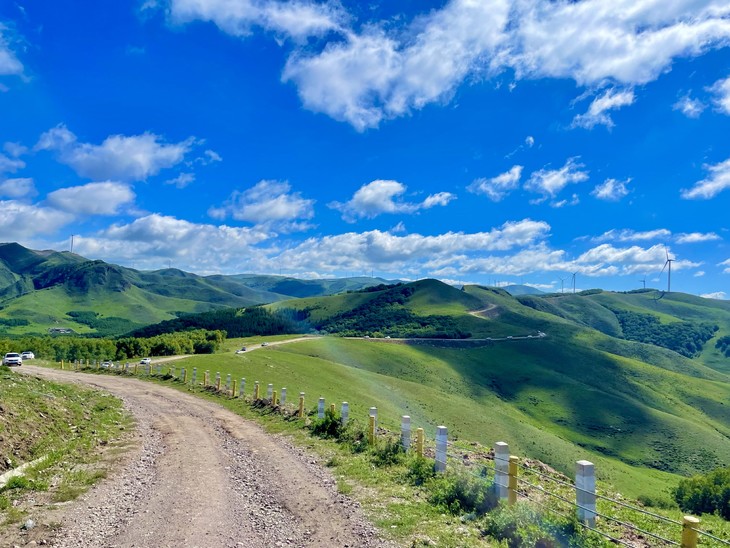 海拔1700多米的坝上草原,仲夏6月,谷底紫色野玫瑰开在绿色草甸上,一望无际。缓坡向上,华北地区最大的白桦林布满不高的山岭,白色的树干支起随风摇摆的树叶沙沙作响,不知叙述着多少美丽的传说······