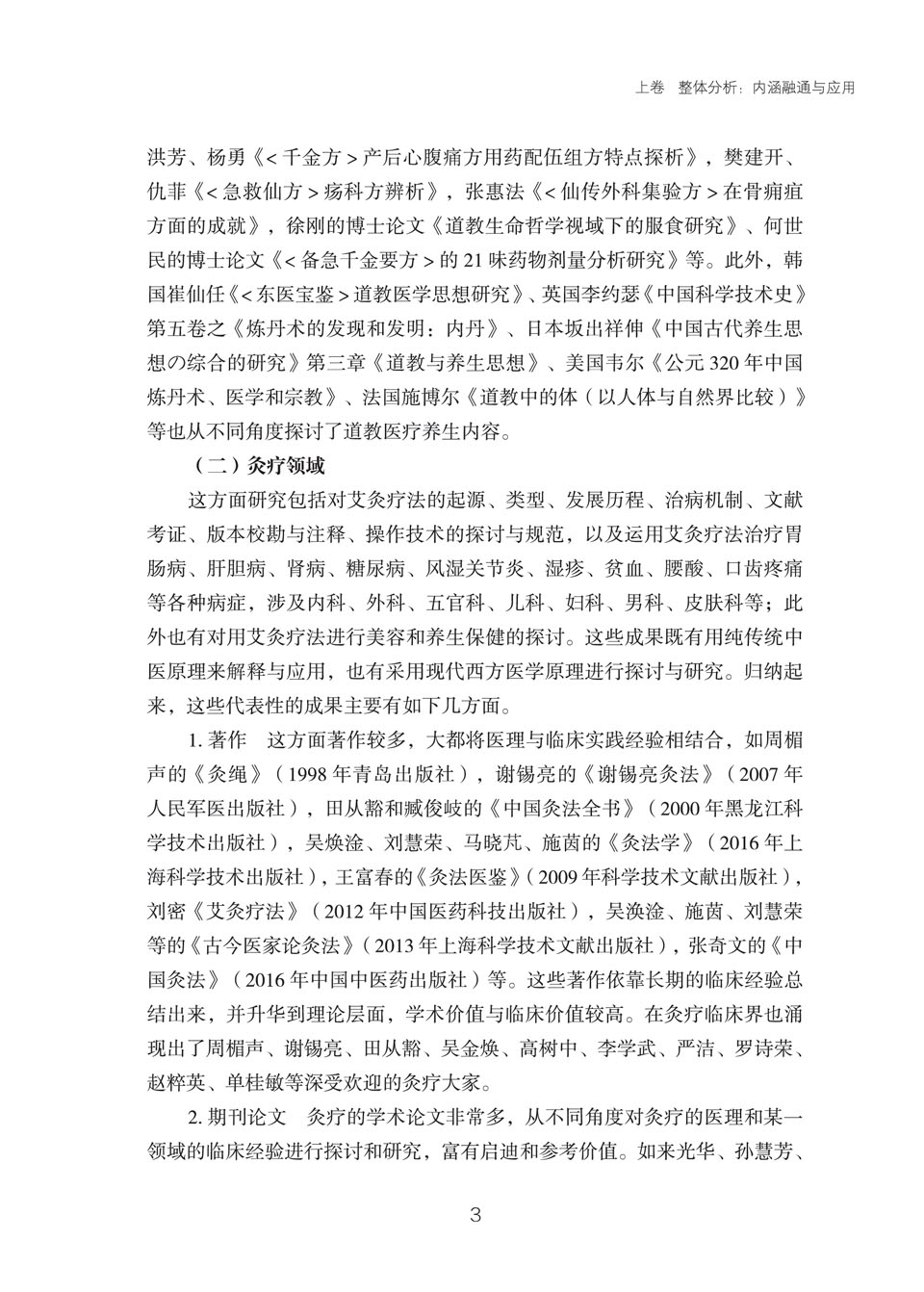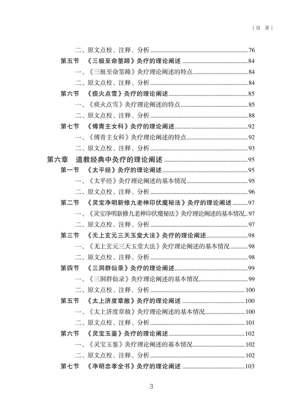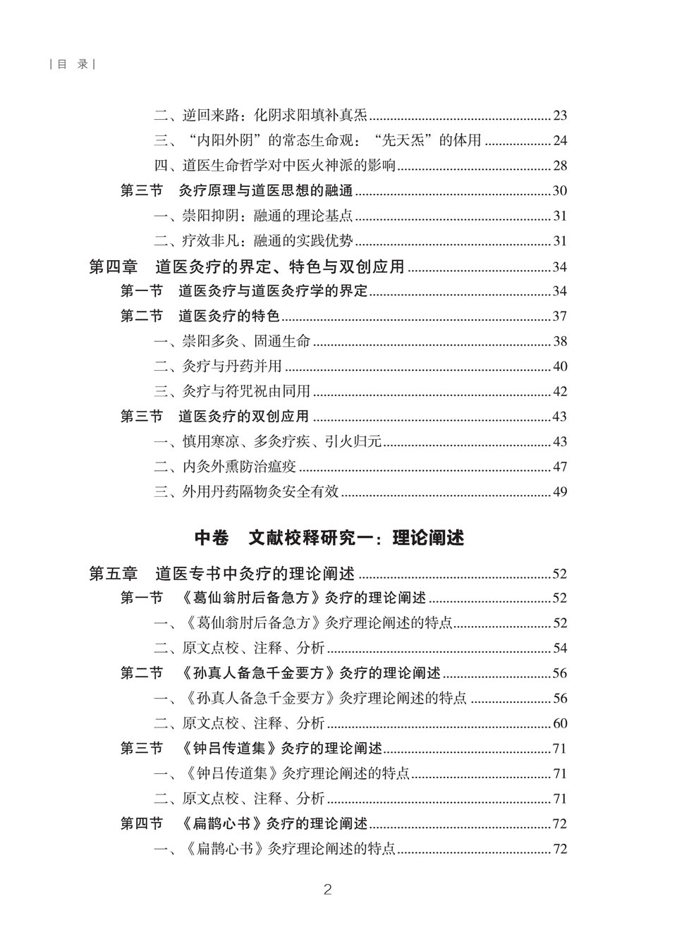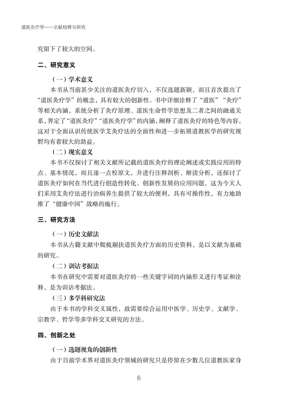 本书是目前学术界初次尝试构建“道医灸疗学”的学术著作,从当前甚少关注的道医灸疗切入,以体现学术性、创新性为导向,集宏观研究与微观研究于一体,分为上、中、下三卷,共八章。上卷《整体分析:内涵融通与应用》,首先诠释“道医”“灸疗”等相关内涵,进而分析灸疗原理、道医生命哲学思想及二者之间的融通关系,最后界定“道医灸疗”“道医灸疗学”的内涵,阐释道医灸疗的特色,并探讨其在当代的双创应用。中卷和下卷从大量历代医书、道教经典等文献中爬梳搜集出关于道医灸疗的记载,并进行细致解读与微观研究。中卷《文献校释研究一:理论阐述》侧重于“道医灸疗”的理论阐述,下卷《文献校释研究二:实践应用》侧重于“道医灸疗”的实践应用。中、下卷以每部文献为单位,皆首先分析该部文献中记载的道医灸疗的理论阐述或实践应用的特点、基本情况,进而对原文进行逐一点校,并注释剖析其中的疑难关键字词,最后逐段(或几个密切段落)进行解读分析。上卷与中、下卷的内容是总与分、宏观与微观的关系,旨在努力为“道医灸疗学”的构建进行尝试探索。