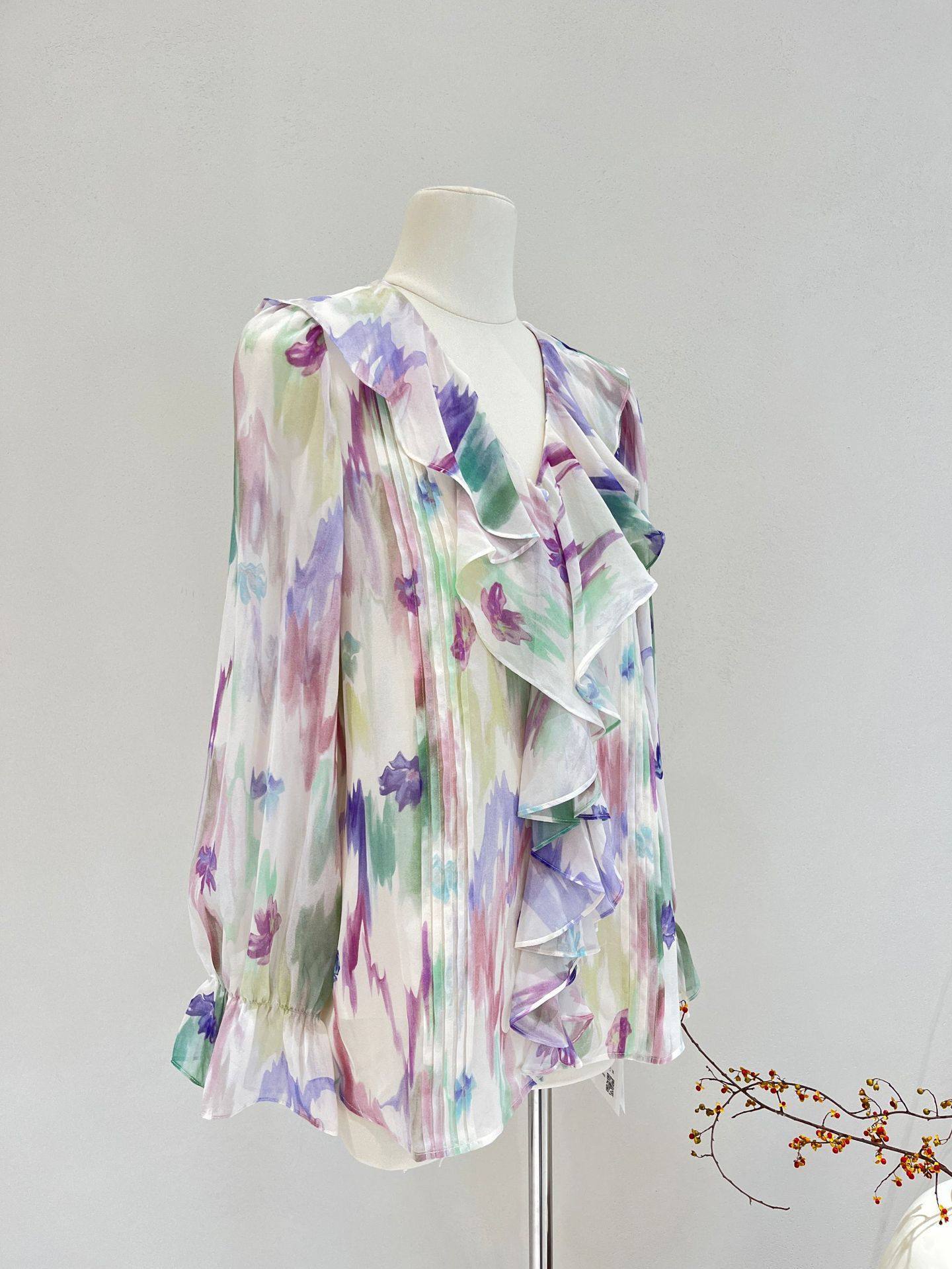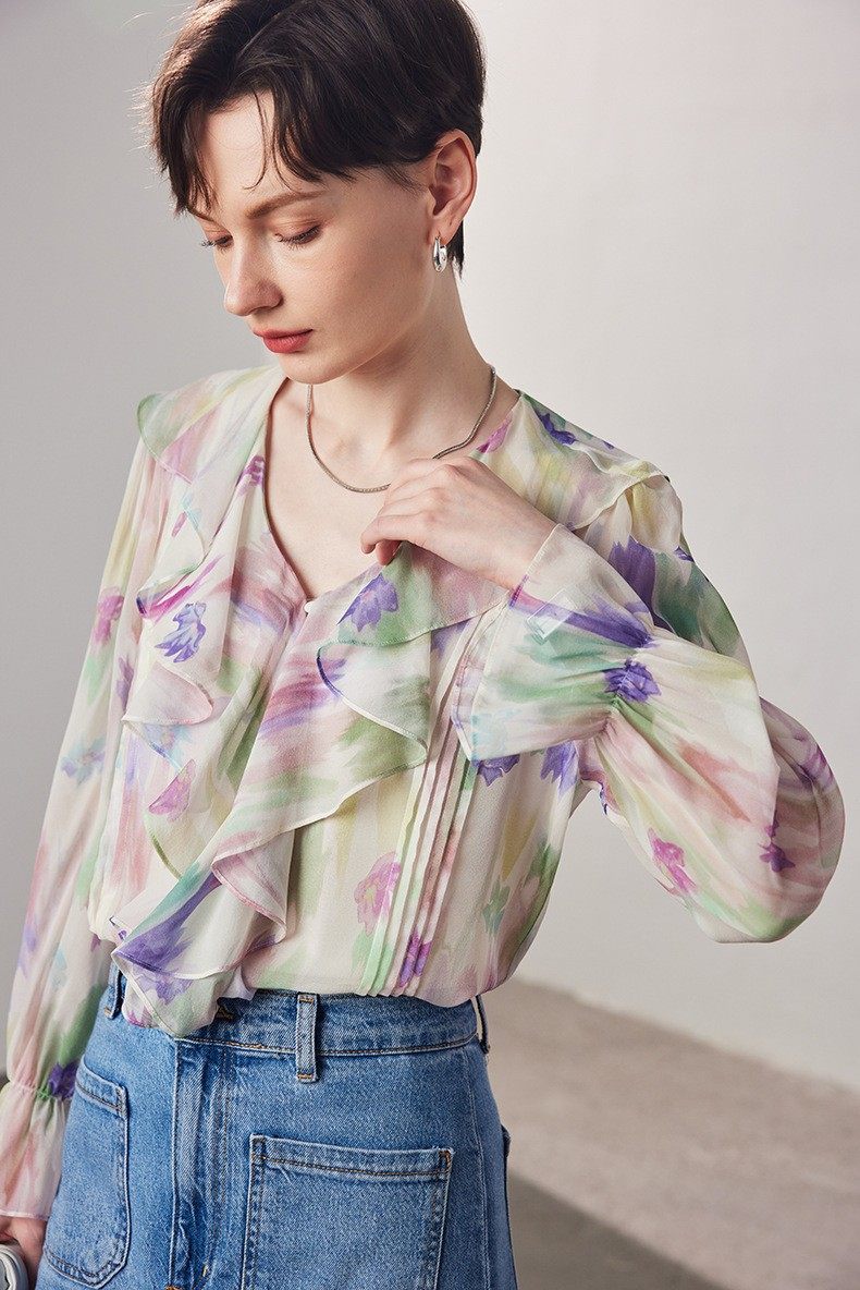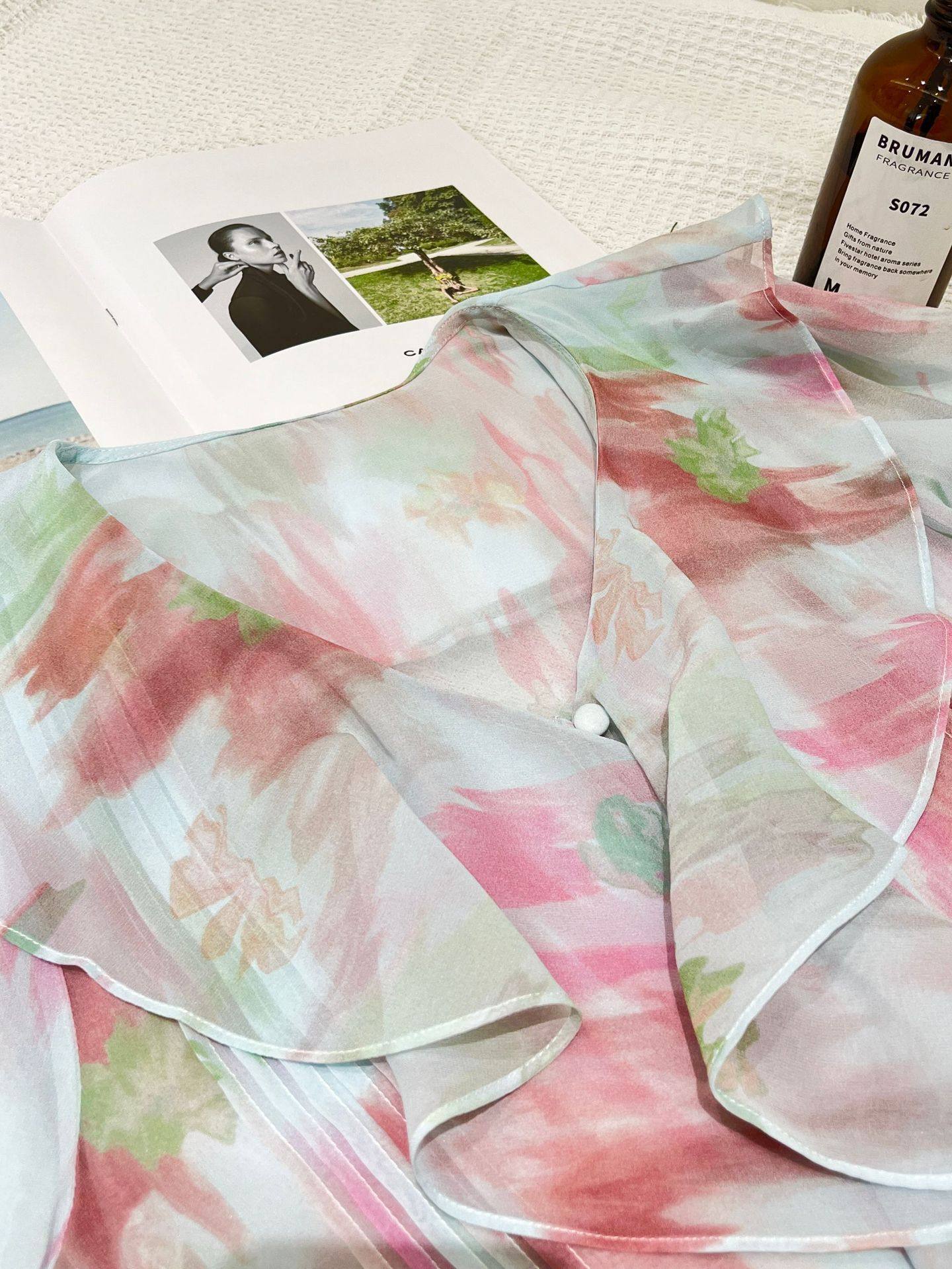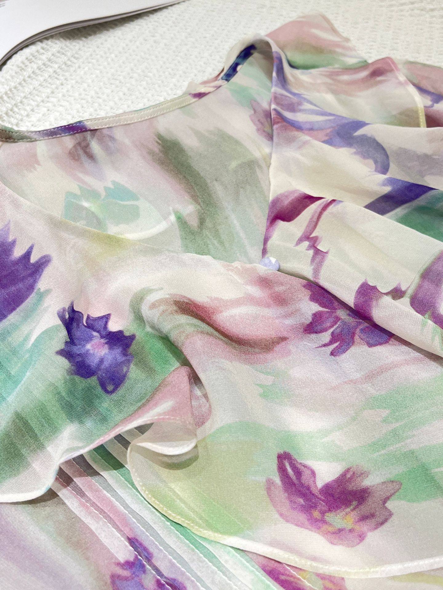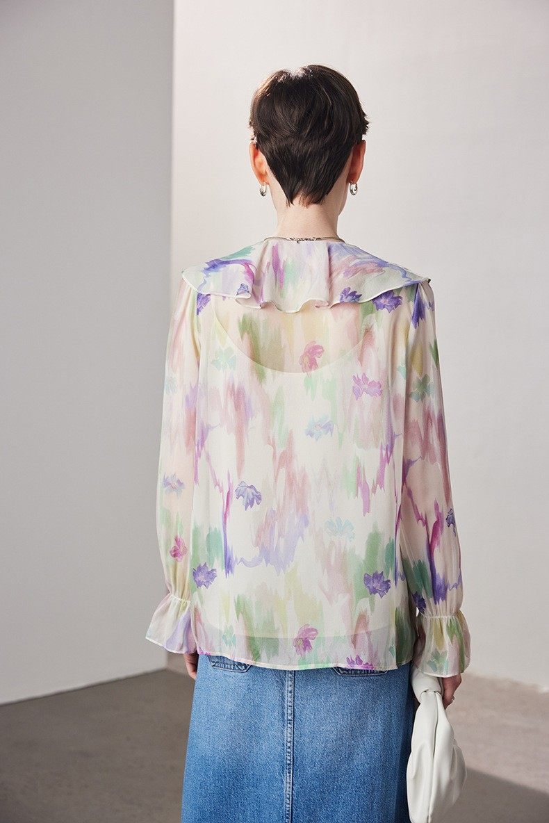 真丝衬衫女2025春夏新款乔其印花两件套荷叶边领100%桑蚕丝上衣