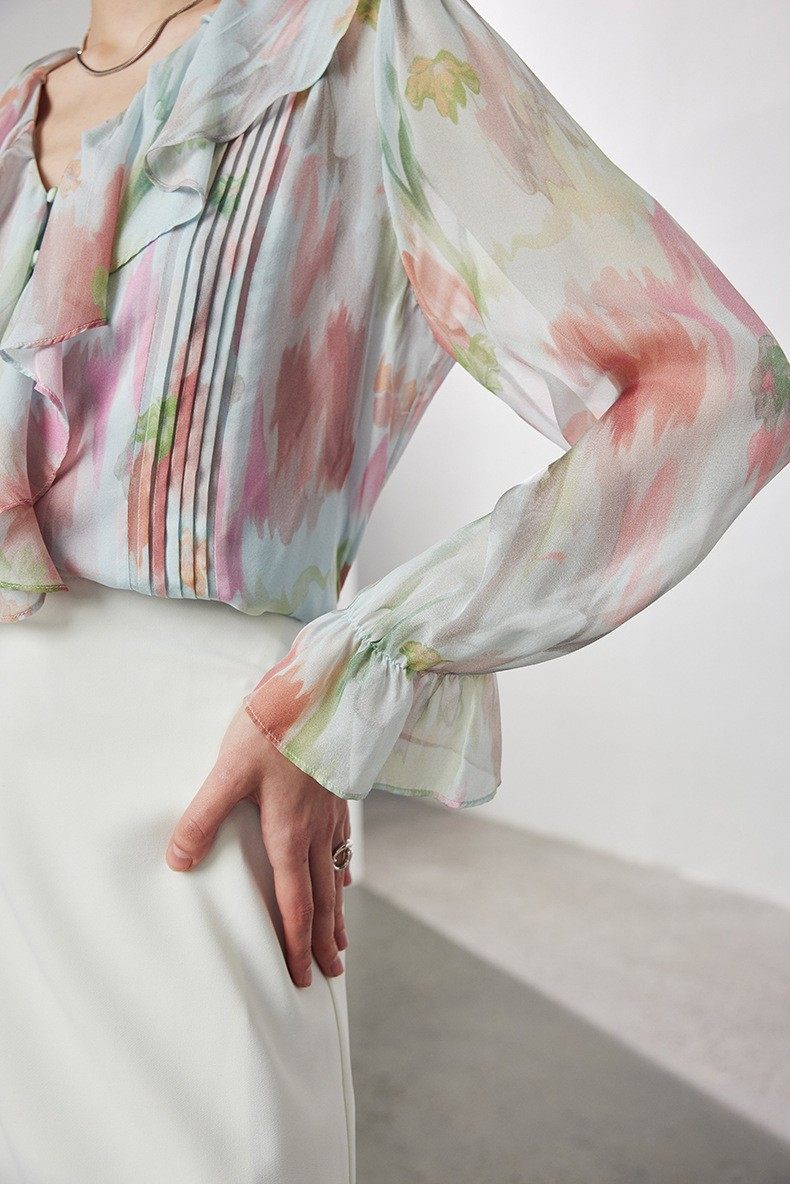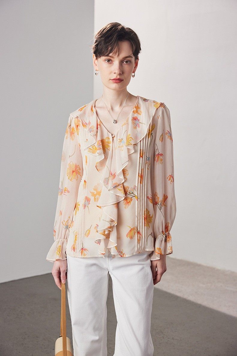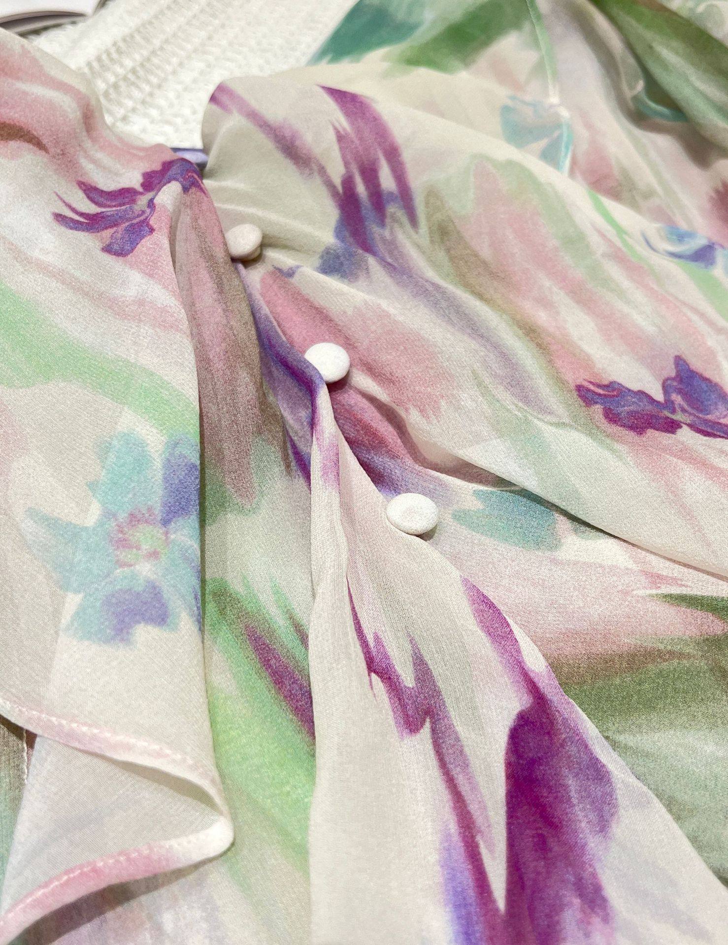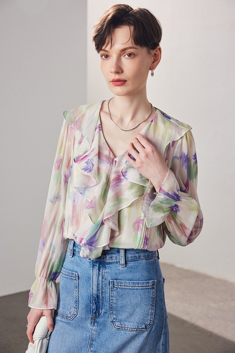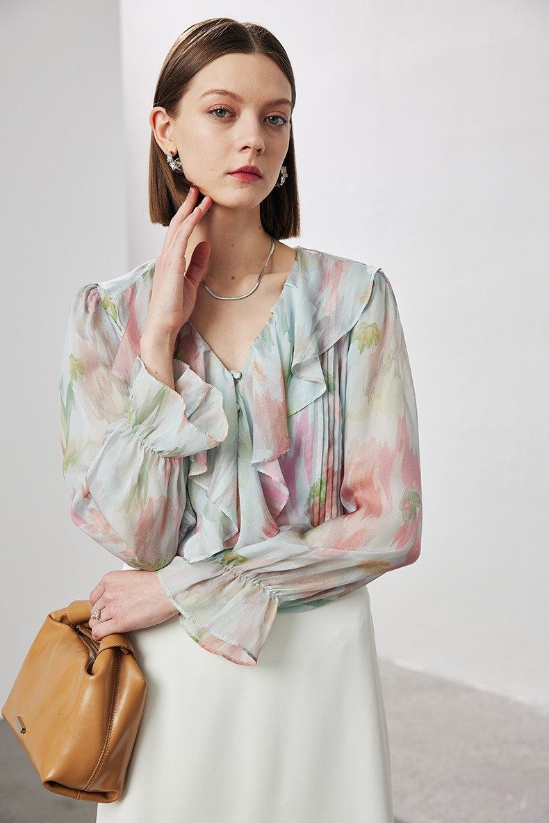 真丝衬衫女2025春夏新款乔其印花两件套荷叶边领100%桑蚕丝上衣