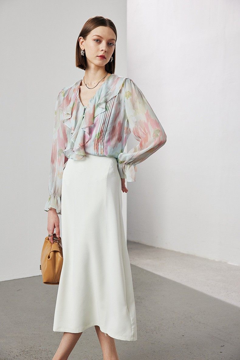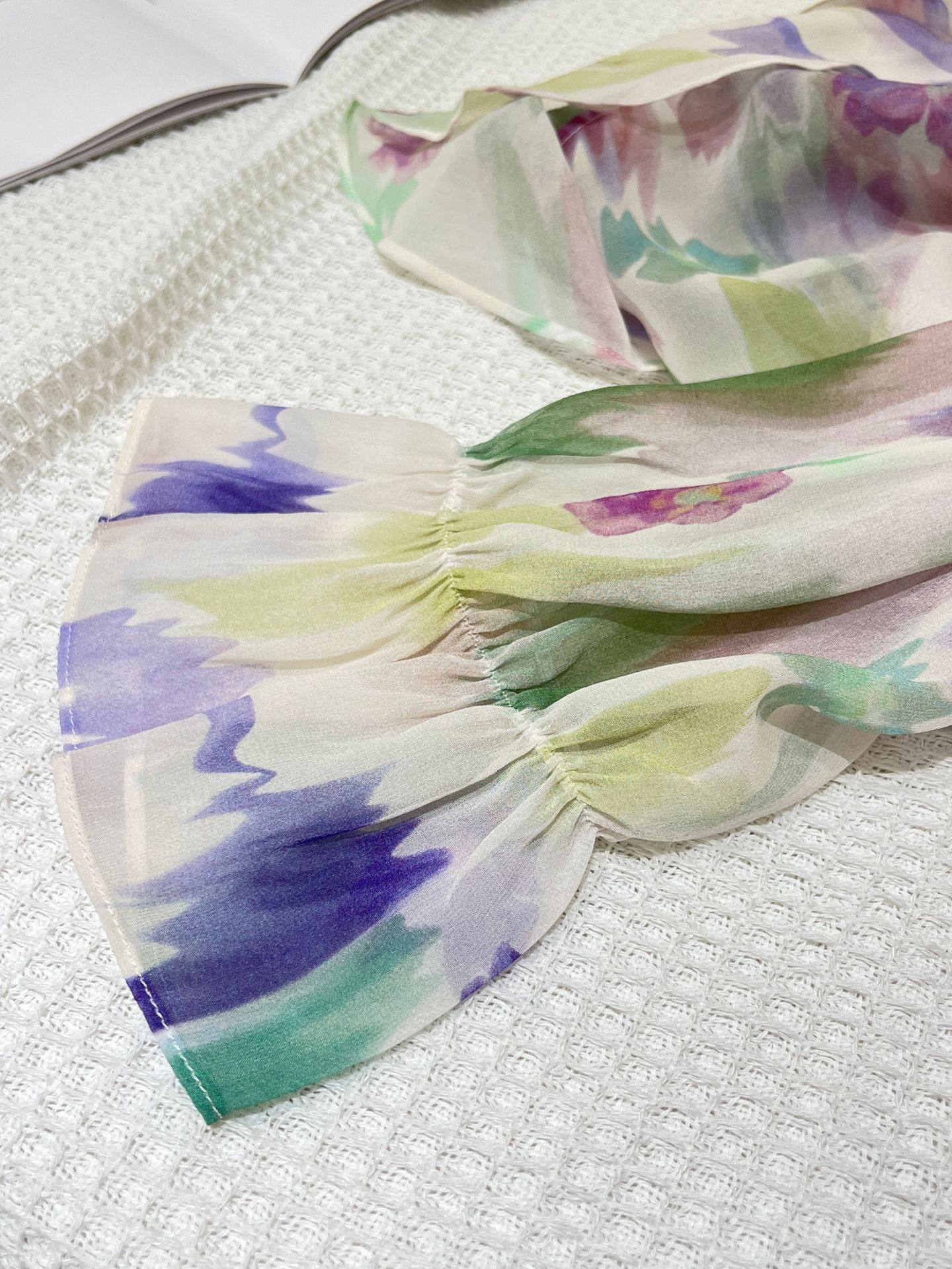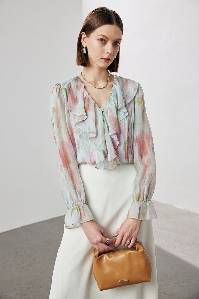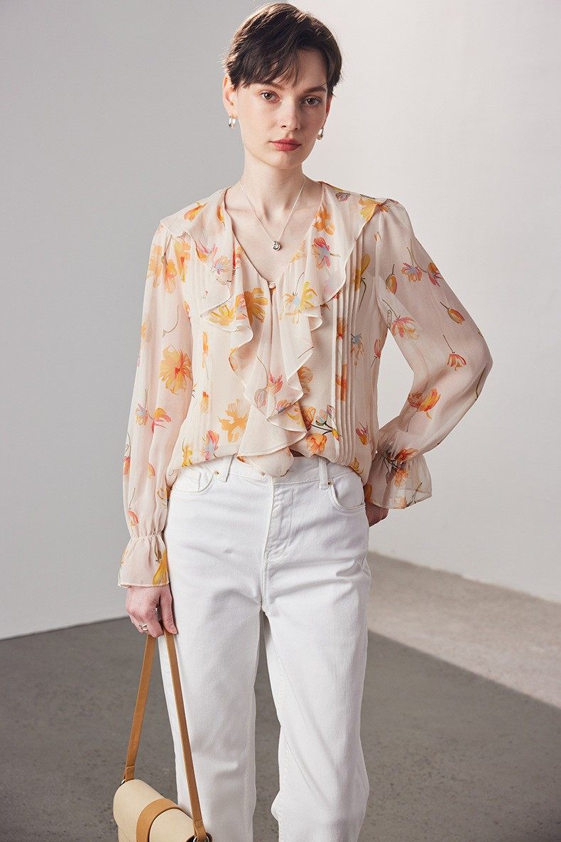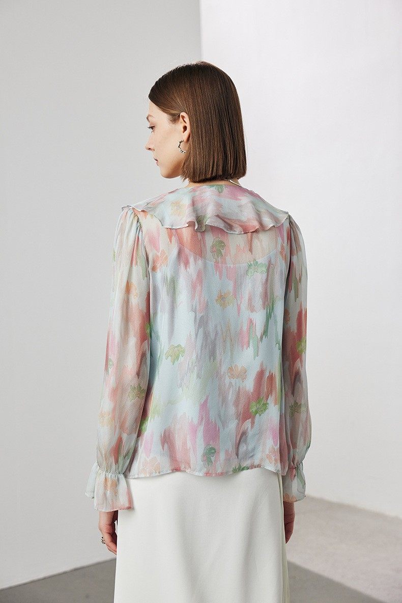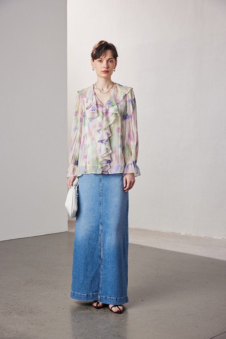 真丝衬衫女2025春夏新款乔其印花两件套荷叶边领100%桑蚕丝上衣