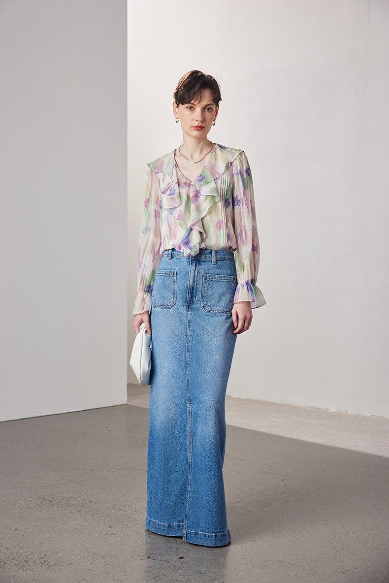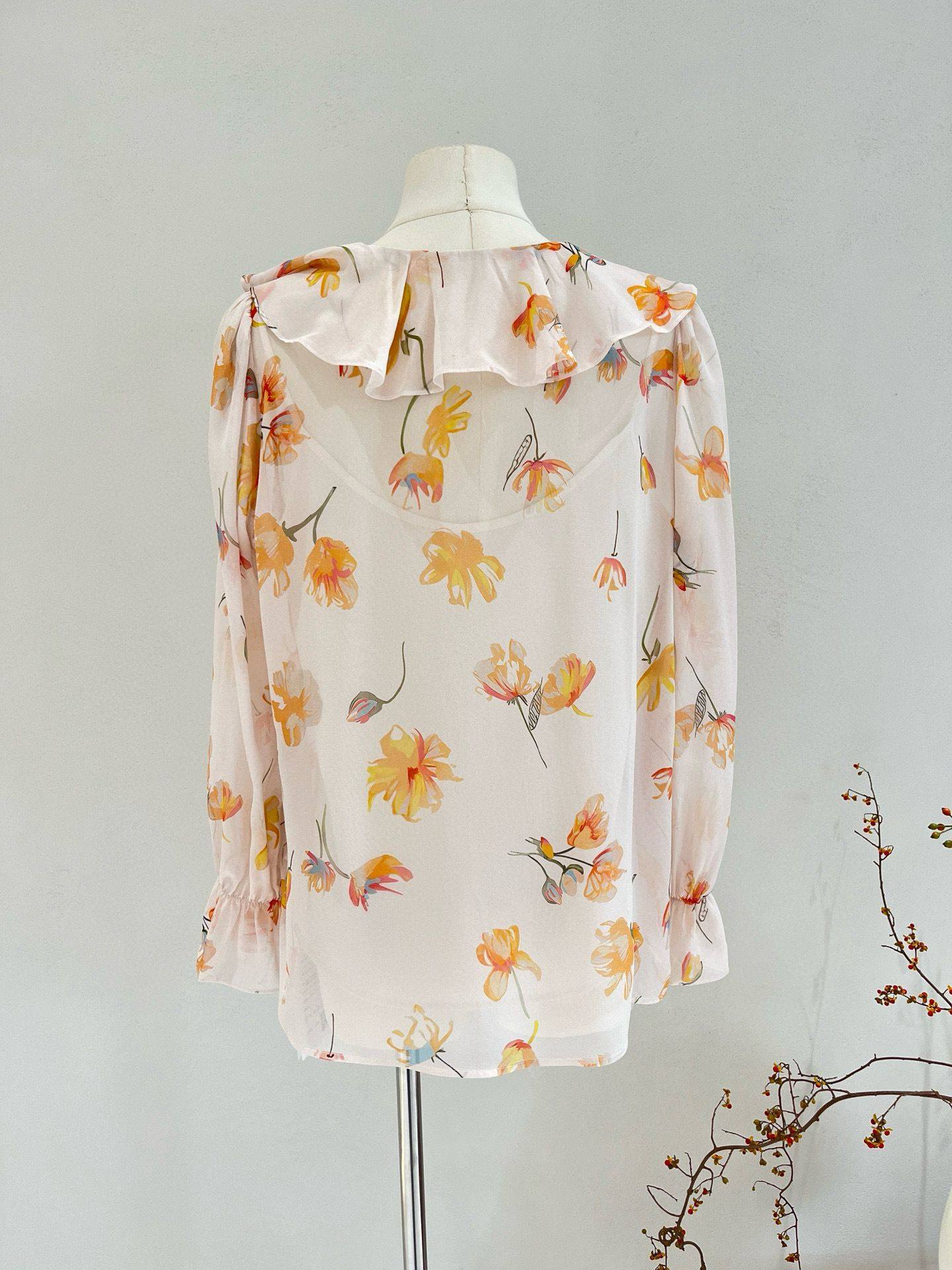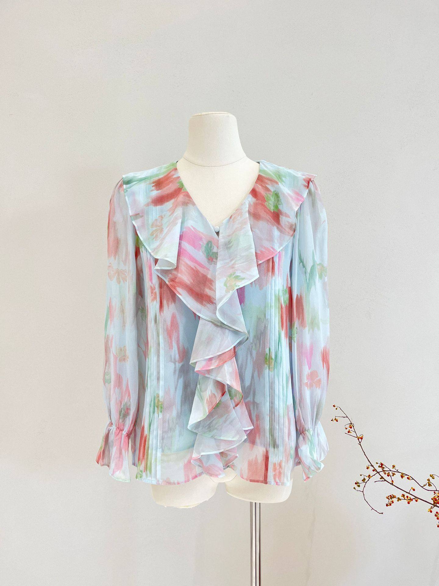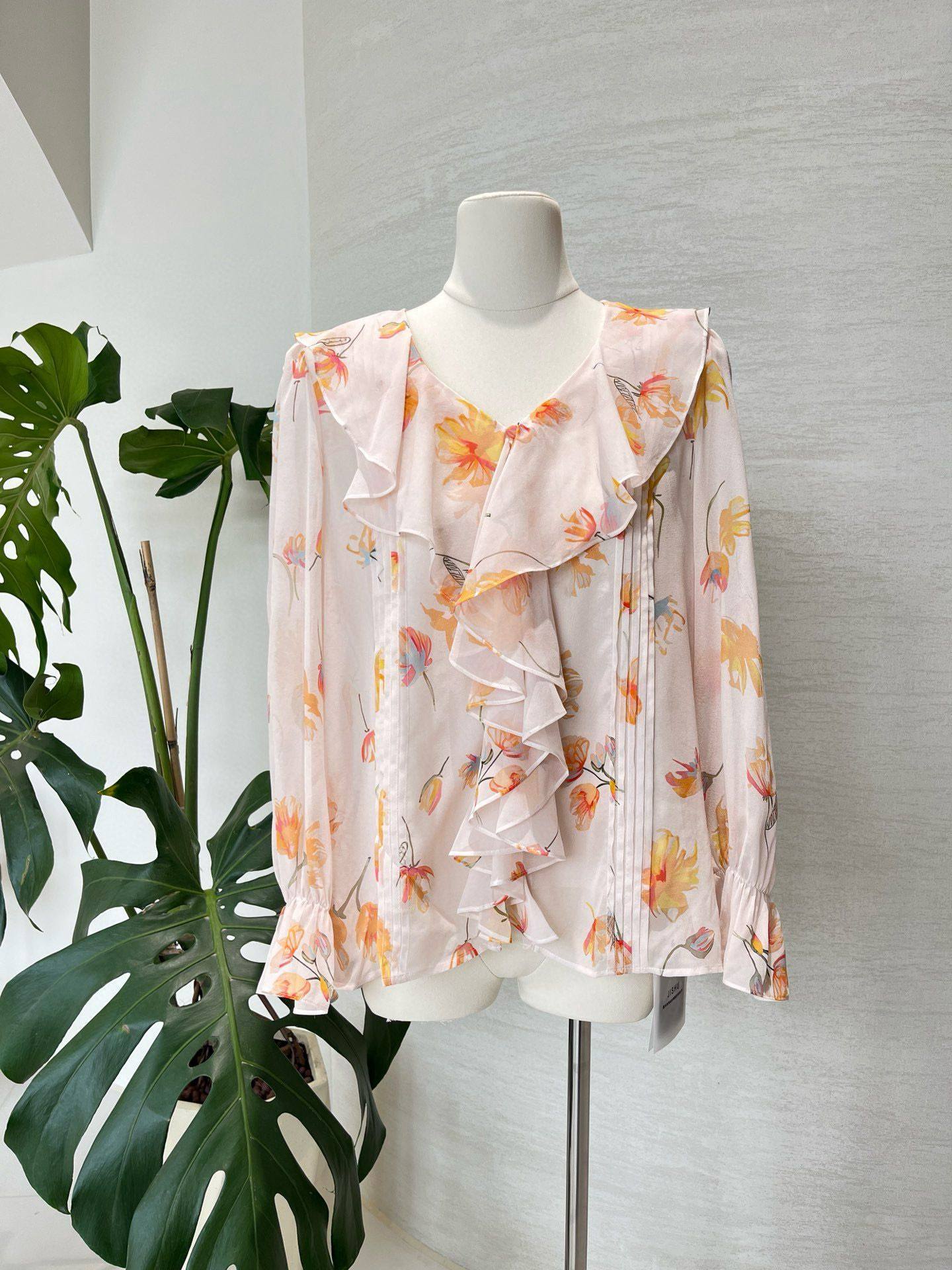 真丝衬衫女2025春夏新款乔其印花两件套荷叶边领100%桑蚕丝上衣