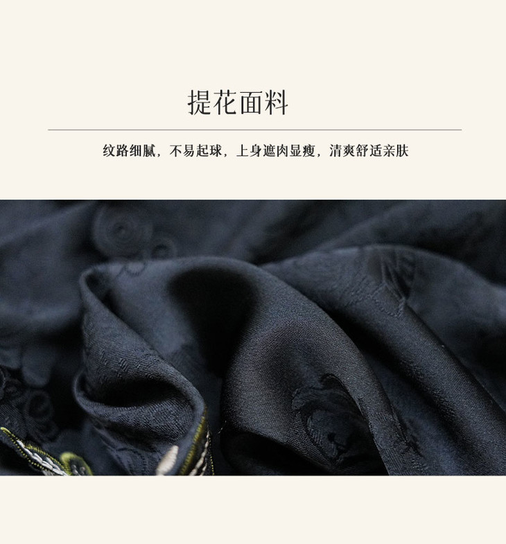 提花面料,含7.5%的氨纶,92.5%涤纶,纹路细腻,不易起球,上身遮肉显瘦,清爽舒适亲肤。