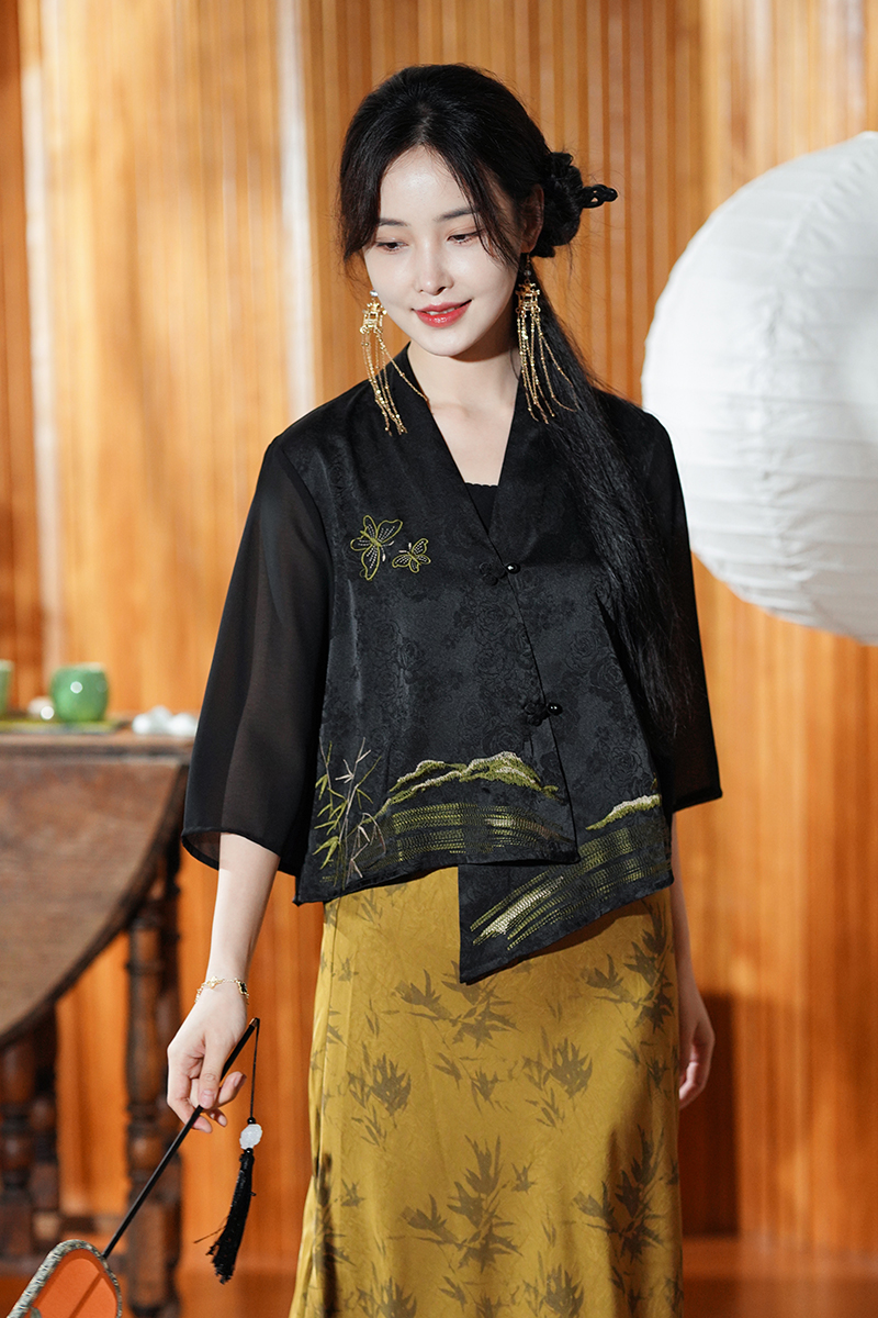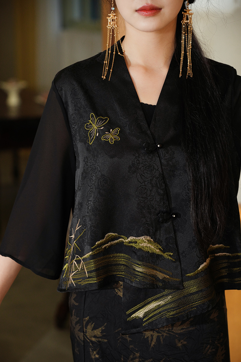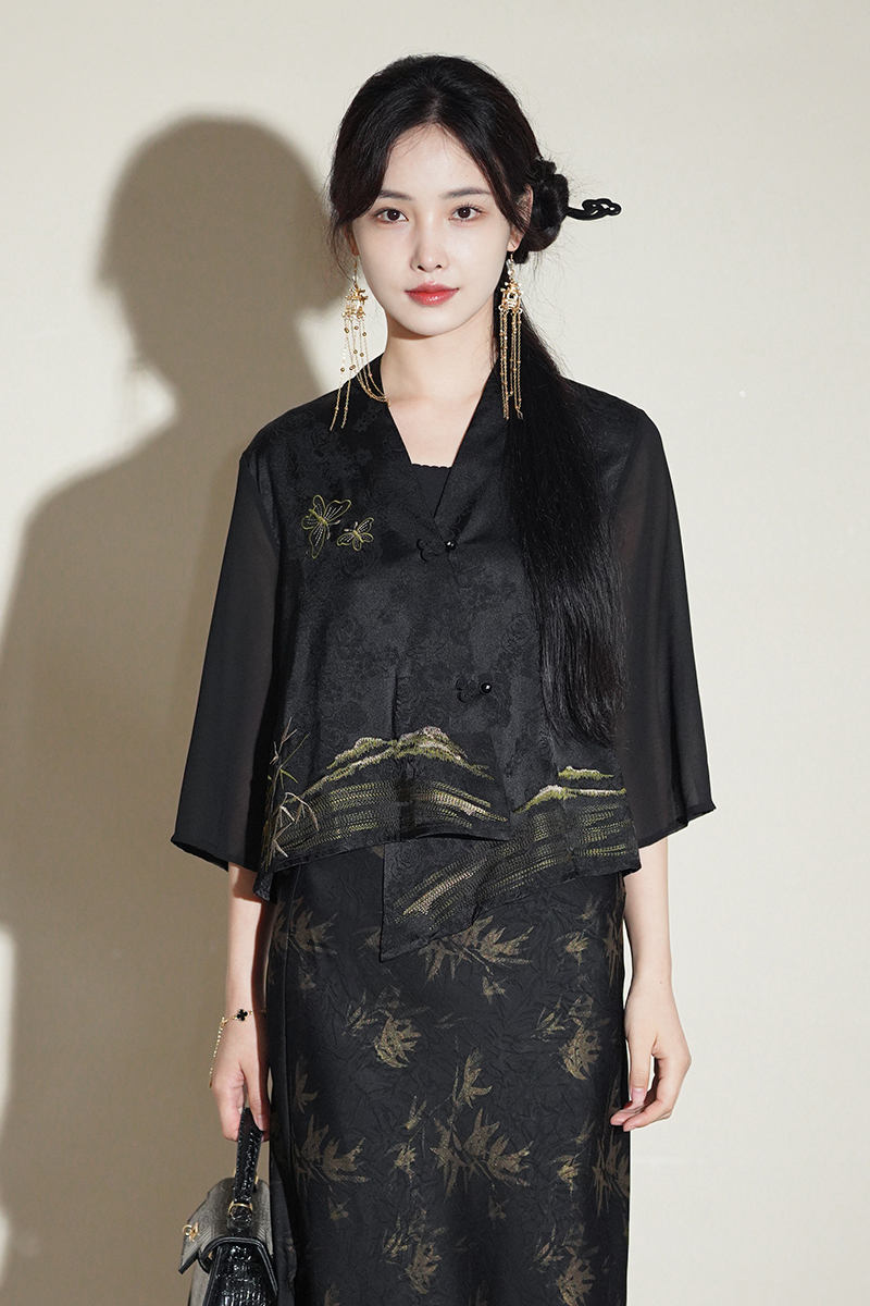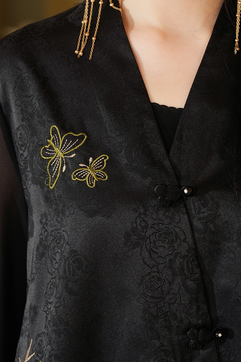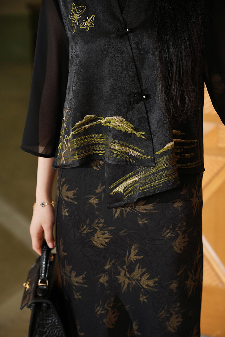 衣身图案选自蝴蝶、竹子、远山、河流。整件衣服选自黑色,衣摆最下方是水流,水流一边是竹林,对岸是重重远山,整件衣服的亮点就是胸前的一对蝴蝶,山水间翩翩起舞,给整件衣服增加了灵动性。