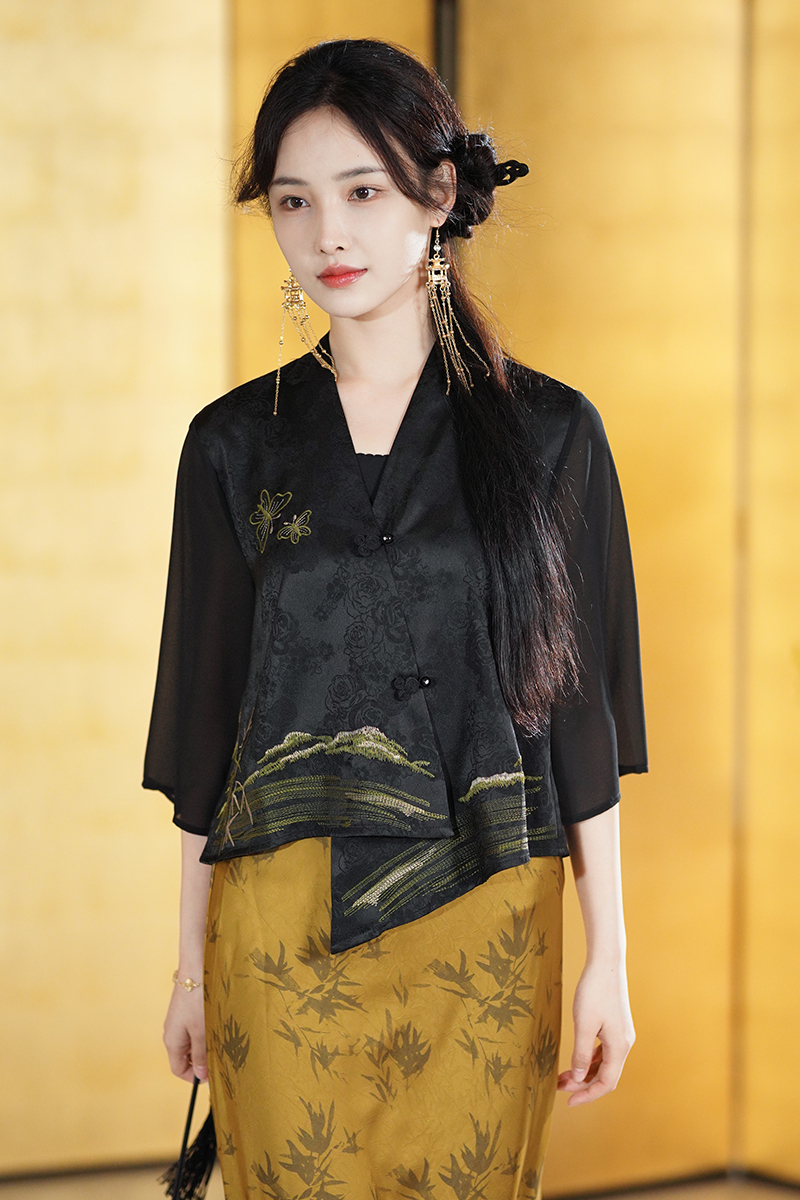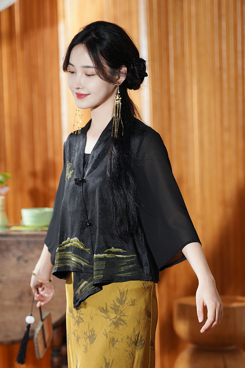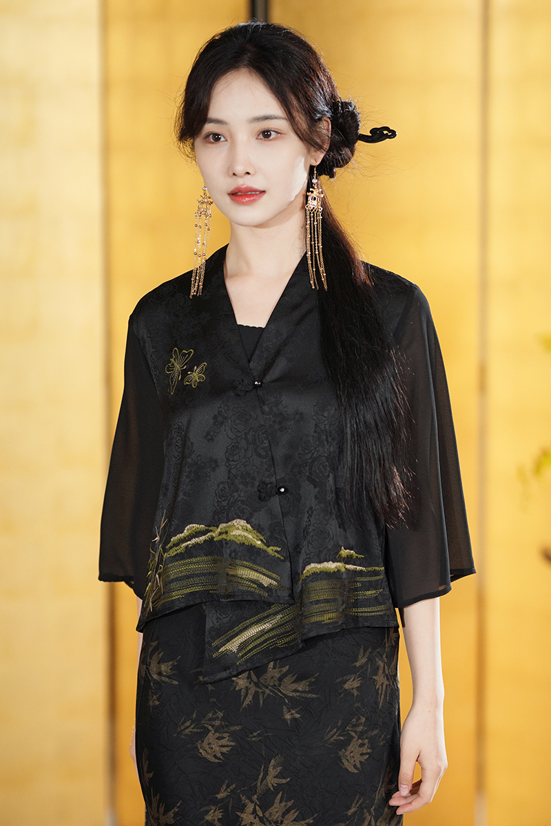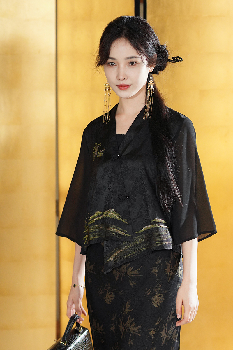 衣身图案选自蝴蝶、竹子、远山、河流。整件衣服选自黑色,衣摆最下方是水流,水流一边是竹林,对岸是重重远山,整件衣服的亮点就是胸前的一对蝴蝶,山水间翩翩起舞,给整件衣服增加了灵动性。