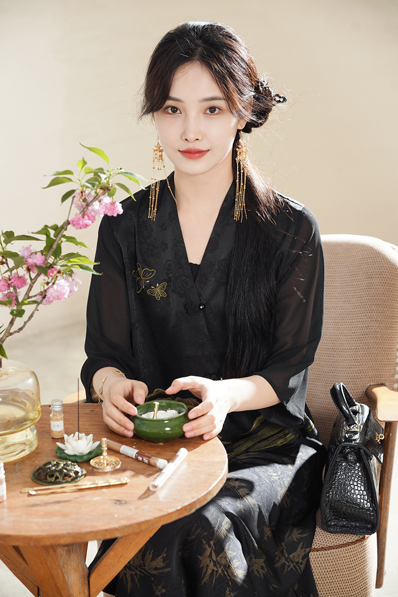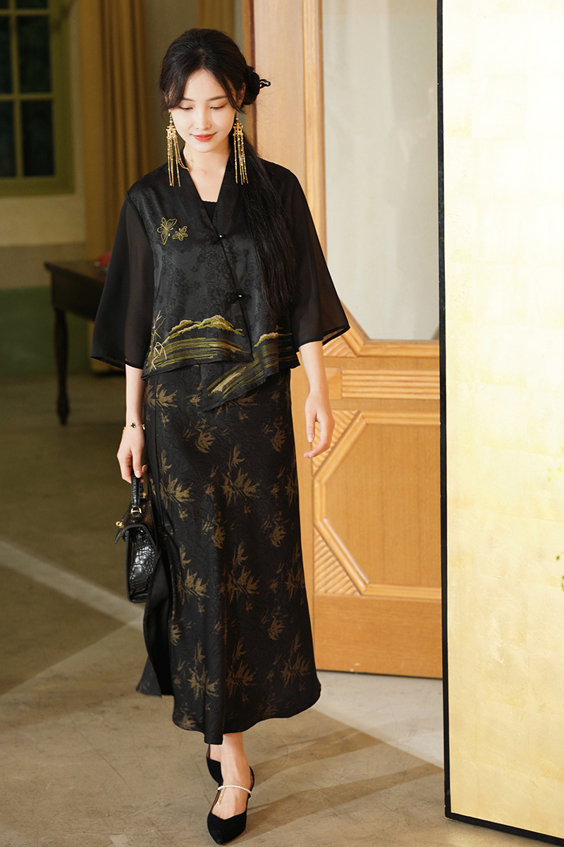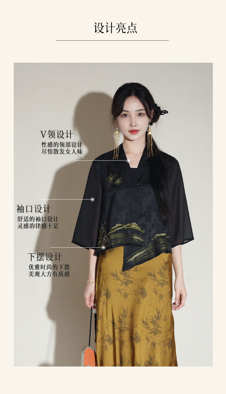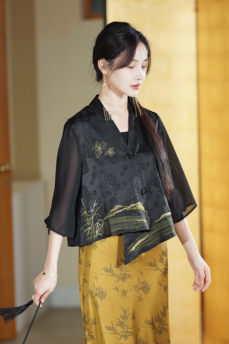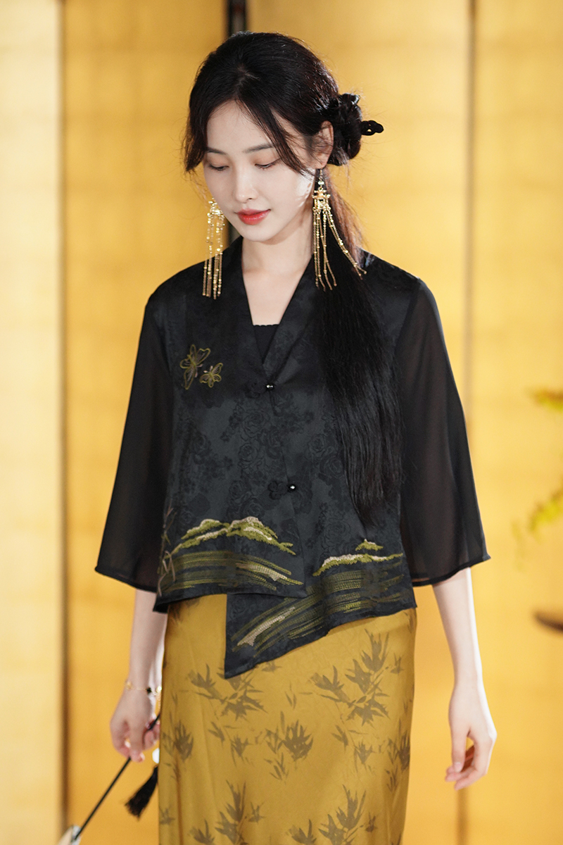 衣身图案选自蝴蝶、竹子、远山、河流。整件衣服选自黑色,衣摆最下方是水流,水流一边是竹林,对岸是重重远山,整件衣服的亮点就是胸前的一对蝴蝶,山水间翩翩起舞,给整件衣服增加了灵动性。