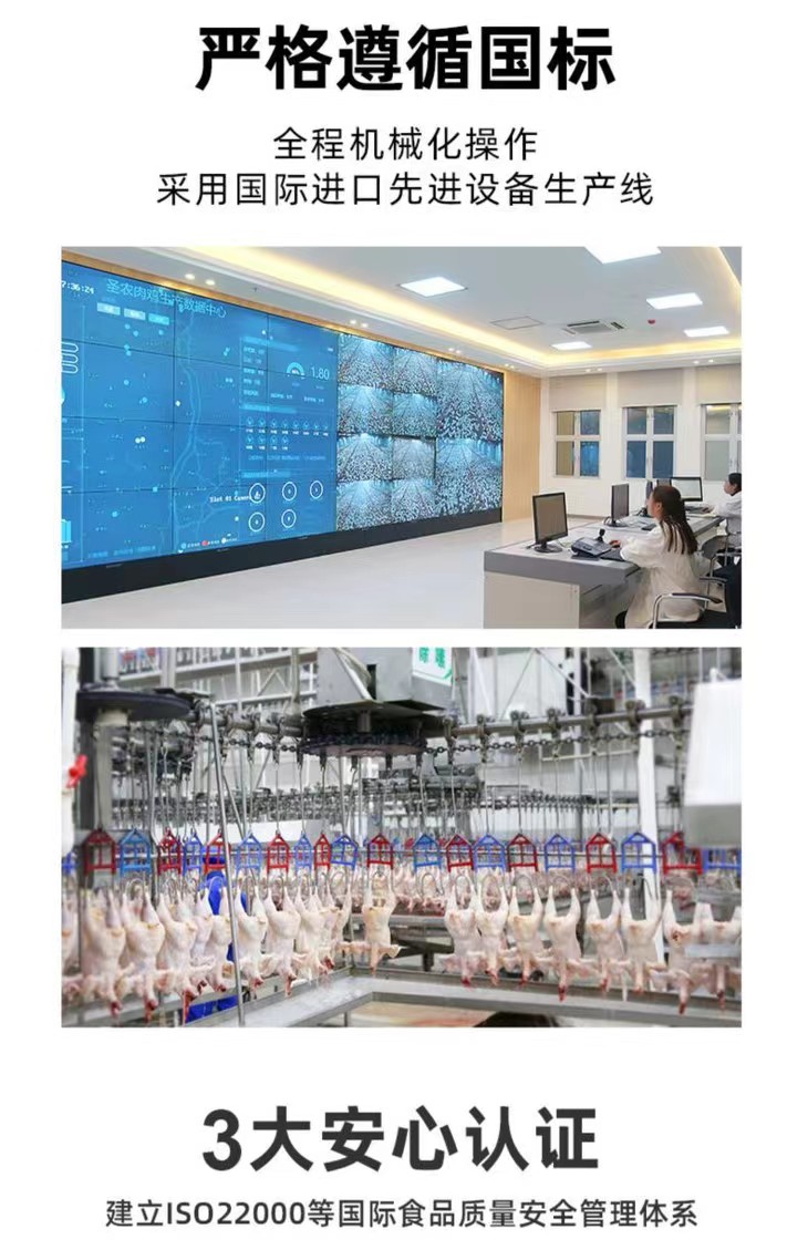 圣农专注白羽鸡生产三十余年,与国内养鸡行业普遍采用的“公司+农户”的经营模式不同,圣农从一开始就坚持“自繁、自养、自宰”全进全出的全产业链生产模式,所有饲料厂、祖代父母代种鸡场、孵化厂、商品代肉鸡场、宰杀厂均为公司自有,并建立了完善的食品安全追溯体系,细化到每一批乃至每一只羽鸡从种蛋到孵化、从饲料到养殖、从宰杀到加工的整个生产过程。其采用先进的遗传育种技术,使白羽鸡身材好,吃得少,长得快;饲料中都添加超过20种营养成分,绝不添加激素;同时,进出车辆都采用消毒的手段,隔绝病原体进入的可能,保证了白羽鸡的食用安全。