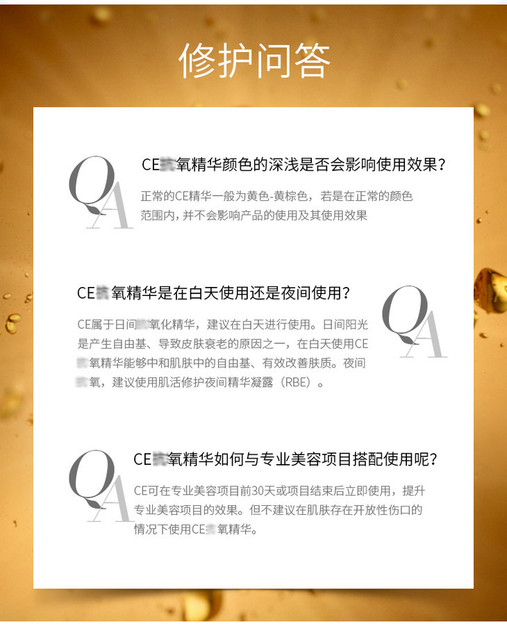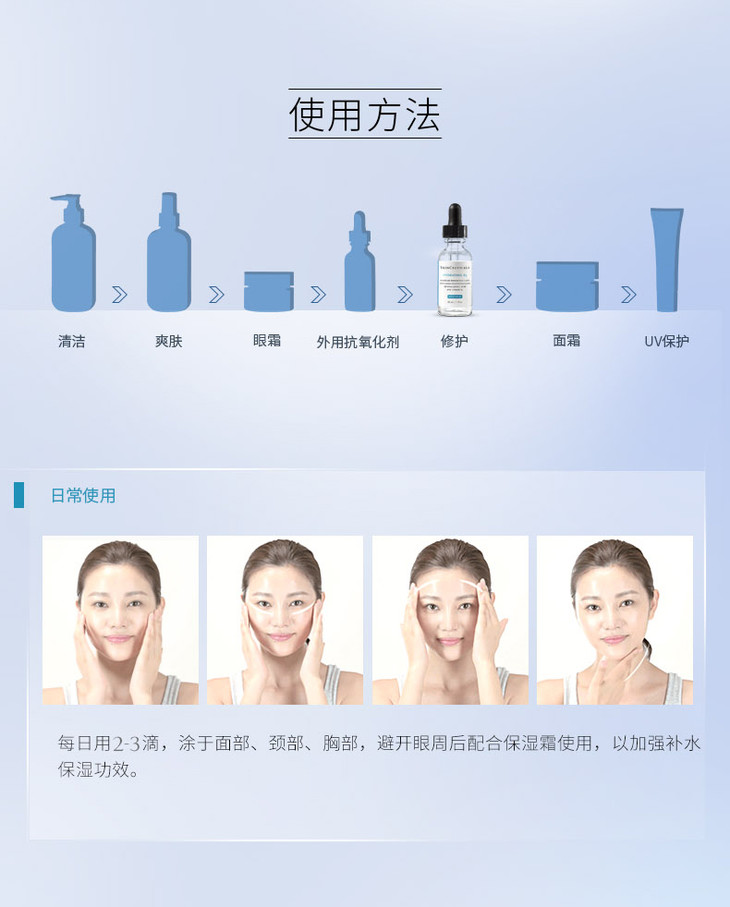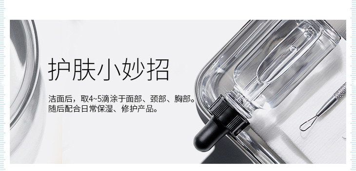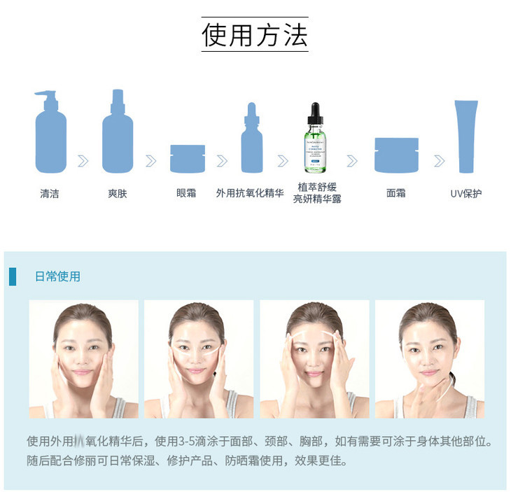 使用方法:早上洁面爽肤水后,使用3-4滴涂于面部及颈部,避开眼部,在使用其他护肤品,建议需搭配防晒霜一起使用。