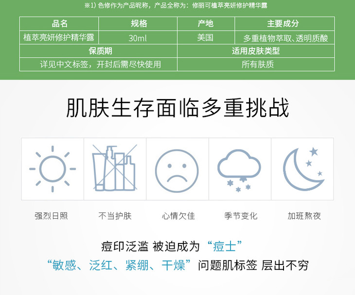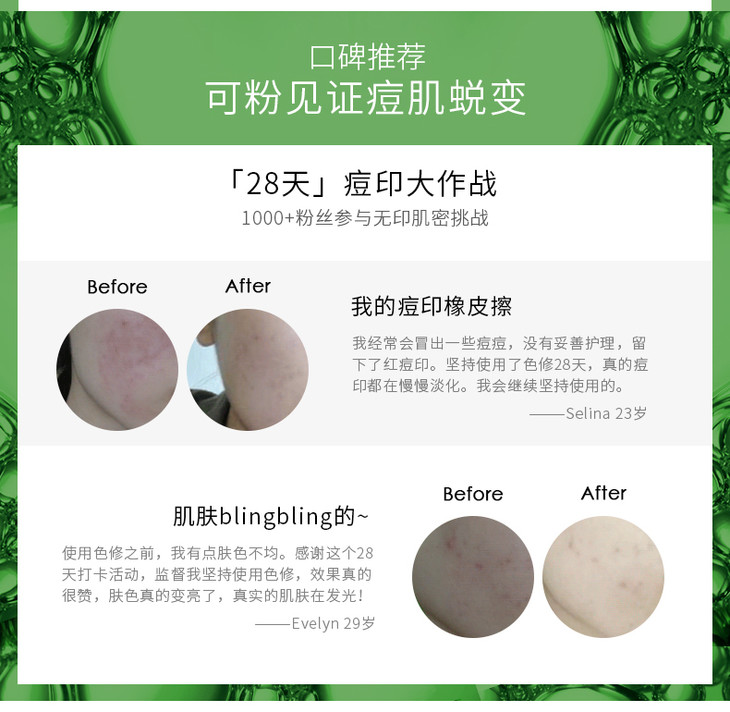 它家很受欢迎的色修。顾名思义就是修正肤色,也就是去巴去印。擦上脸之后有点黏黏的,哪怕感觉全部吸收后,也会有点小黏,不过第二天早上起床之后的气色效果是真的不错。对于老dou印,它没有立竿见影的效果,但是对新鲜刚刚好的痘痘来说,可以加速肖退,而且在均匀肤色上,是有效果的,同时也能够ti亮肤色。如果是dan化痘印,还可以配合【壹可的传明酸熊果苷烟酰胺原液】,同时做好保湿防晒,会更快速有效。