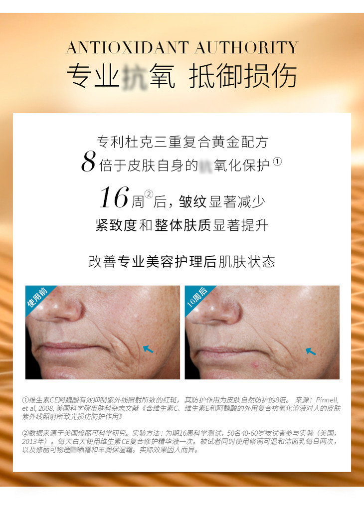- 15%左旋维生素C:中和自由JI,CU进胶原蛋白的合成。