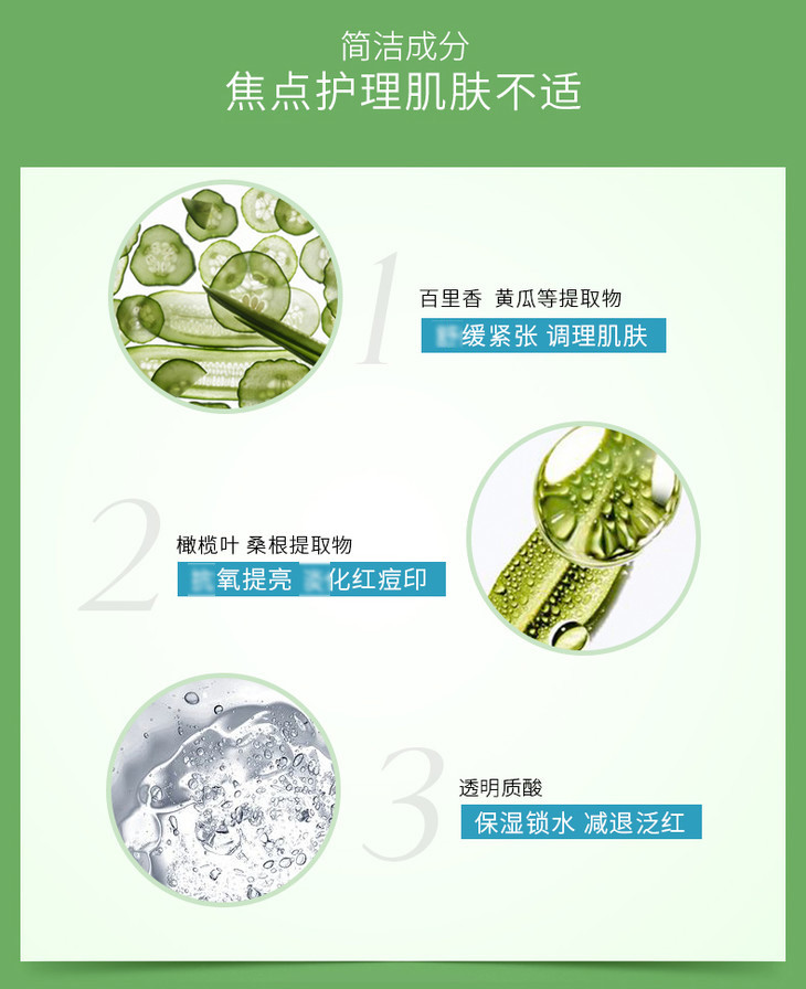 -黄瓜/百里香/萃取精华:抗焱、抗箘;舒缓并镇定发焱敏感肌肤;减少红肿、色素沉着