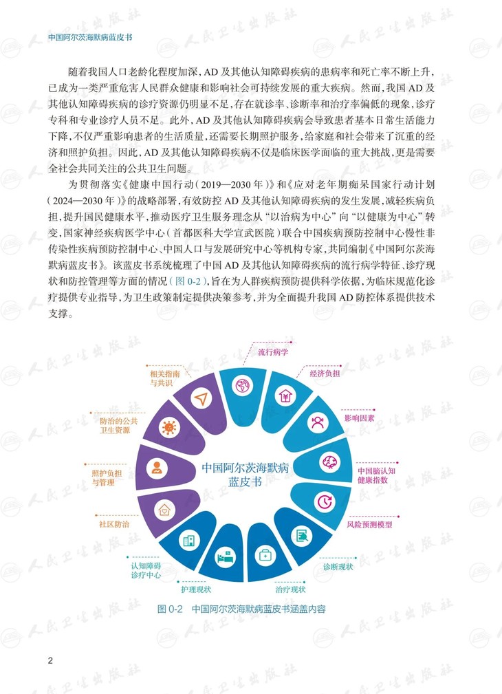 为贯彻落实《健康中国行动(2019-2030年)》和《应对老年期痴呆国家行动计划(2024-2030年)》的战略部署,有效防控AD及其他认知障碍疾病的发生发展,减轻疾病负担,提升国民健康水平,推动医疗卫生服务理念从“以治病为中心”向“以健康为中心”转变,国家神经疾病医学中心(宣武医院)联合中国疾病预防控制中心慢性非传染性疾病预防控制中心、国家卫生健康委能力建设和继续教育中心、中国人口与发展研究中心共同组织,神经内科、流行病学、人群防治、卫生经济学和卫生统计学等相关学科的30余名专家共同编写本书,旨在为我国阿尔茨海默病防治工作提供技术指导与权威评价,为政府制定相关政策与策略提供依据。