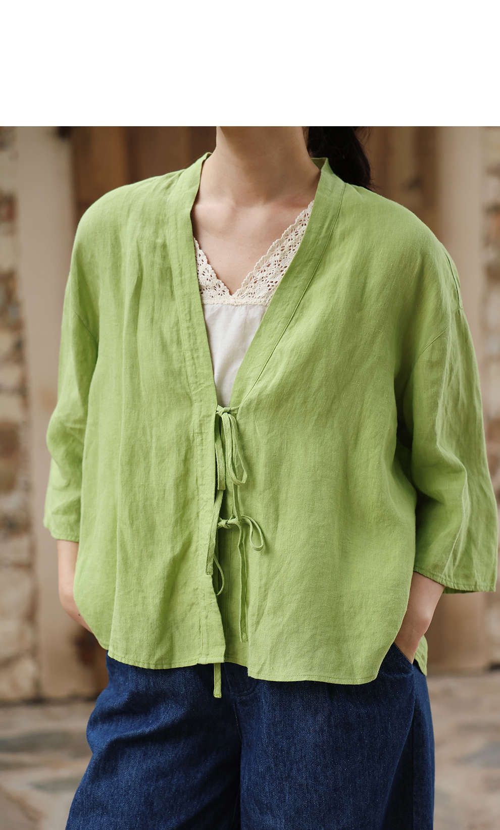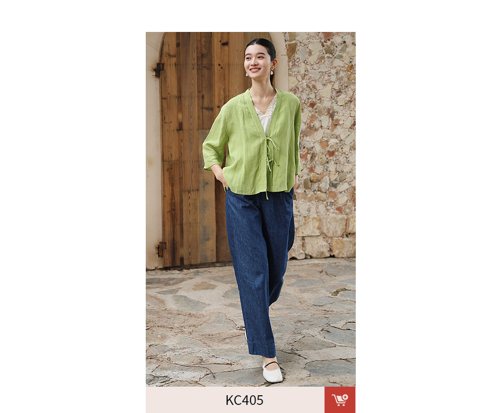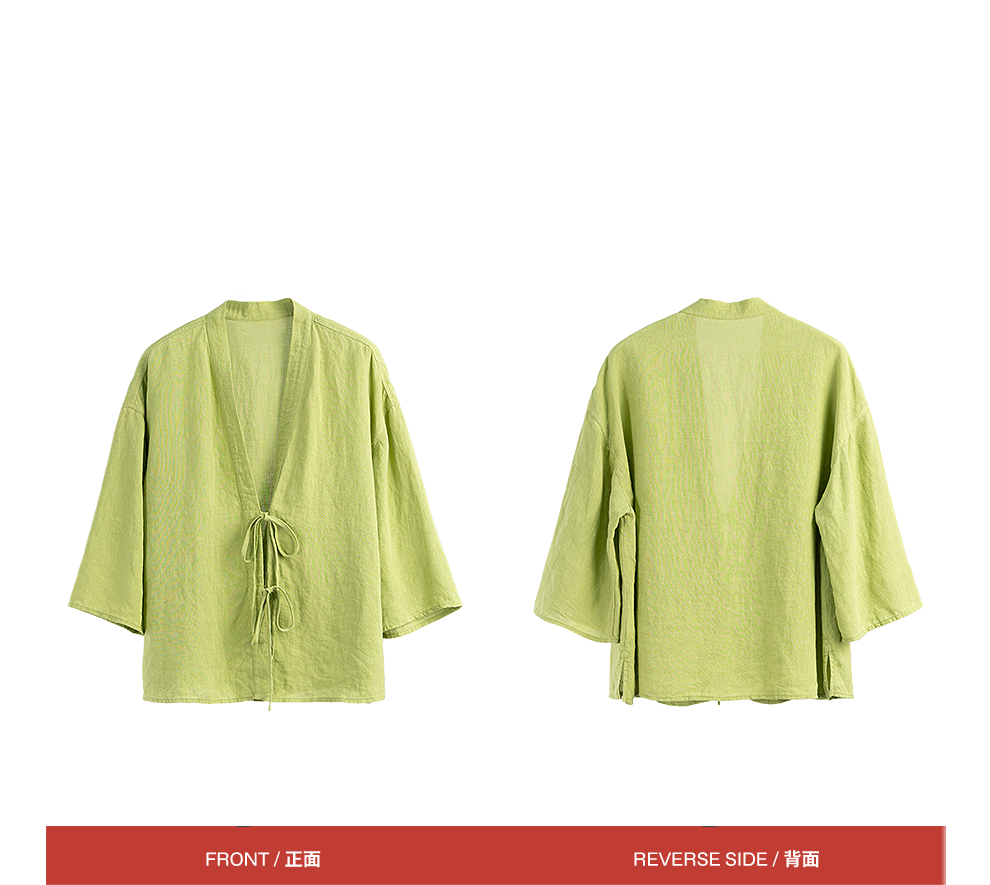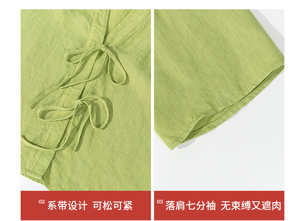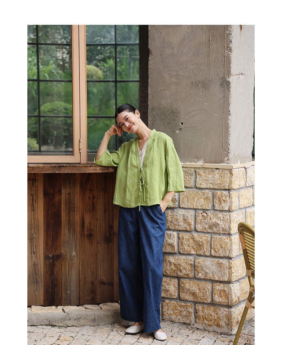 绽放女装399朵/【多巴胺系列】砂洗亚麻开襟系带七分袖短外套舒适