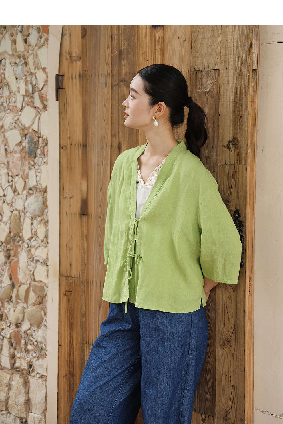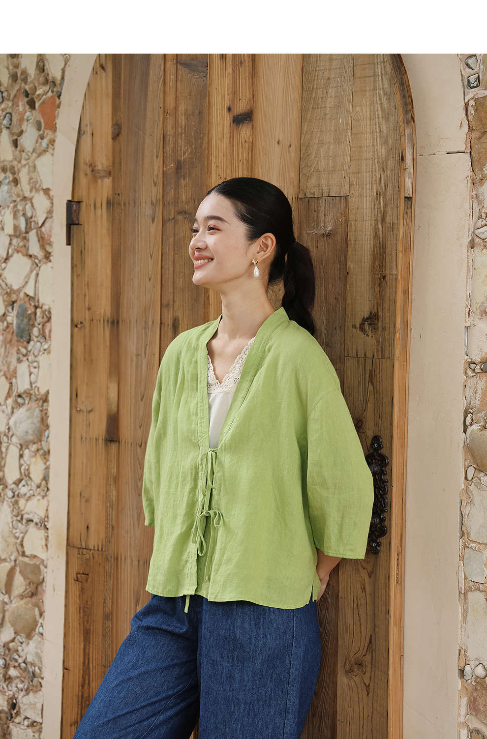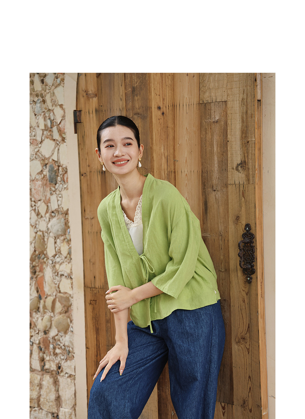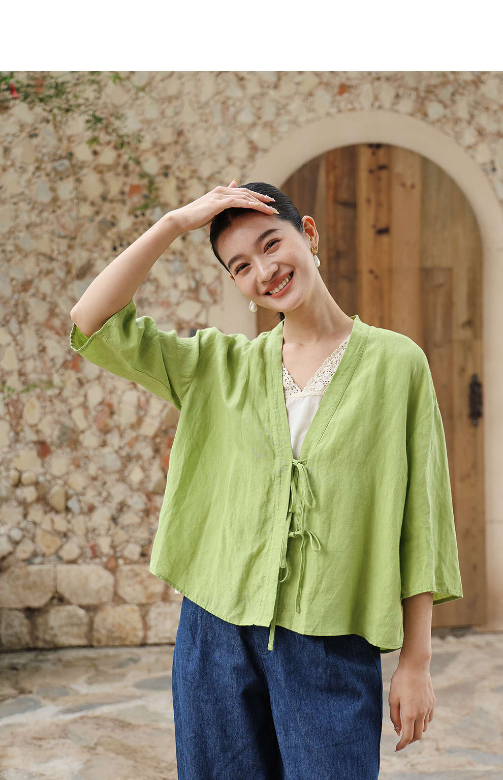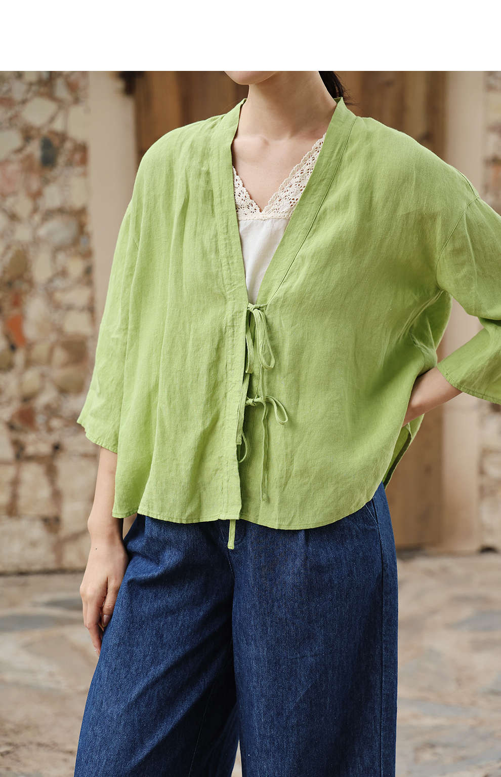 绽放女装399朵/【多巴胺系列】砂洗亚麻开襟系带七分袖短外套舒适